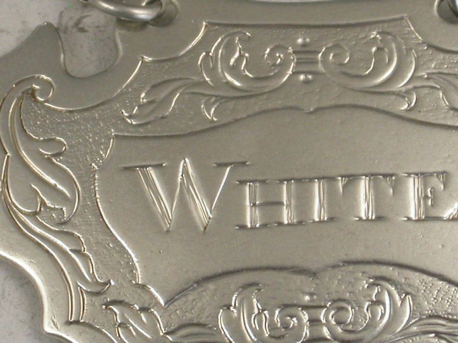 A rare Provincial silver Wine Label of engraved escutcheon form, the foliate scroll engraving on a matt background inside a wide plain border, incised for White.