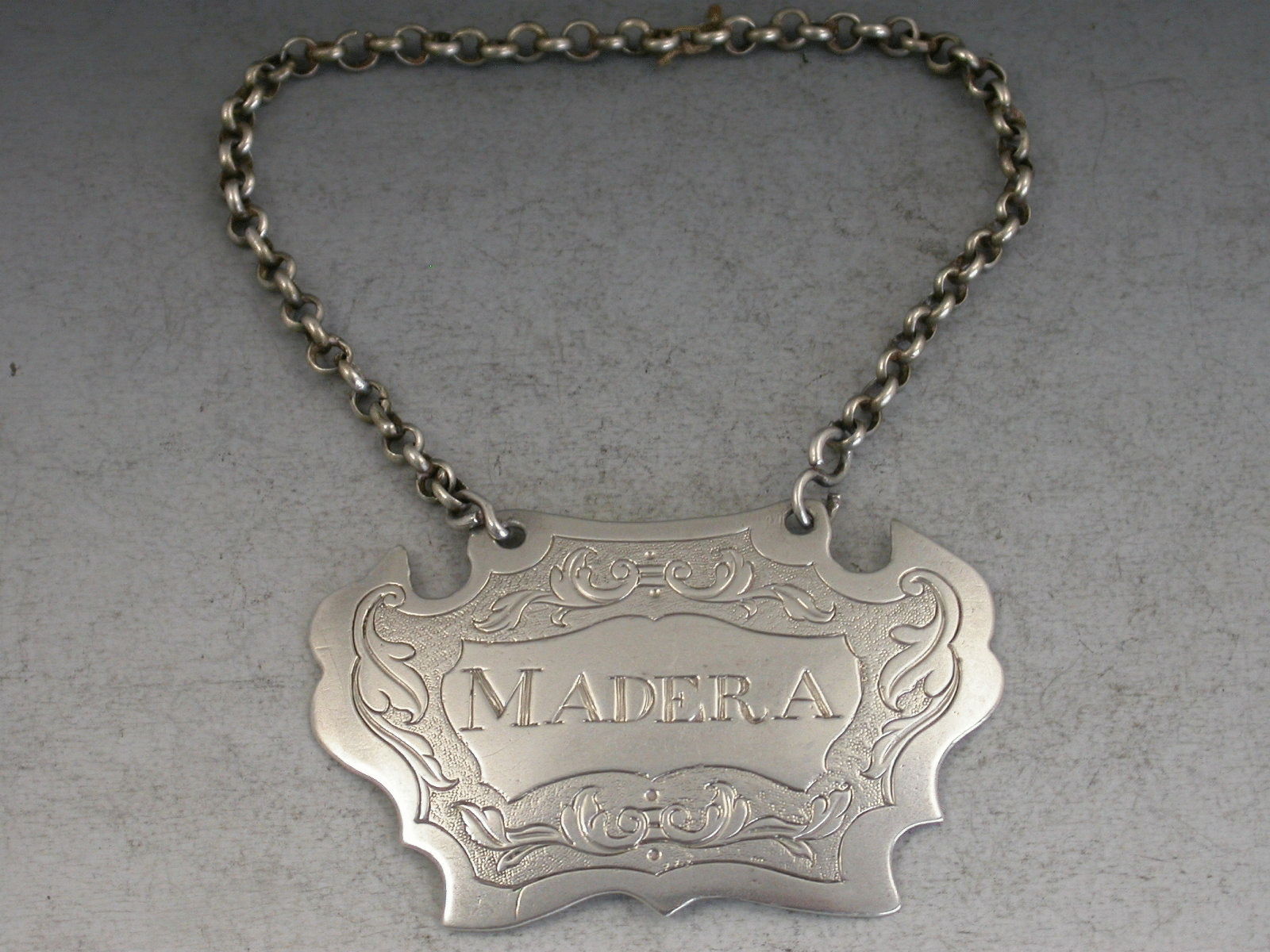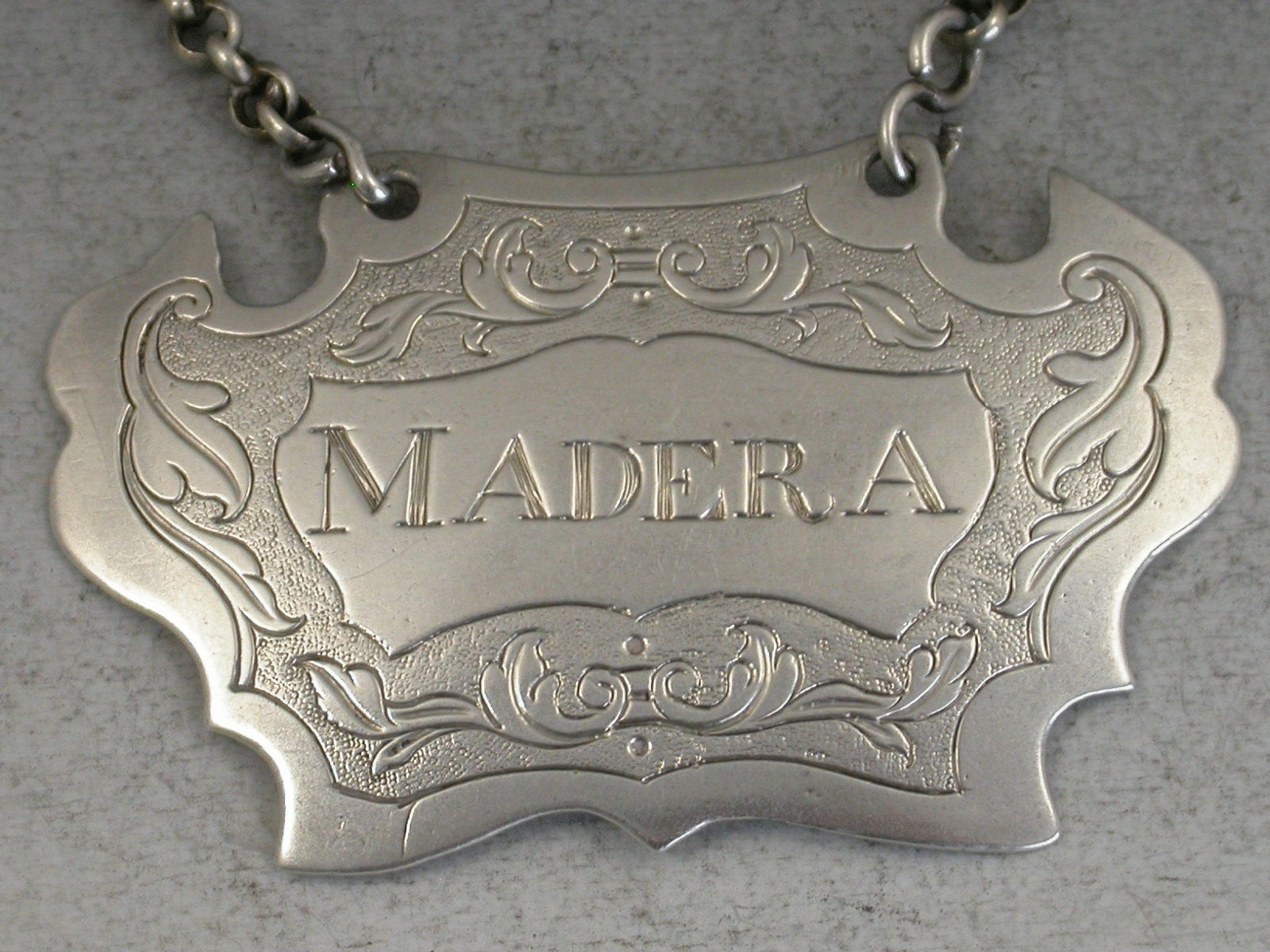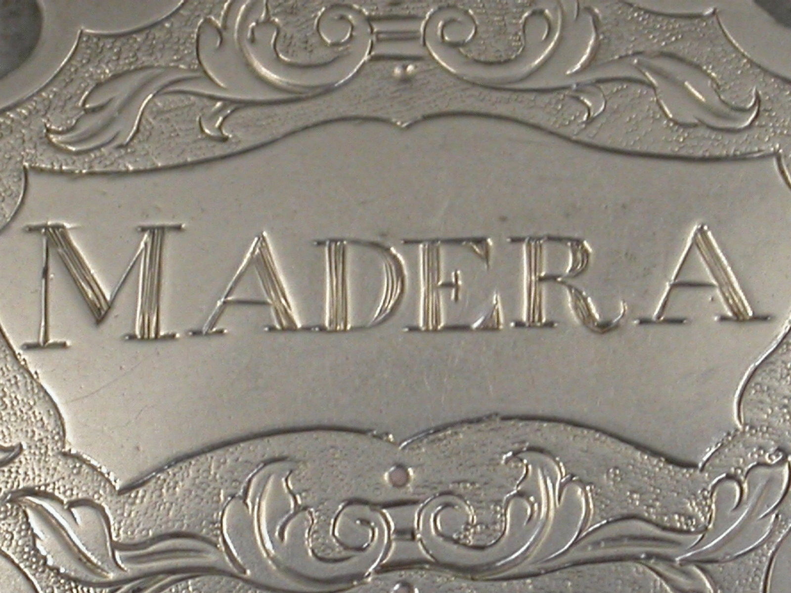 A rare Provincial silver Wine Label of engraved escutcheon form, the foliate scroll engraving on a matt background inside a wide plain border, incised for Madera. This misspelling of Madeira tends to appear on early wine labels.