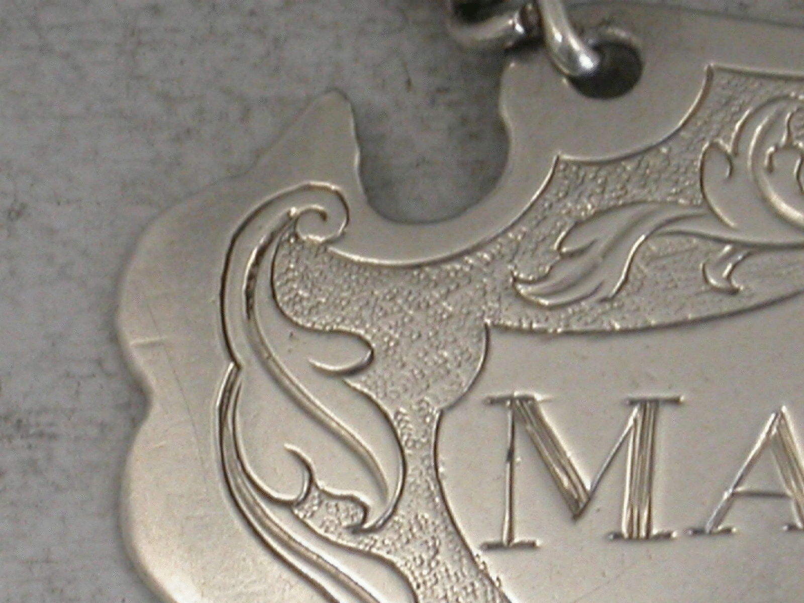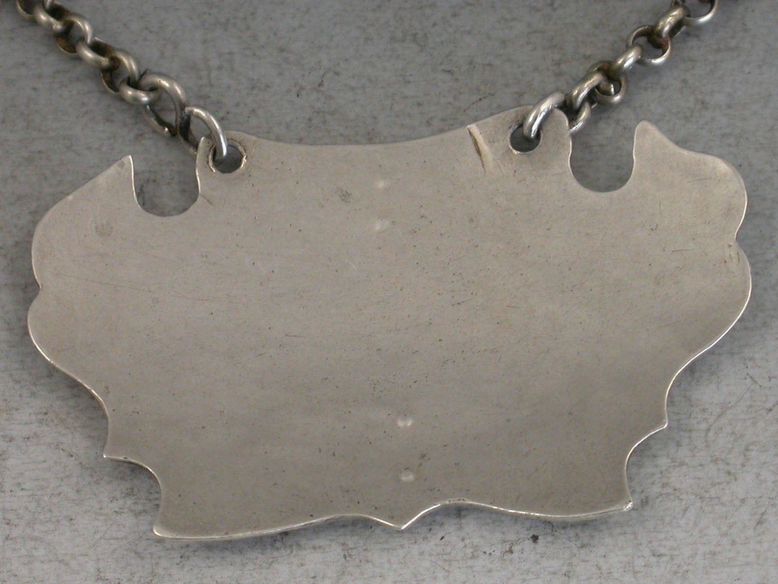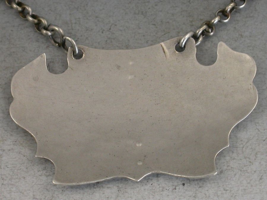 A rare Provincial silver Wine Label of engraved escutcheon form, the foliate scroll engraving on a matt background inside a wide plain border, incised for Madera. This misspelling of Madeira tends to appear on early wine labels.
