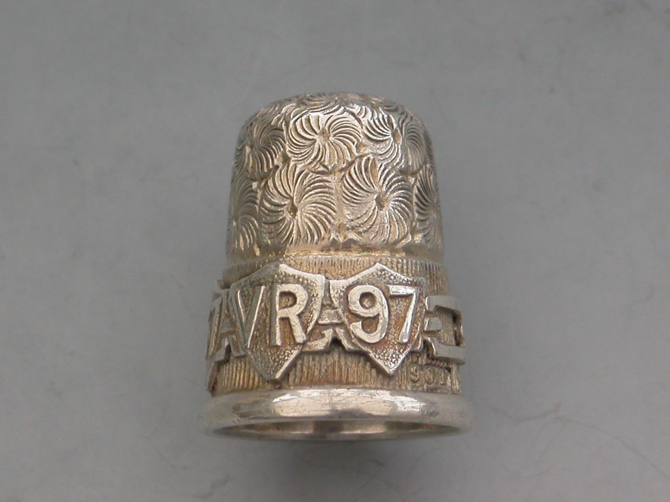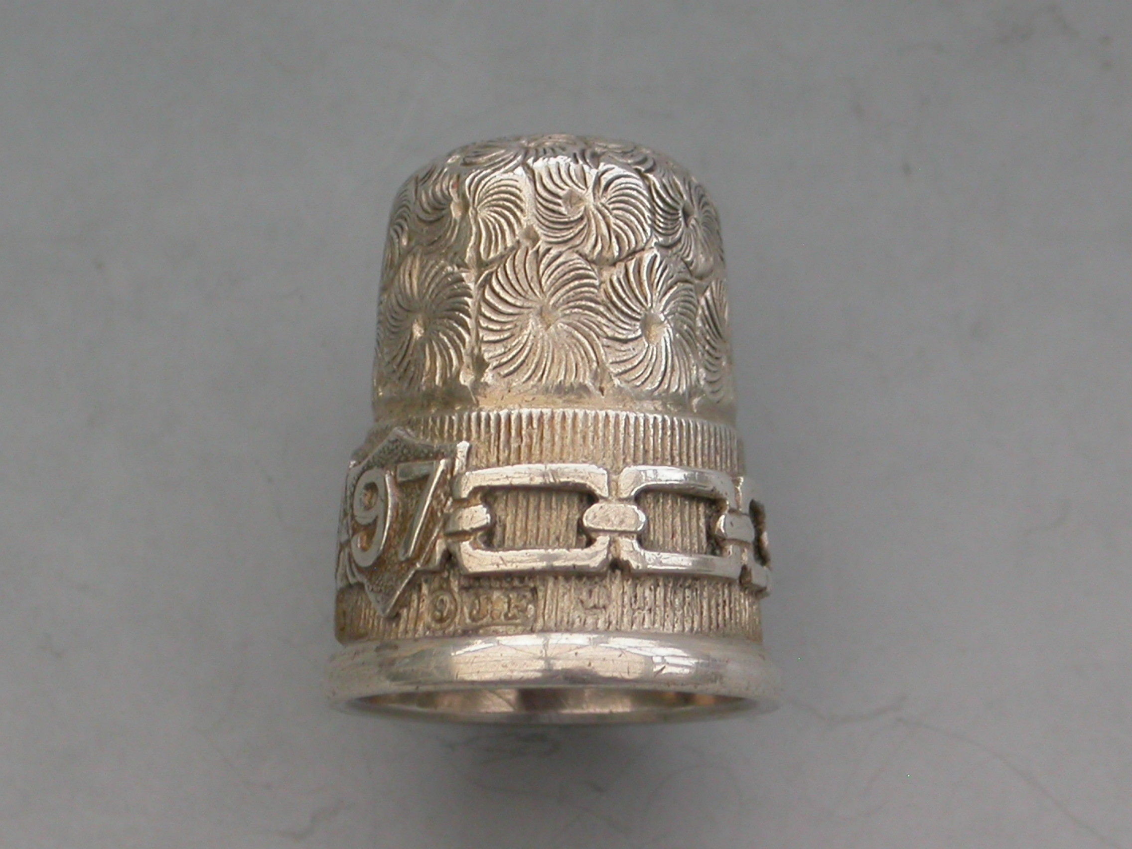 A Victorian silver Thimble made to Commemorate the Diamond Jubilee of Queen Victora (1837-1897) with a ribbed border decorated with applied linked chain with three shields containing '37', 'VR' & '97'. Chased flower heads to the body.