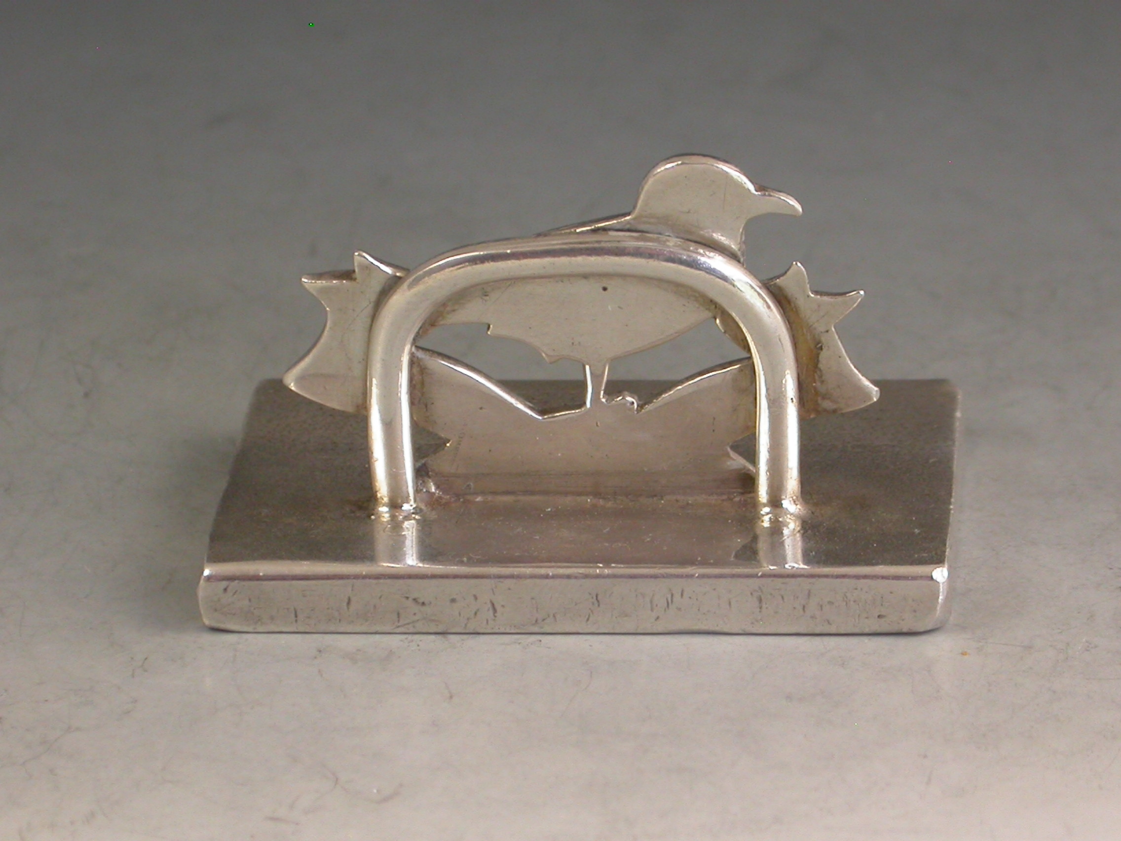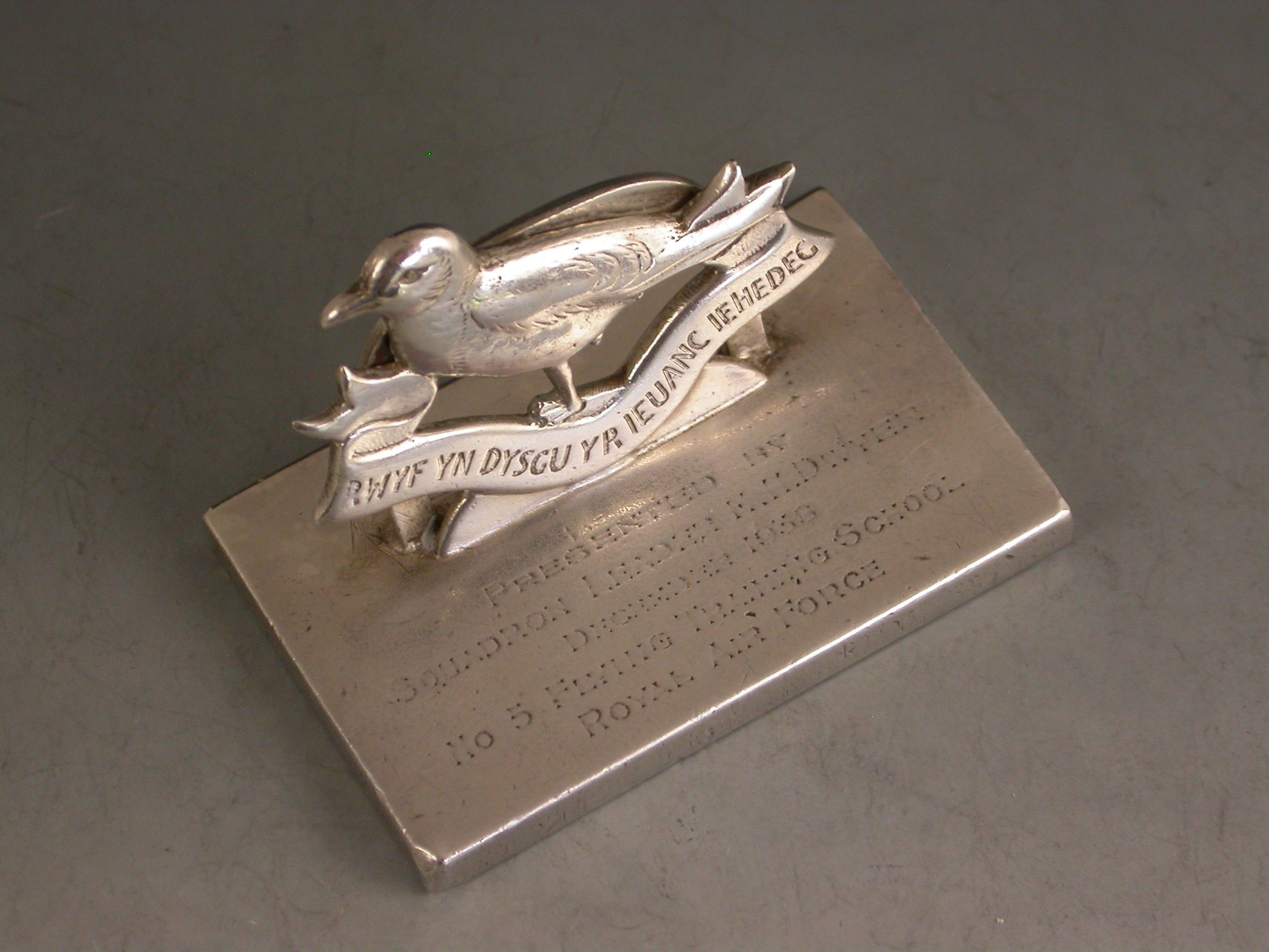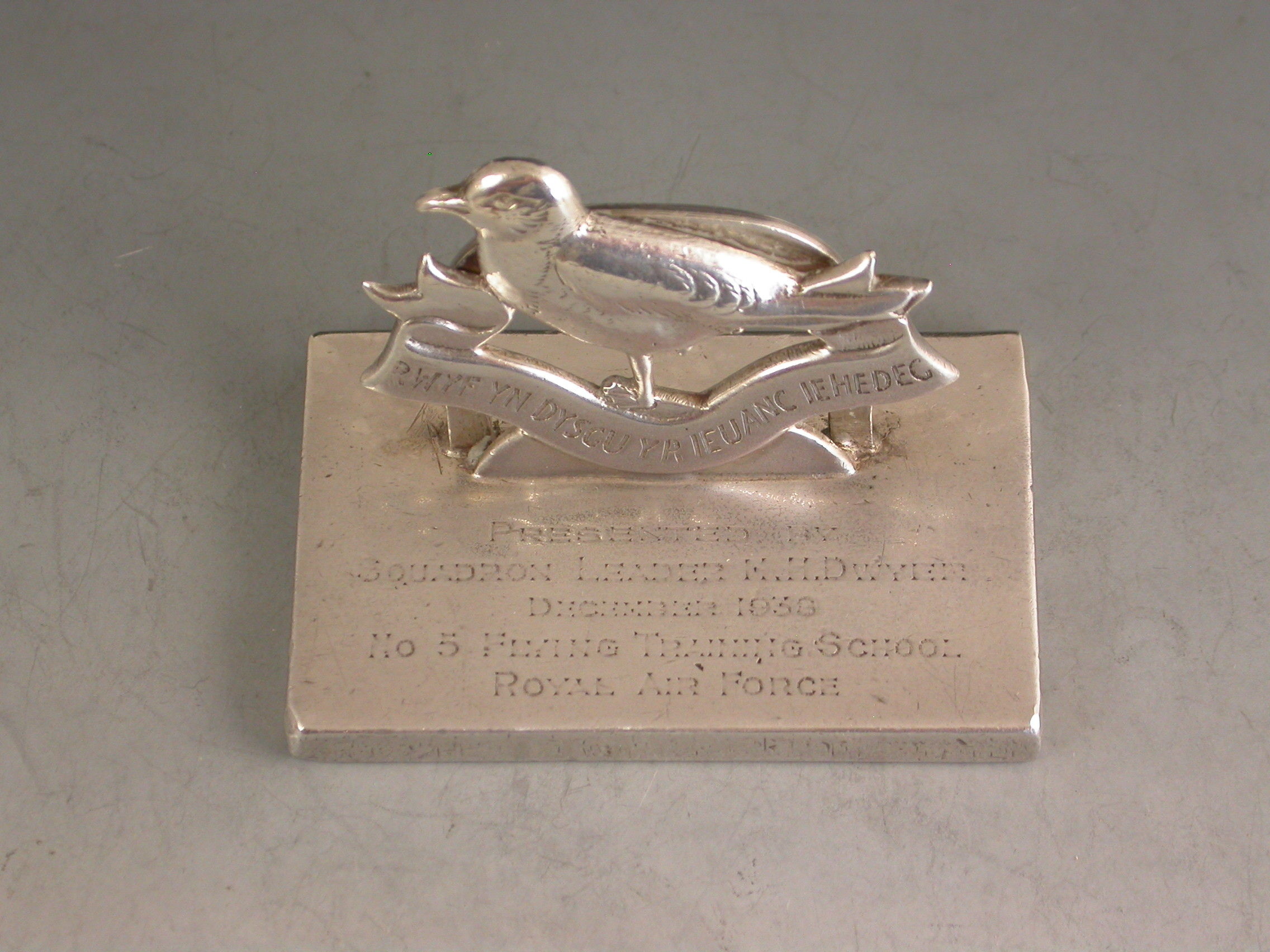 A good quality George VI heavy cast silver Menu Holder formed as the badge of the RAF No 5 Flying Training School, on a plain rectangular solid silver base engraved with a presentation inscription from Squadron Leader M.H Dwyer.