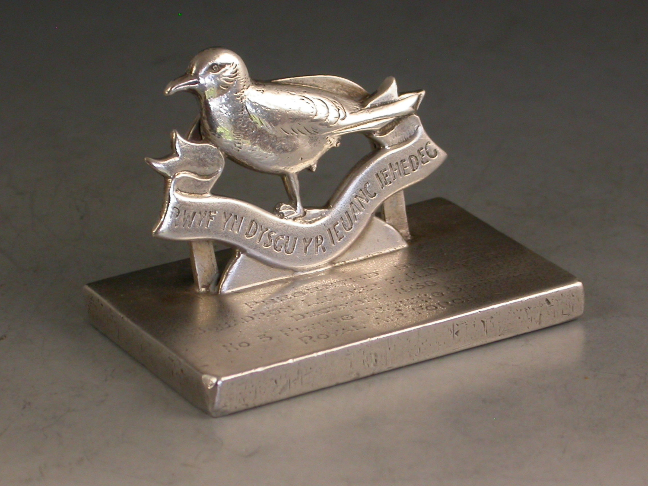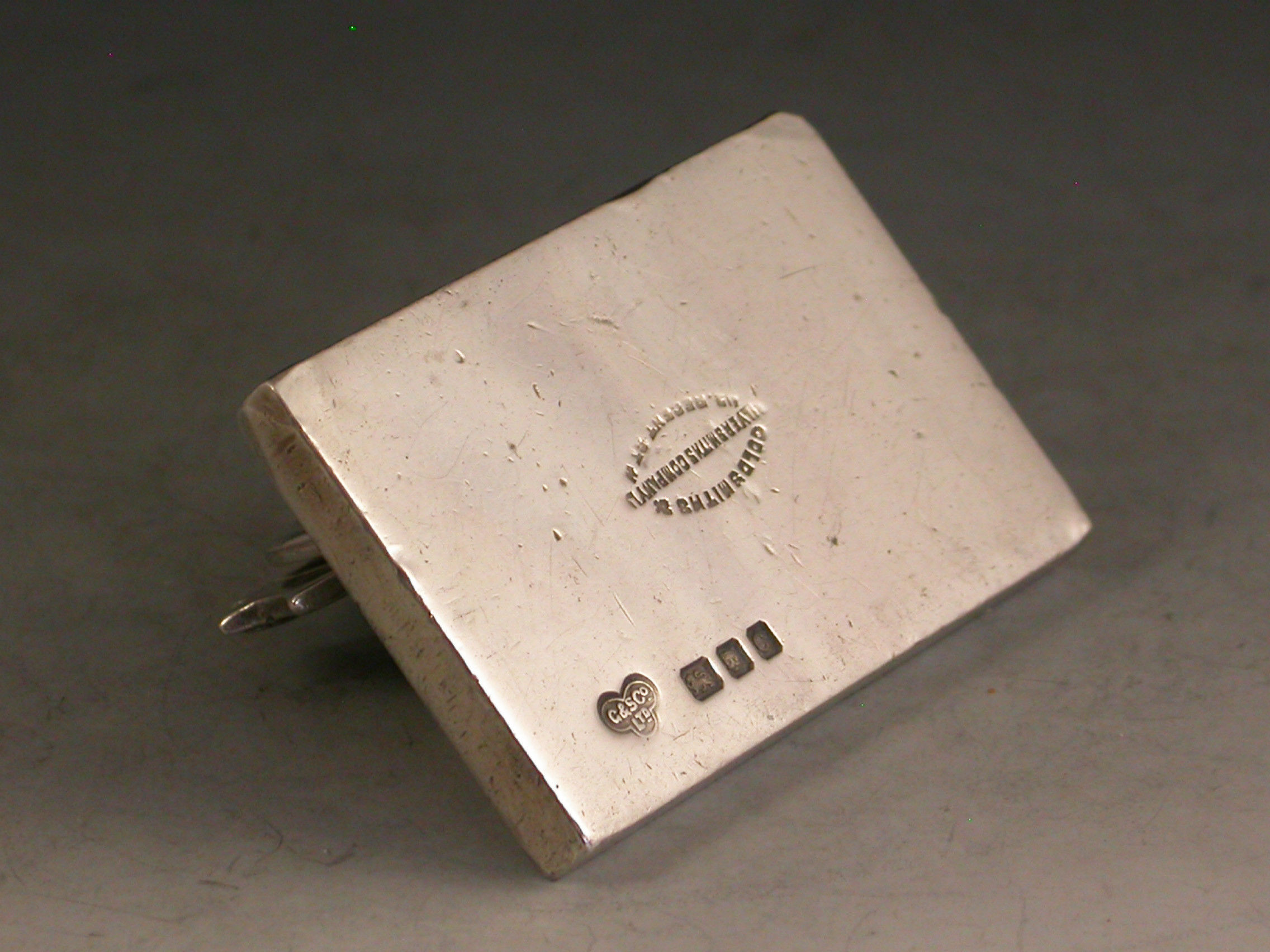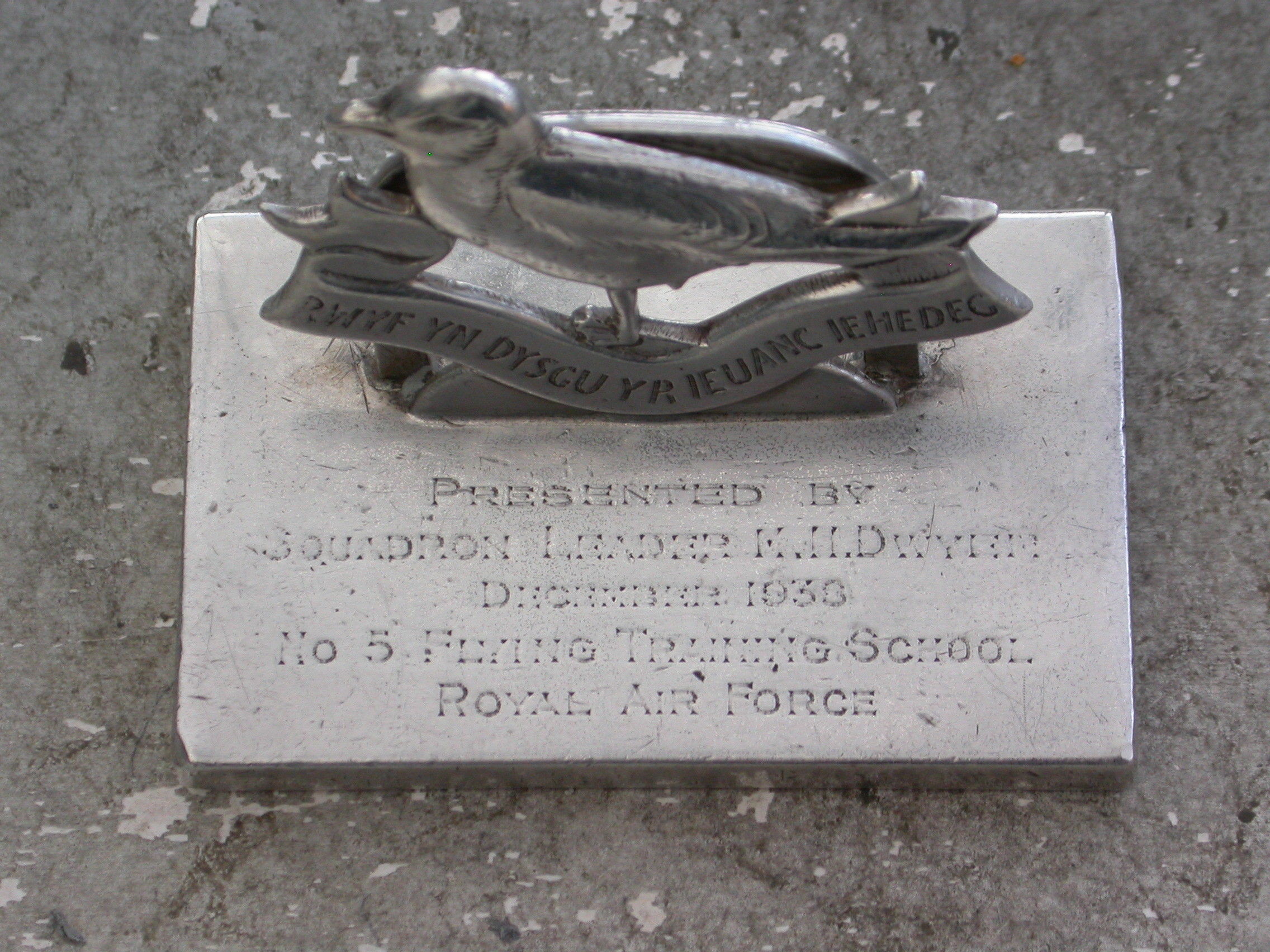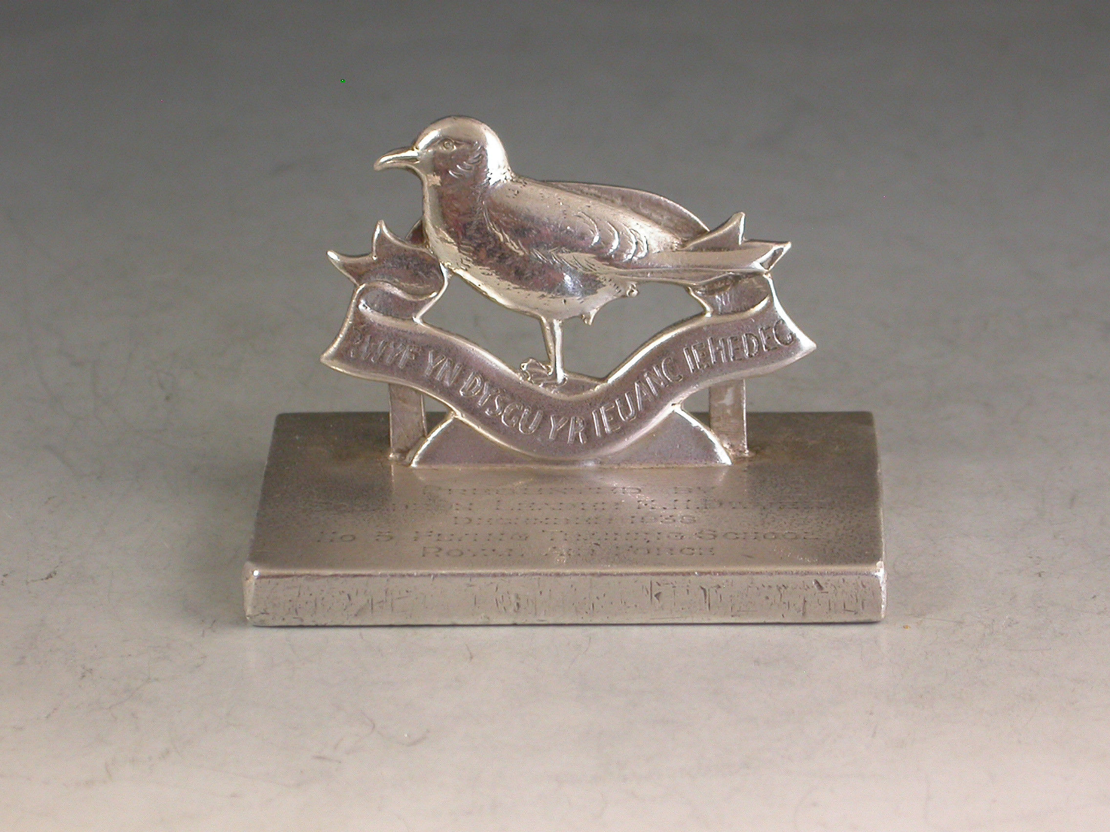 A good quality George VI heavy cast silver Menu Holder formed as the badge of the RAF No 5 Flying Training School, on a plain rectangular solid silver base engraved with a presentation inscription from Squadron Leader M.H Dwyer.