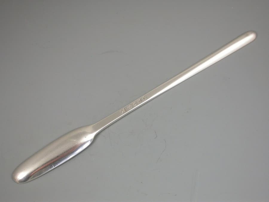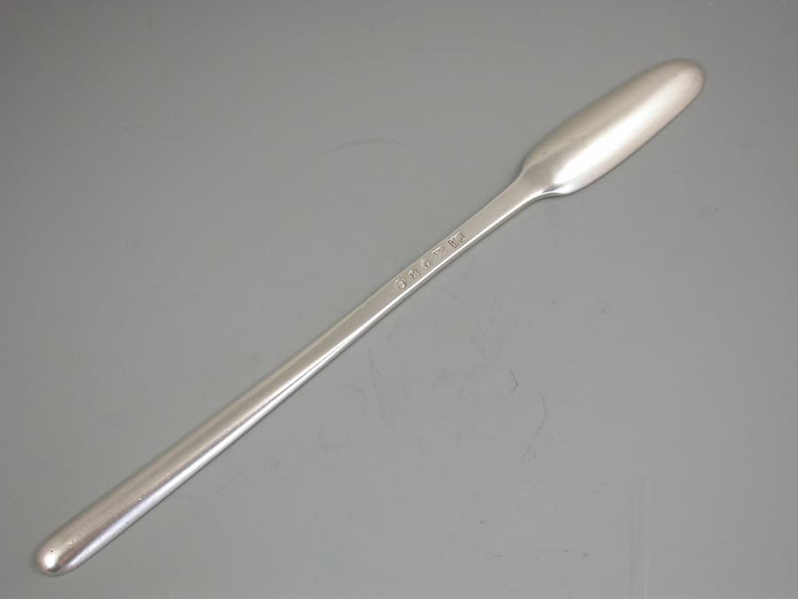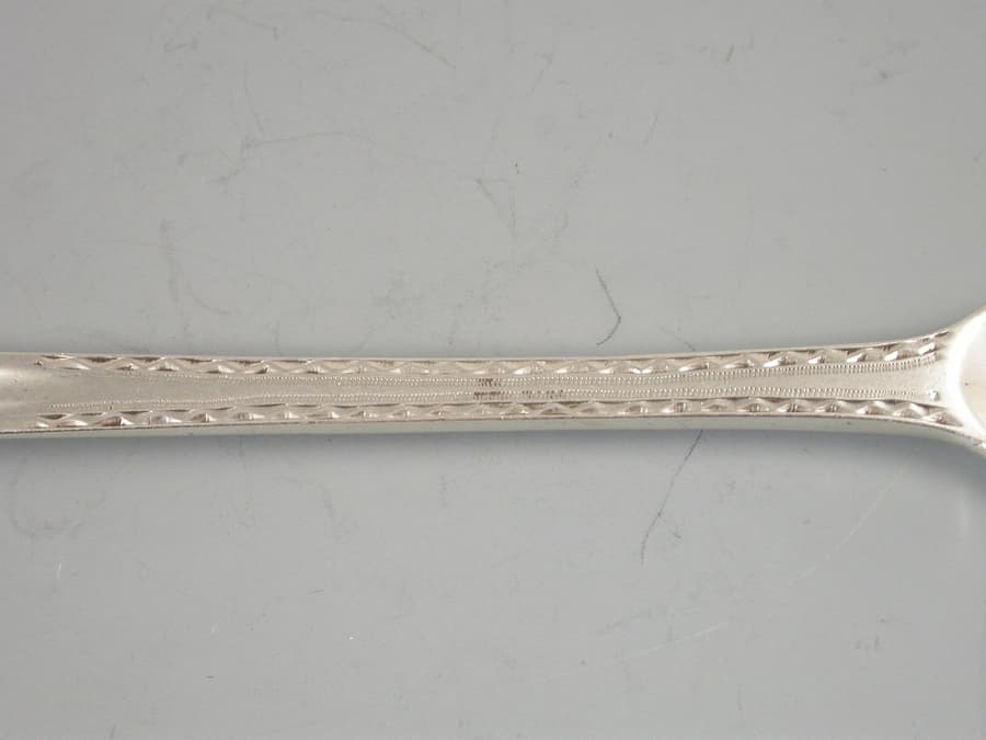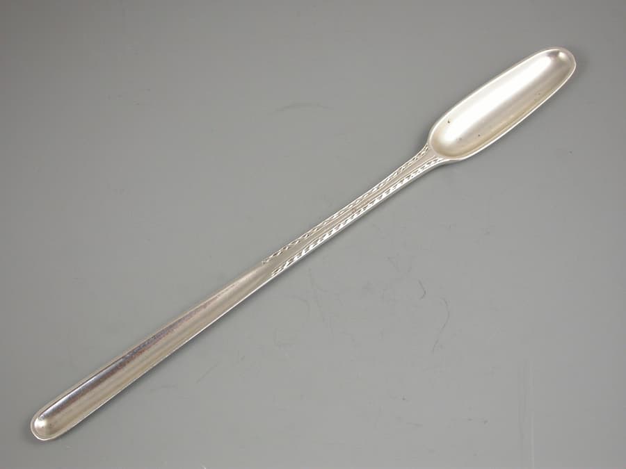 A rare 18th century Scottish silver Marrow Scoop of a distinctive design with a short large bowl, the stem superbly engraved with bright cut feather edge border.