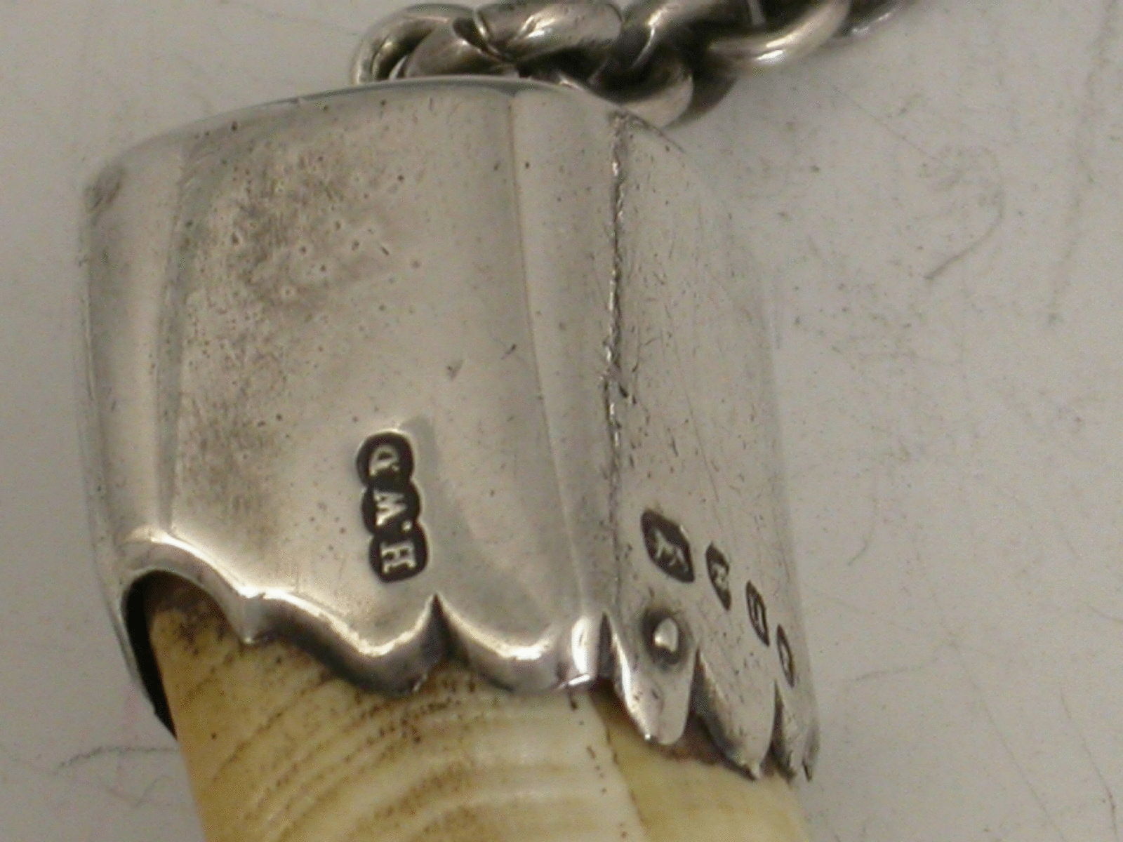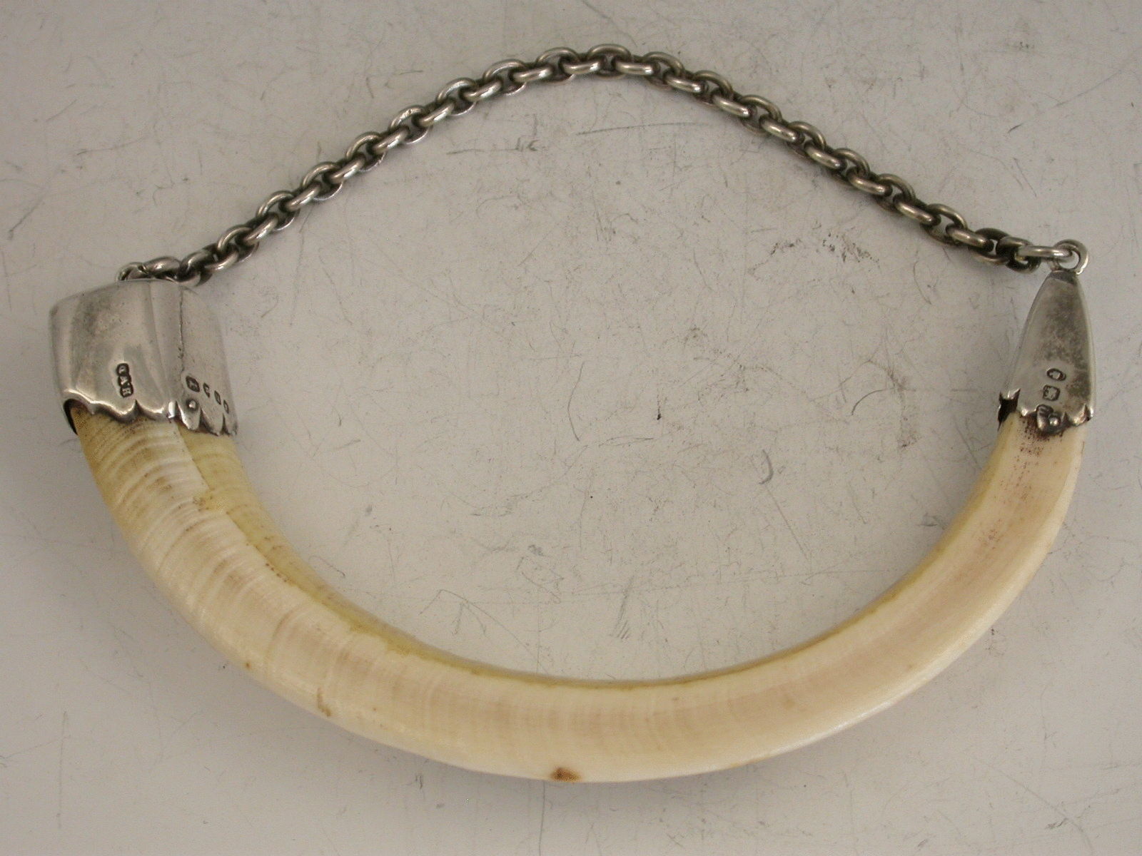 These mounted boars tusk wine labels were generally produced in India from the mid 19th century onwards. They are usually unmarked, but occasionally they can be found with Colonial marks and it is rare to see them with English hallmarks. This example is of a large size and produced by a respected English maker and would have been an expensive commission at the time.