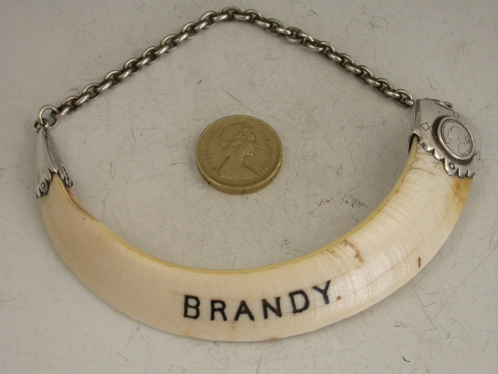 A rare antique English silver Wine Label formed from a large boars tusk, the hallmarked silver mounts set with a Victorian silver sixpence, the tusk engraved and niello filled for Brandy.