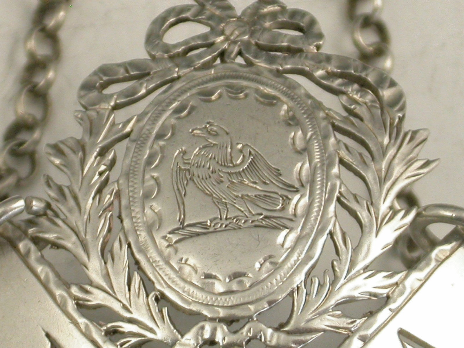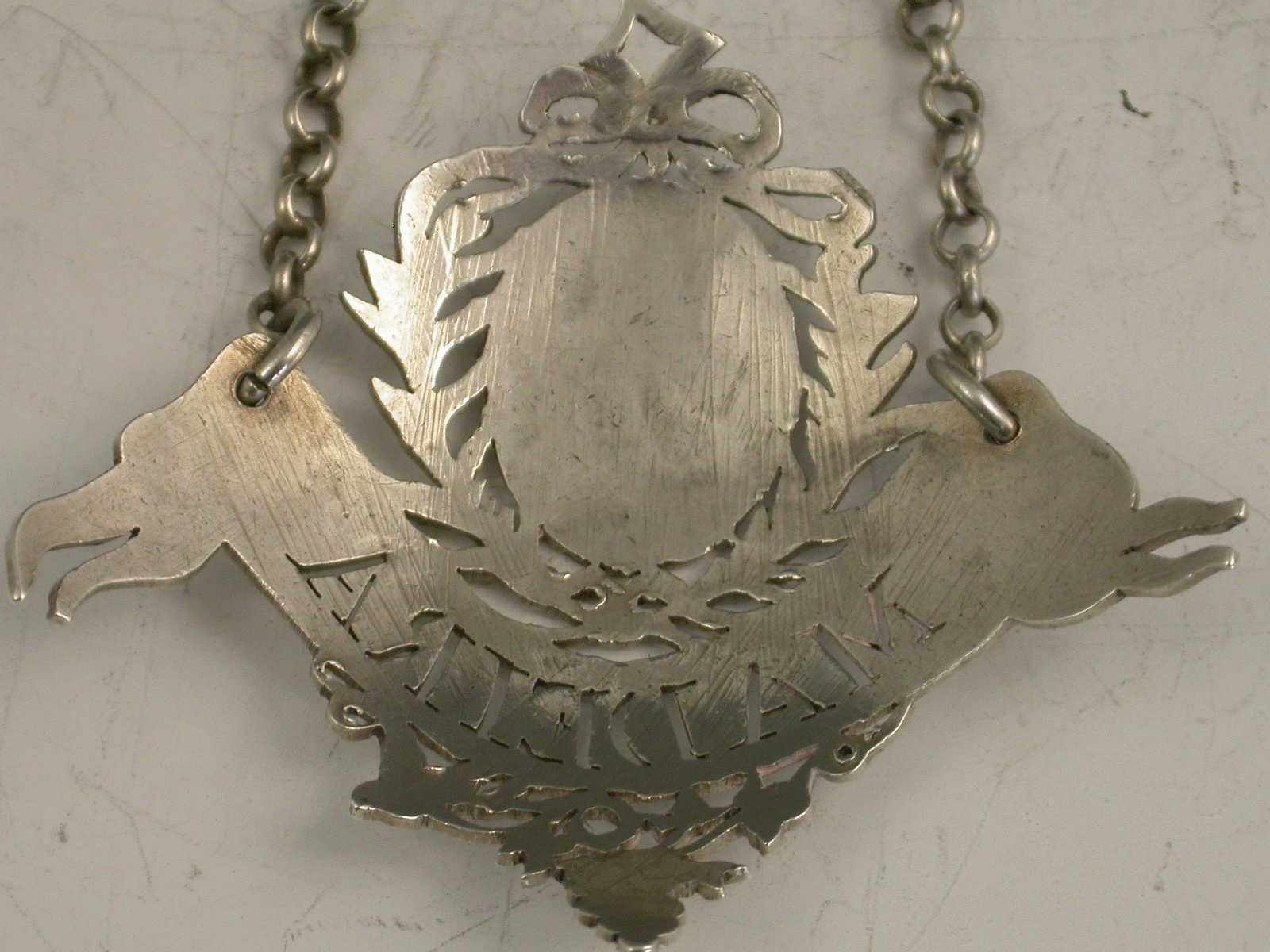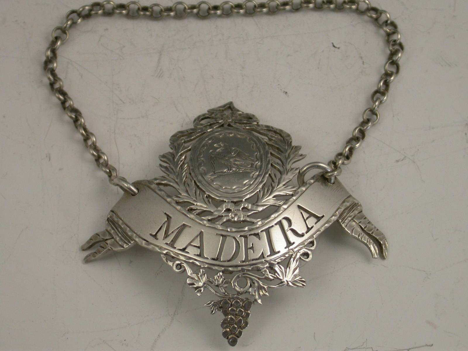 A rare 18th century silver Wine Label of banner form with pierced vine leaves and grapes below, an oval cartouche above surrounded by pierced out laurel branches with tied ribbon above, the name plate pierced for Madeira. The cartouche engraved with a crest of an eagle.