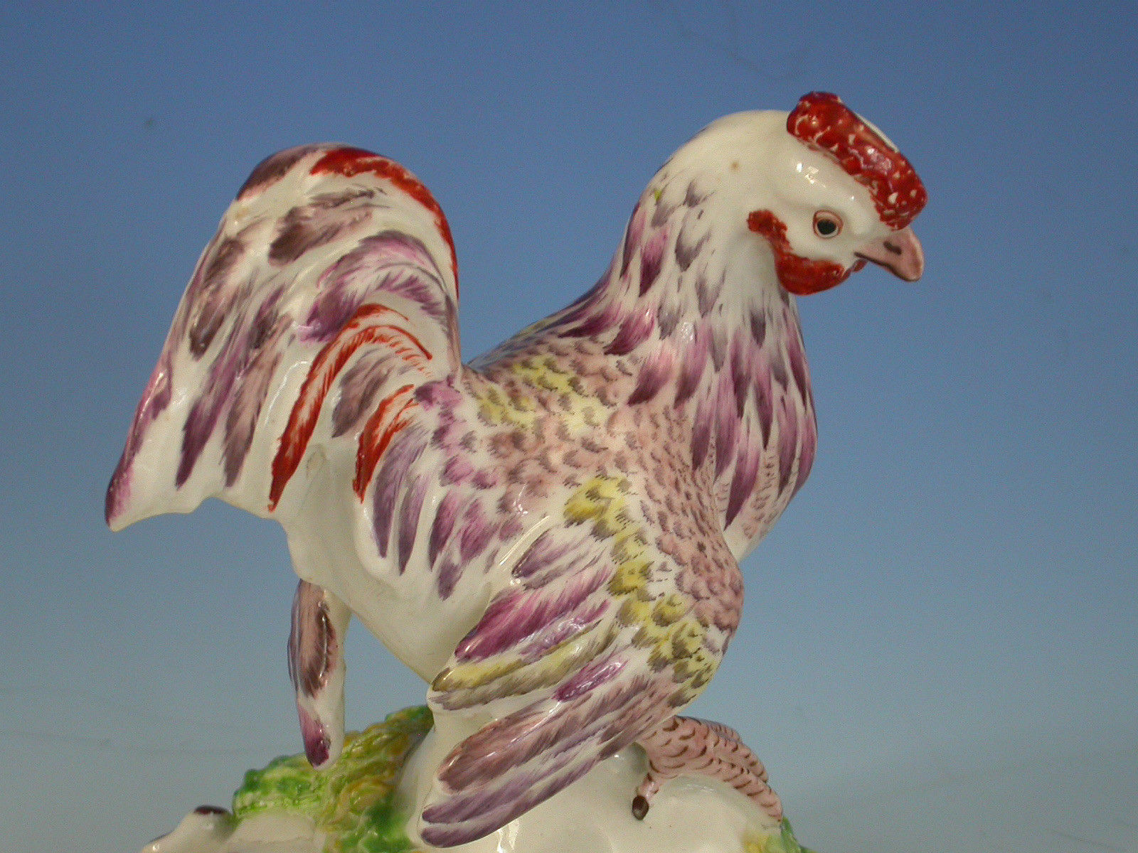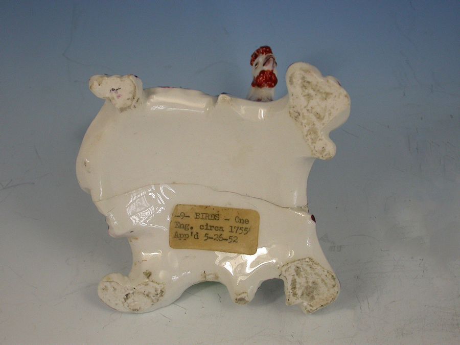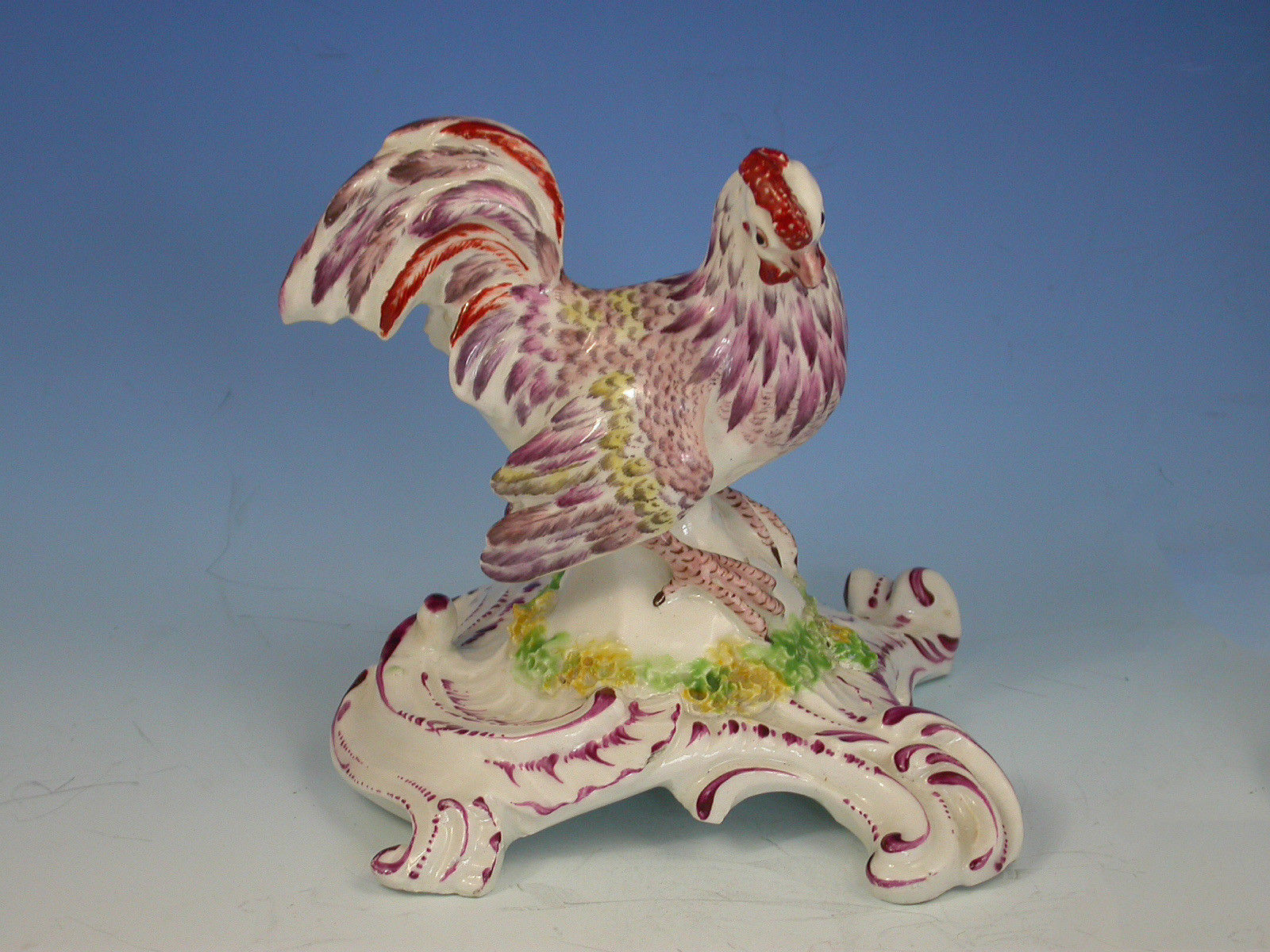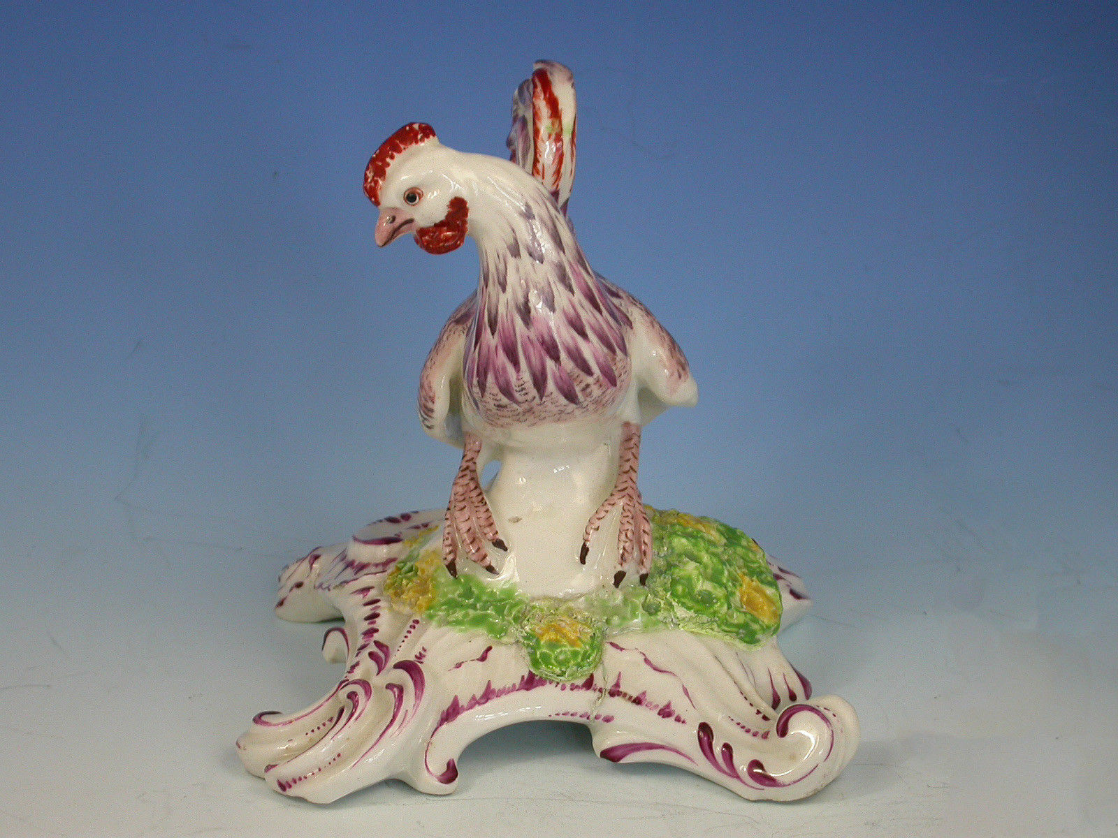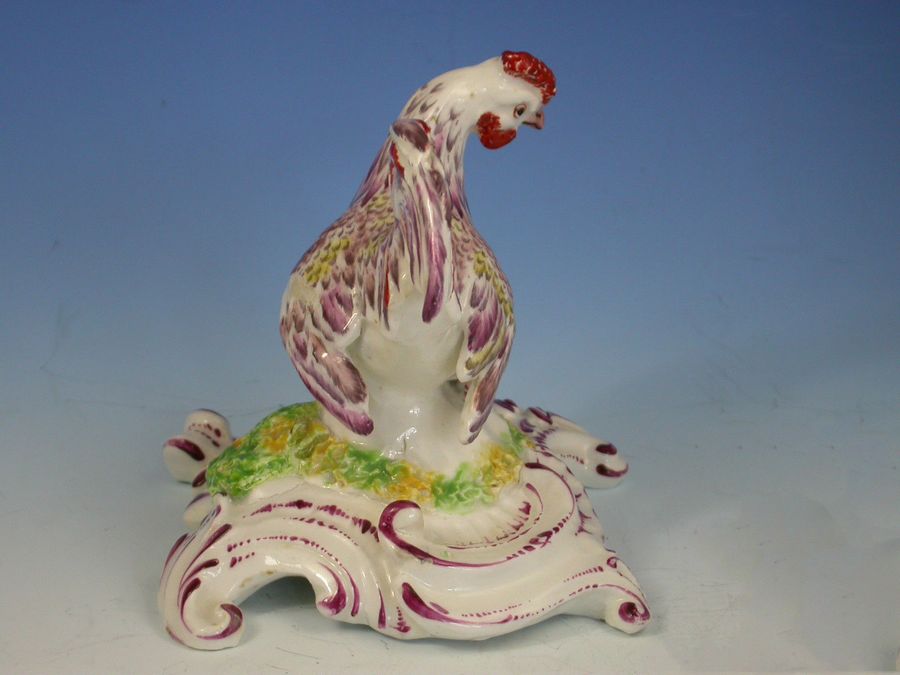 An extremely rare Bow model of a Cockerel on a quatre foil scroll moulded base, painted in polychrome enamels in puce iron red and yellow.