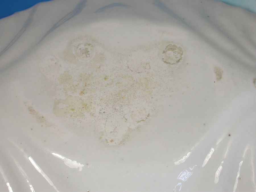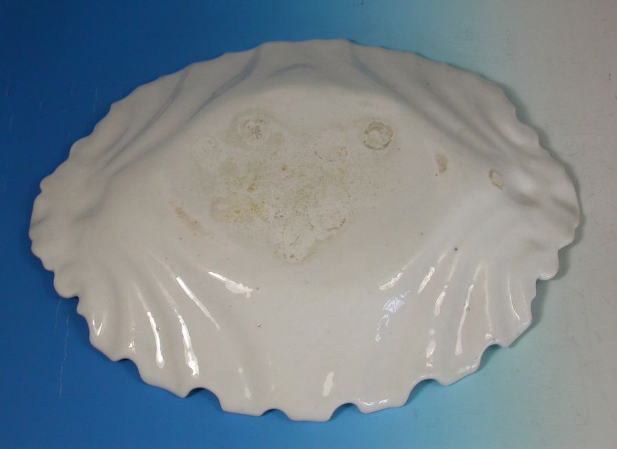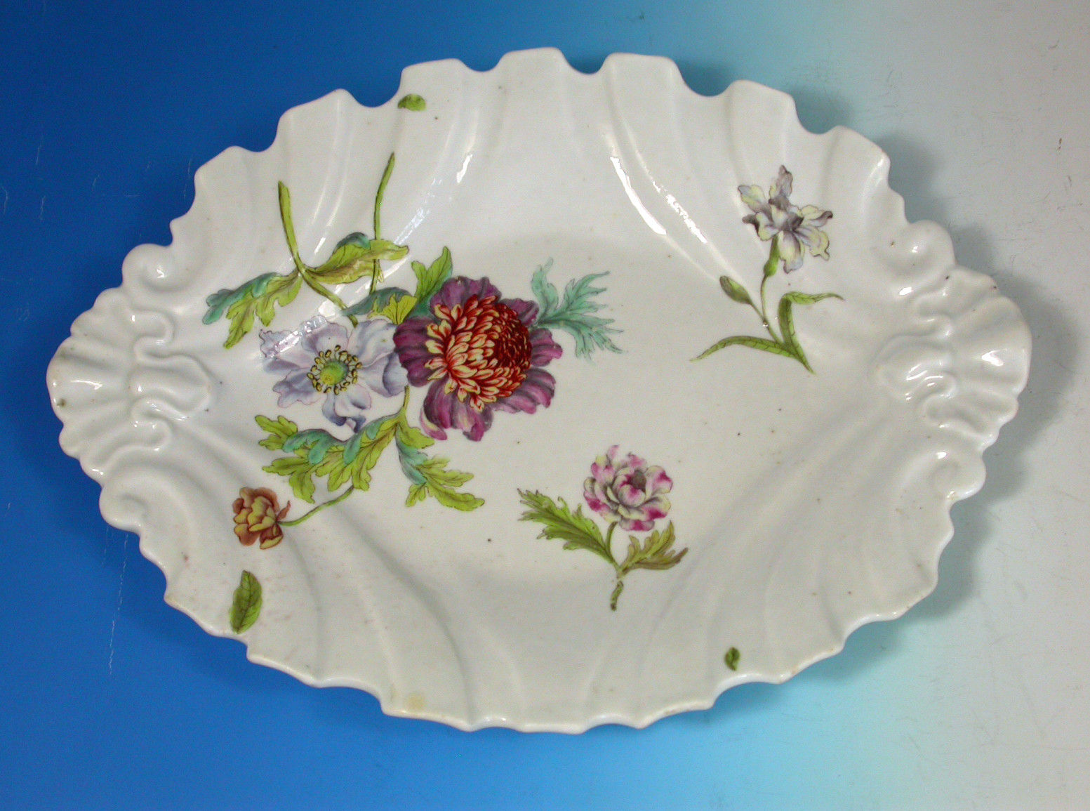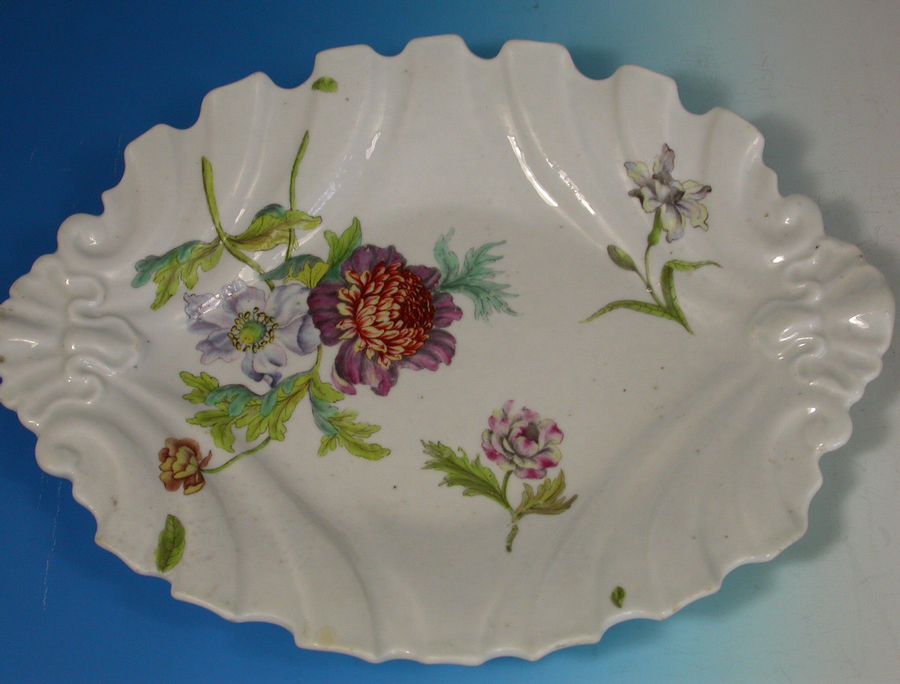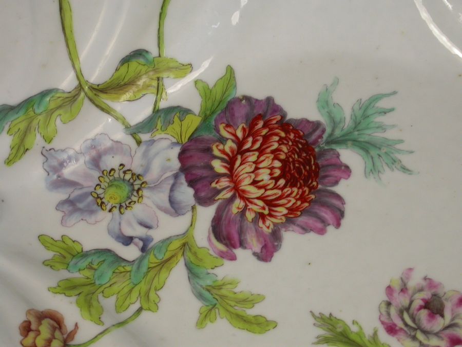 A fine and rare Chelsea raised anchor moulded silver shape Dessert Dish, with shell form handles and irregular fluted rims, painted with the most unusual flower decoration with a bouquet of Peony type blooms.