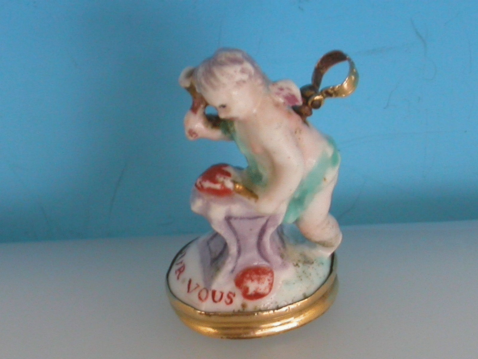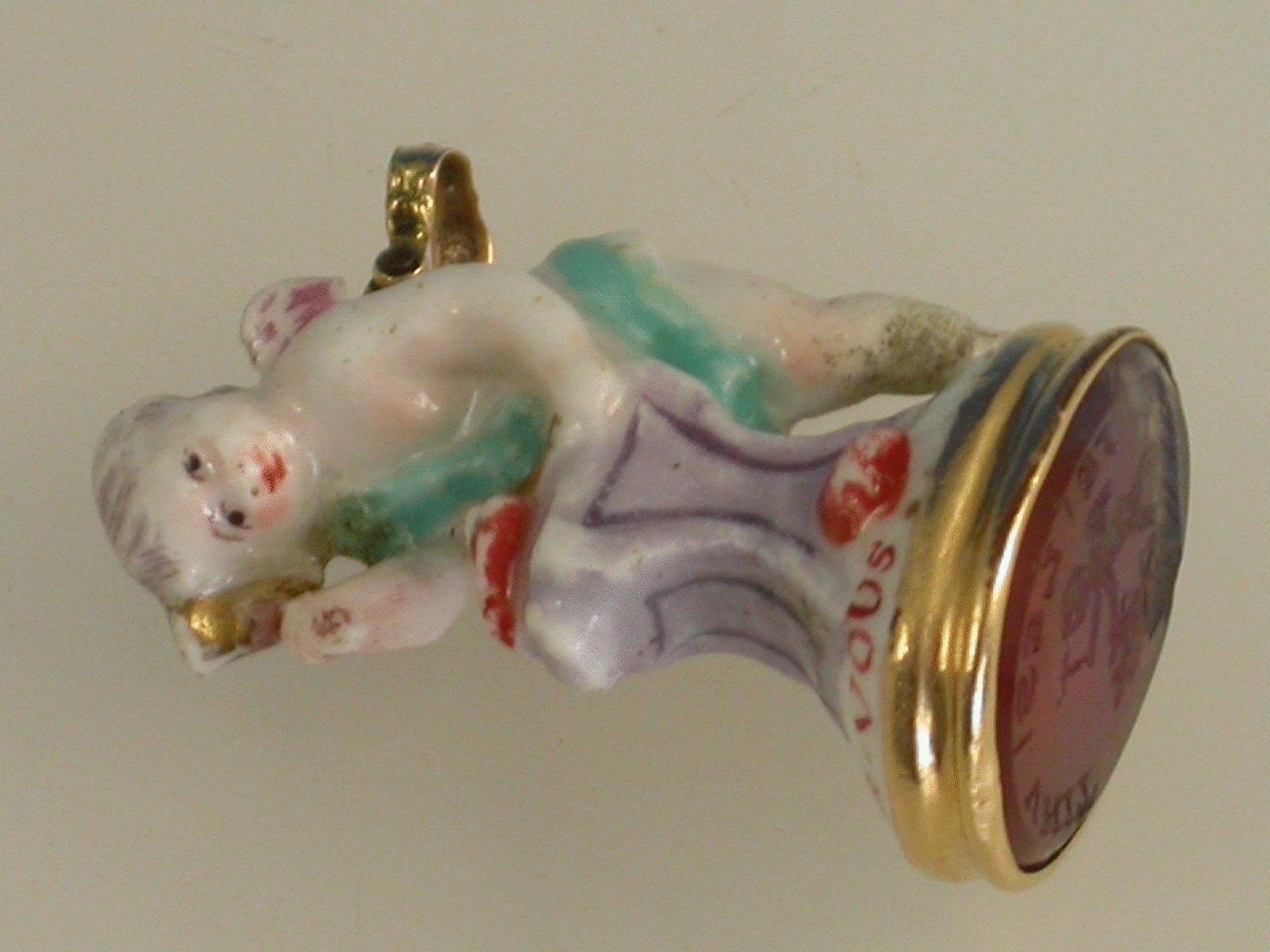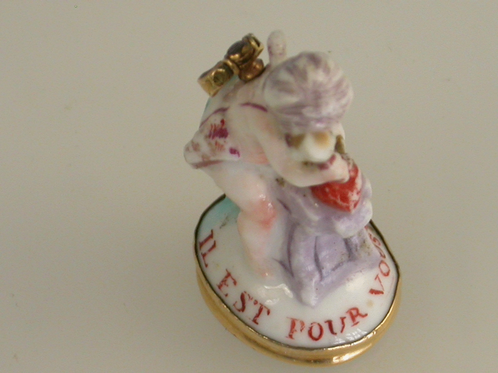 A fine and rare Chelsea Red Anchor Seal with gold suspension loop, depicting Cupid at a forge, the oval base painted with the love message ""Il est pour vous"", the gold mounted intaglio carved with the same motif and the phrase ""Je les unit"".