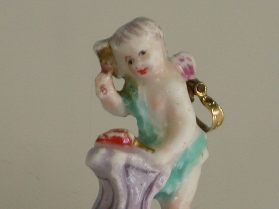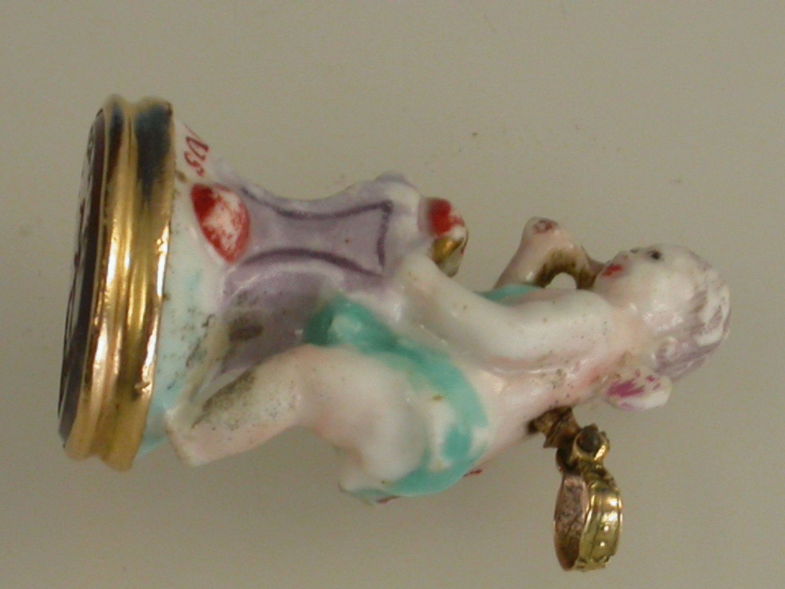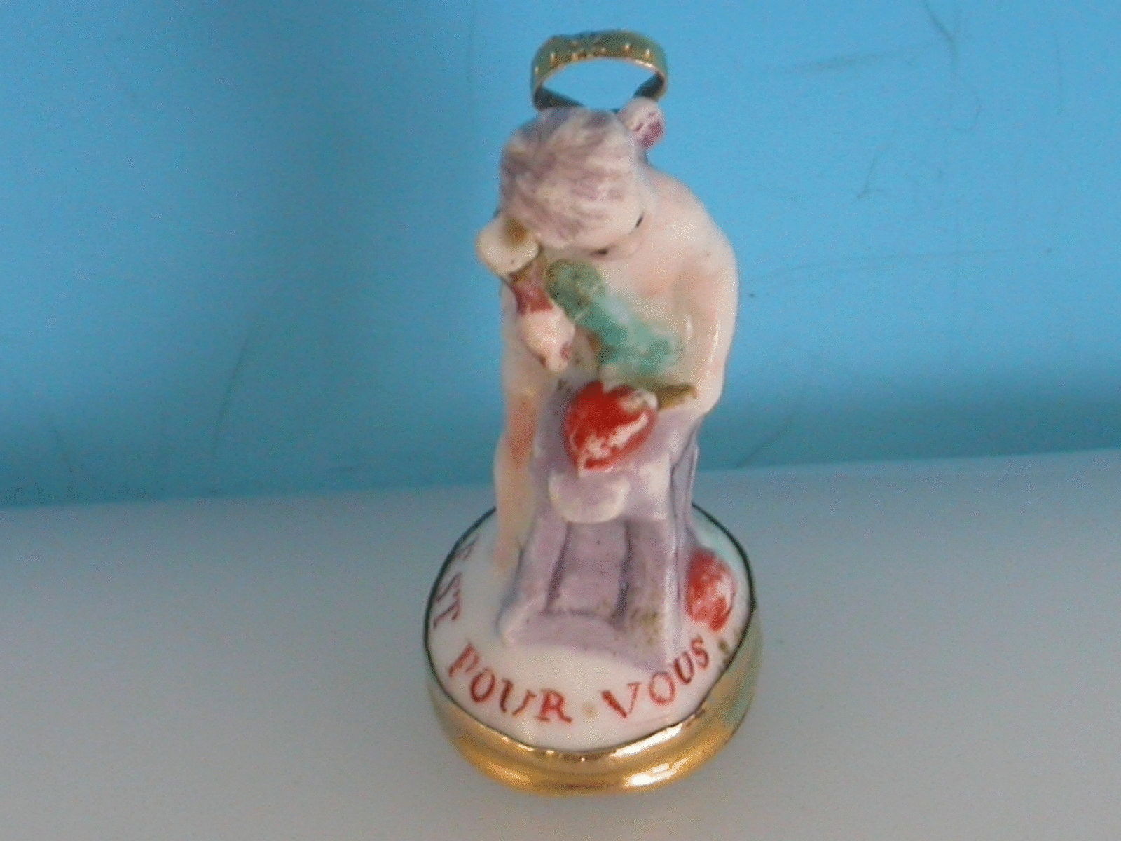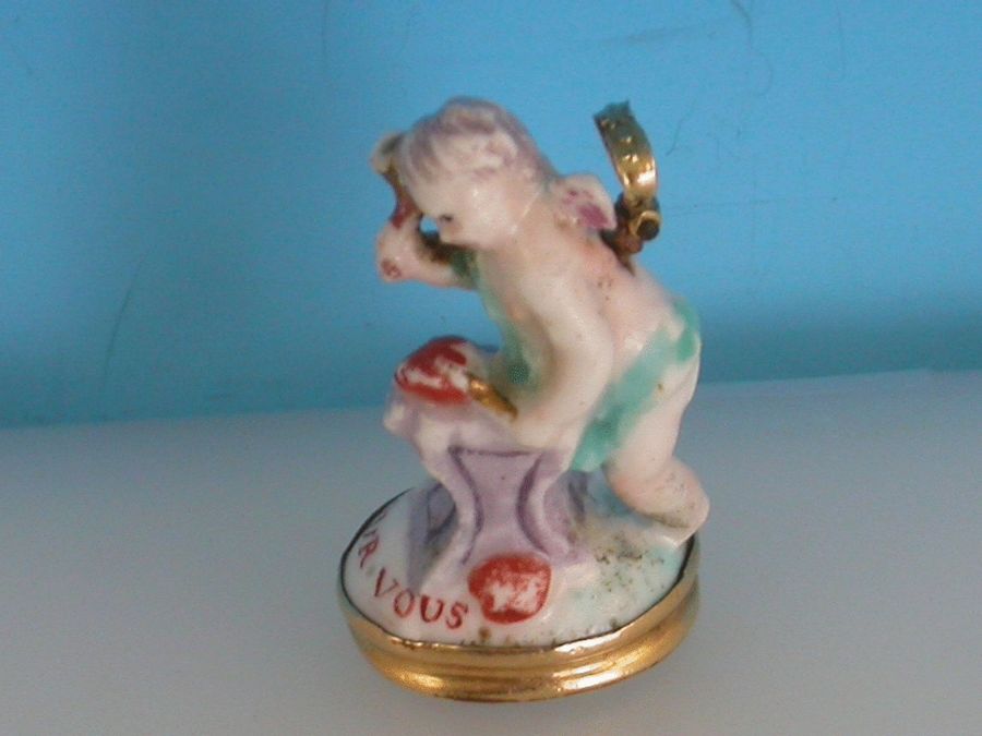 A fine and rare Chelsea Red Anchor Seal with gold suspension loop, depicting Cupid at a forge, the oval base painted with the love message ""Il est pour vous"", the gold mounted intaglio carved with the same motif and the phrase ""Je les unit"".