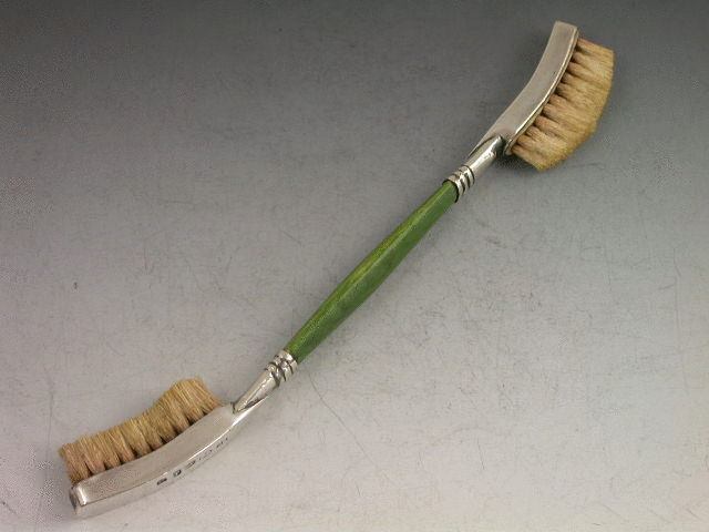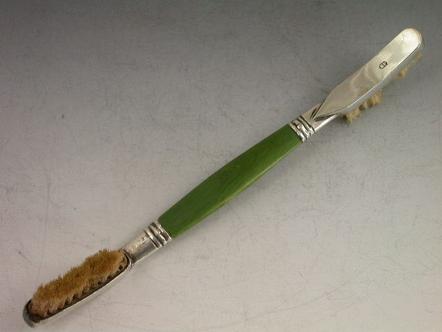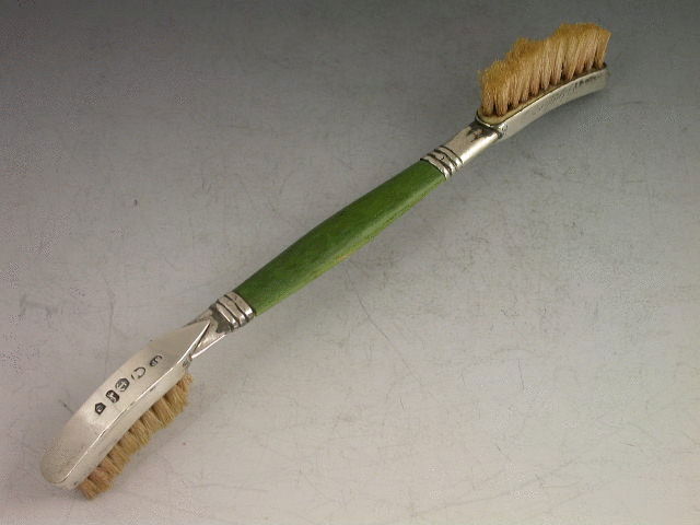 An extremely rare and unusual Georgian silver double headed Tooth Brush with green stained ivory handle, one head of curved concave form the other of curved convex form to facilitate reaching every crevice! Engraved with contemporary name C.Gilder.