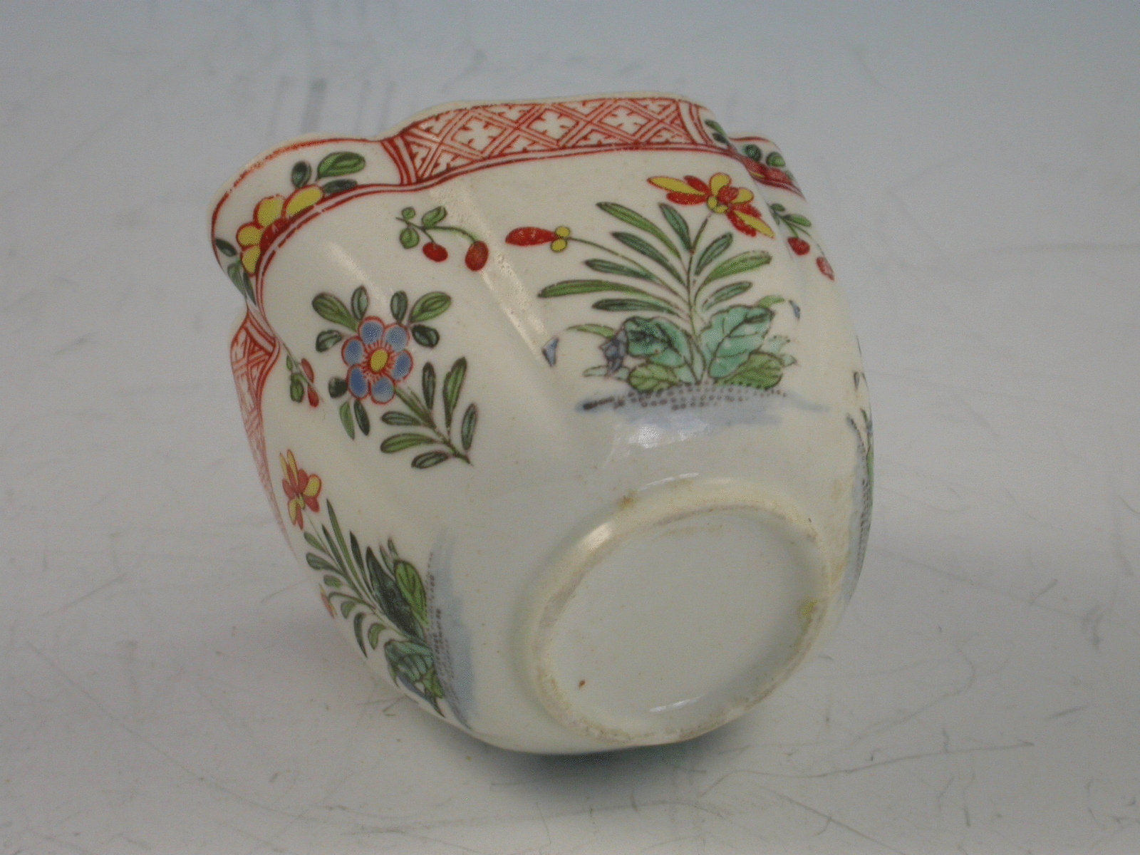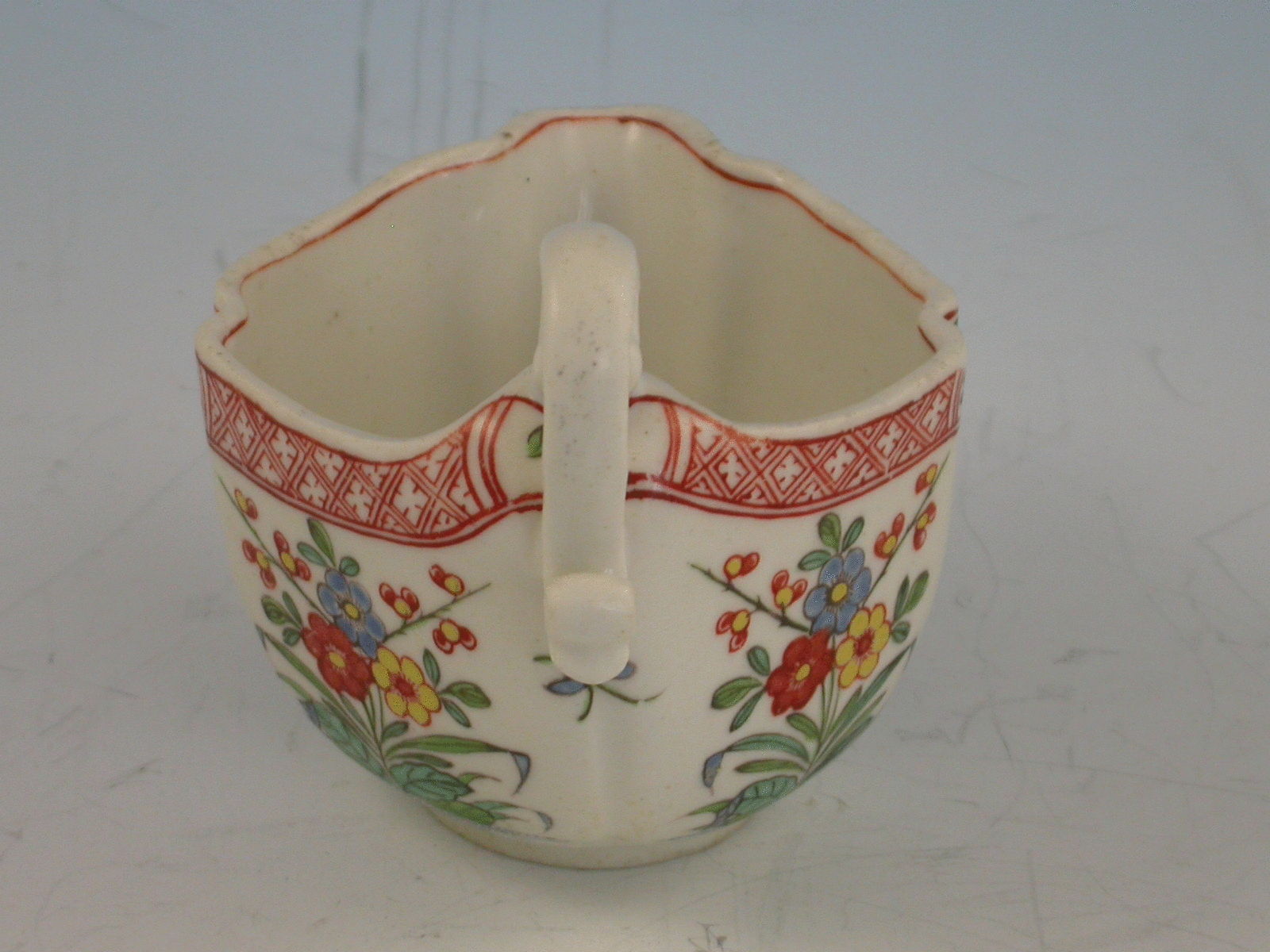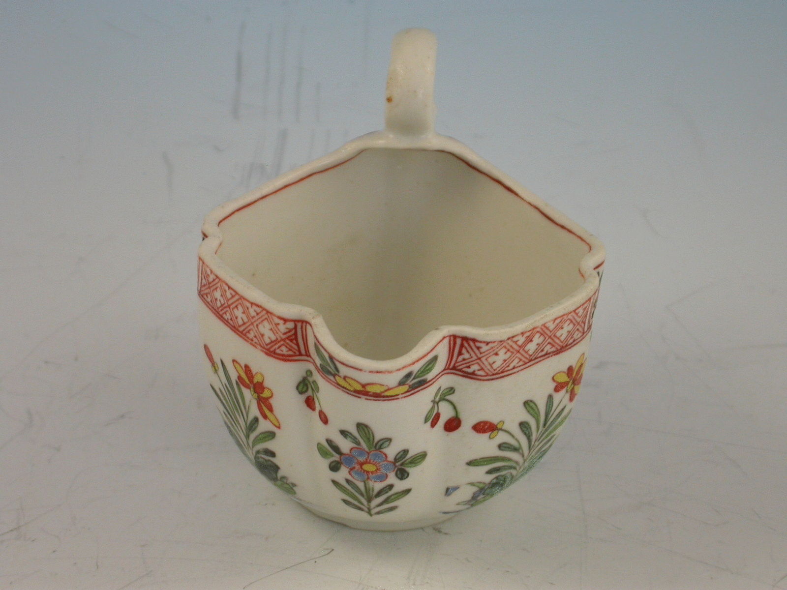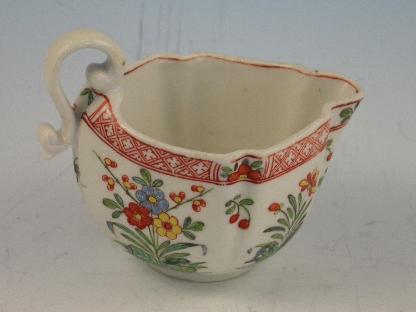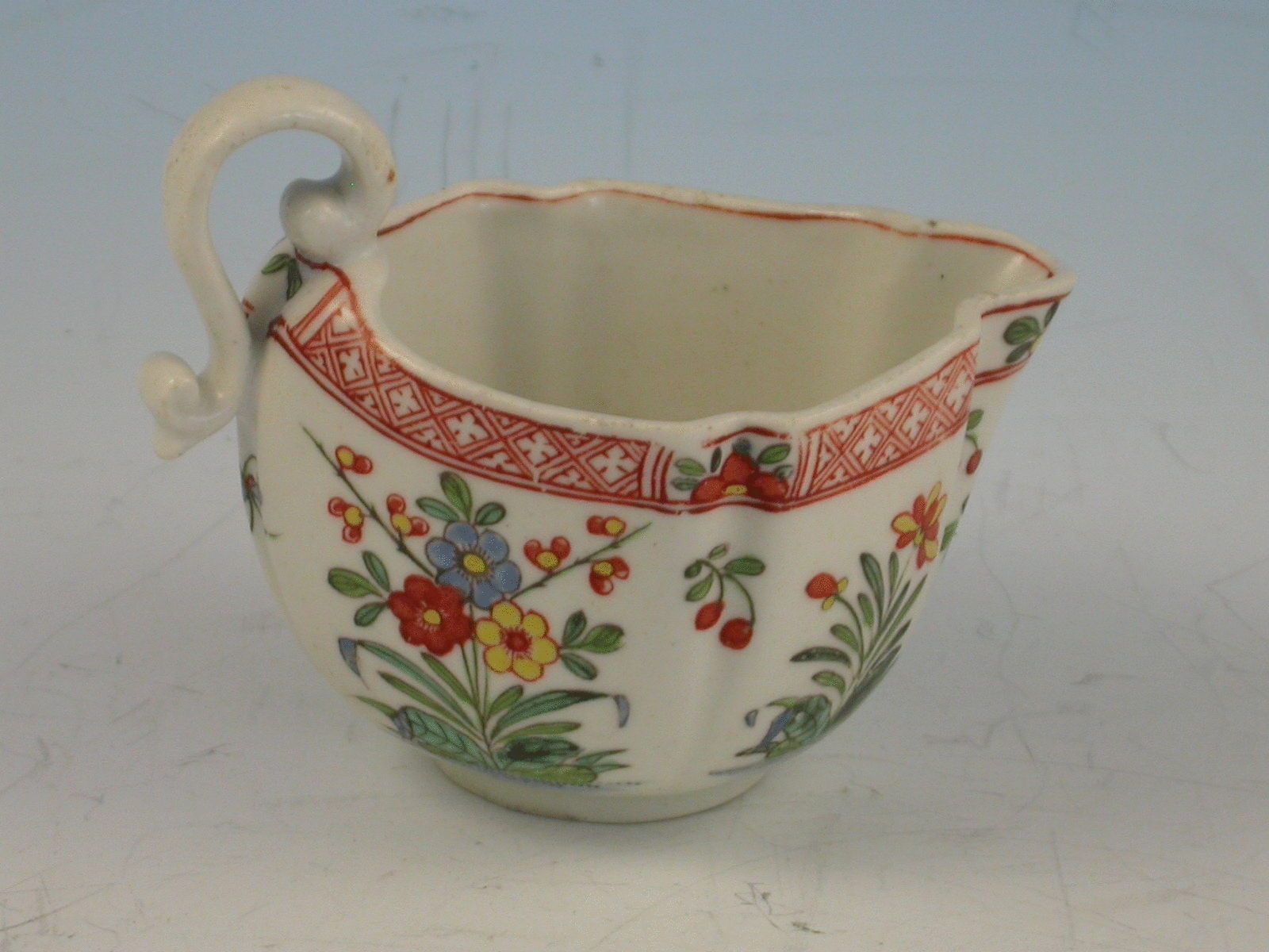 An extremely rare early Derby Cream Boat of Cruciform shape with a pinched lip and solid ""S"" scroll handle. The side panels enamelled with repeating pattern of Chinese flowering plants divided by sprigs of cherries, beneath a paneled red diaper boarder within small reserves of half flower heads.