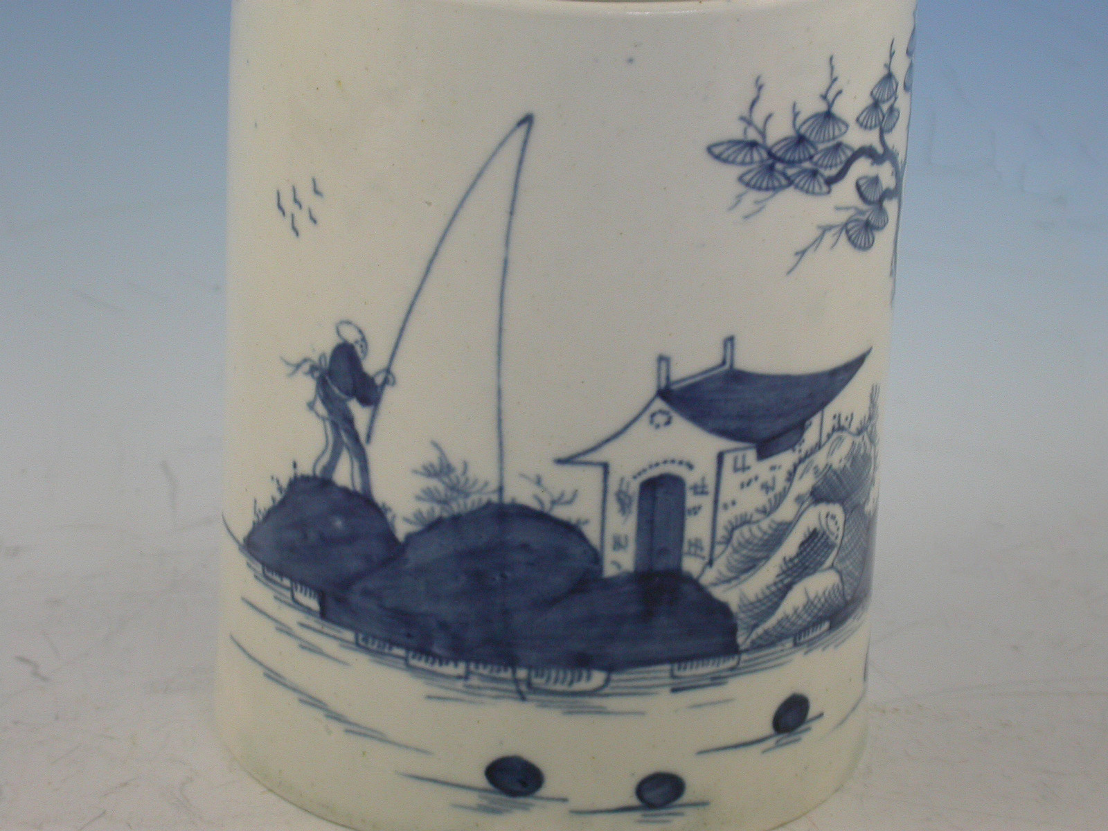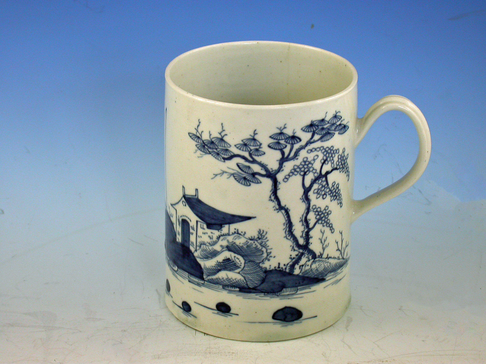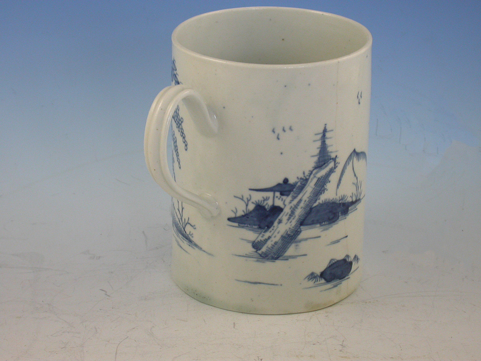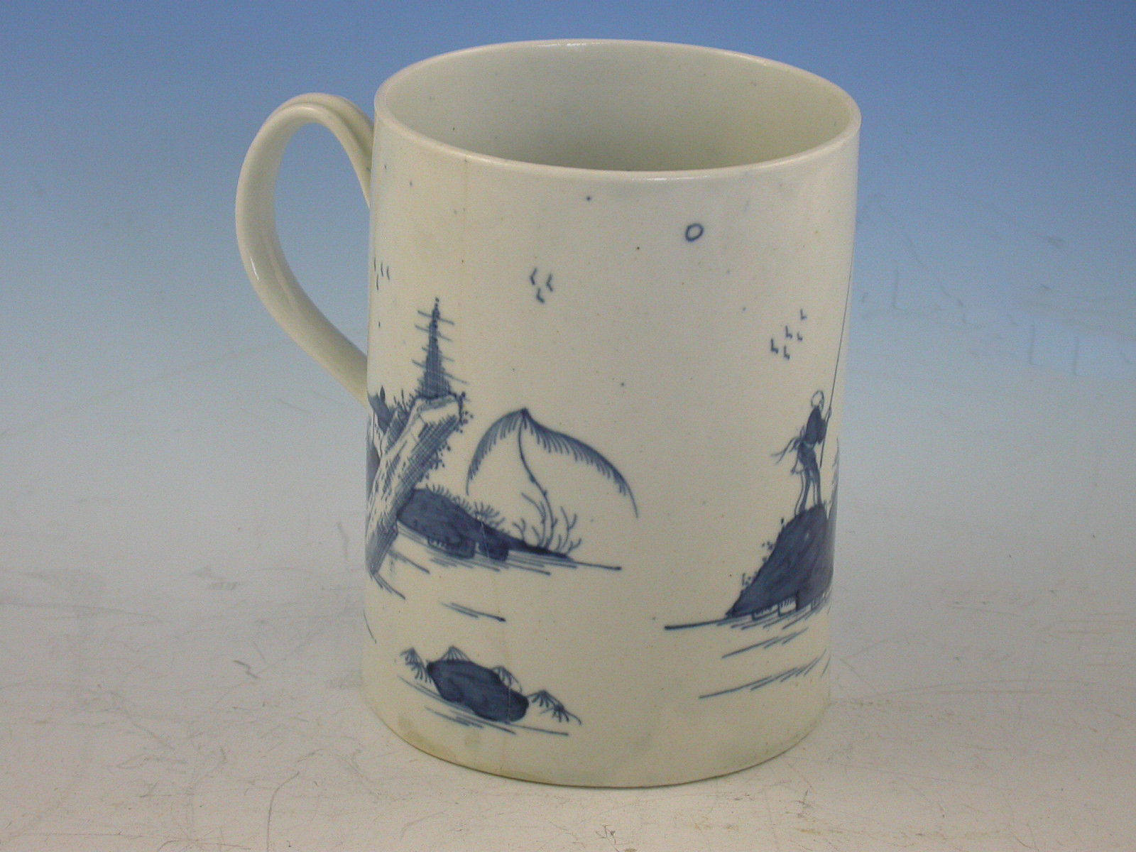 A cylindrical Tankard with ridged, loop handle and a flat footrim, extremely well painted in mid and paler tones of blue with a rocky island on which a bubble tree and a lampshade tree flourish. A large pavilion stands partly behind one of the rocks, its walls painted with what appear to be Worcester workman's marks. To the left, a fisherman stands hopefully on a rock holding an enormous rod and line. The secondary scene consists of a further island on which grow a willow and a pine tree. a tall leaning rock stands in the river in front of the island and partly hidden behind this is a large roofed building.
