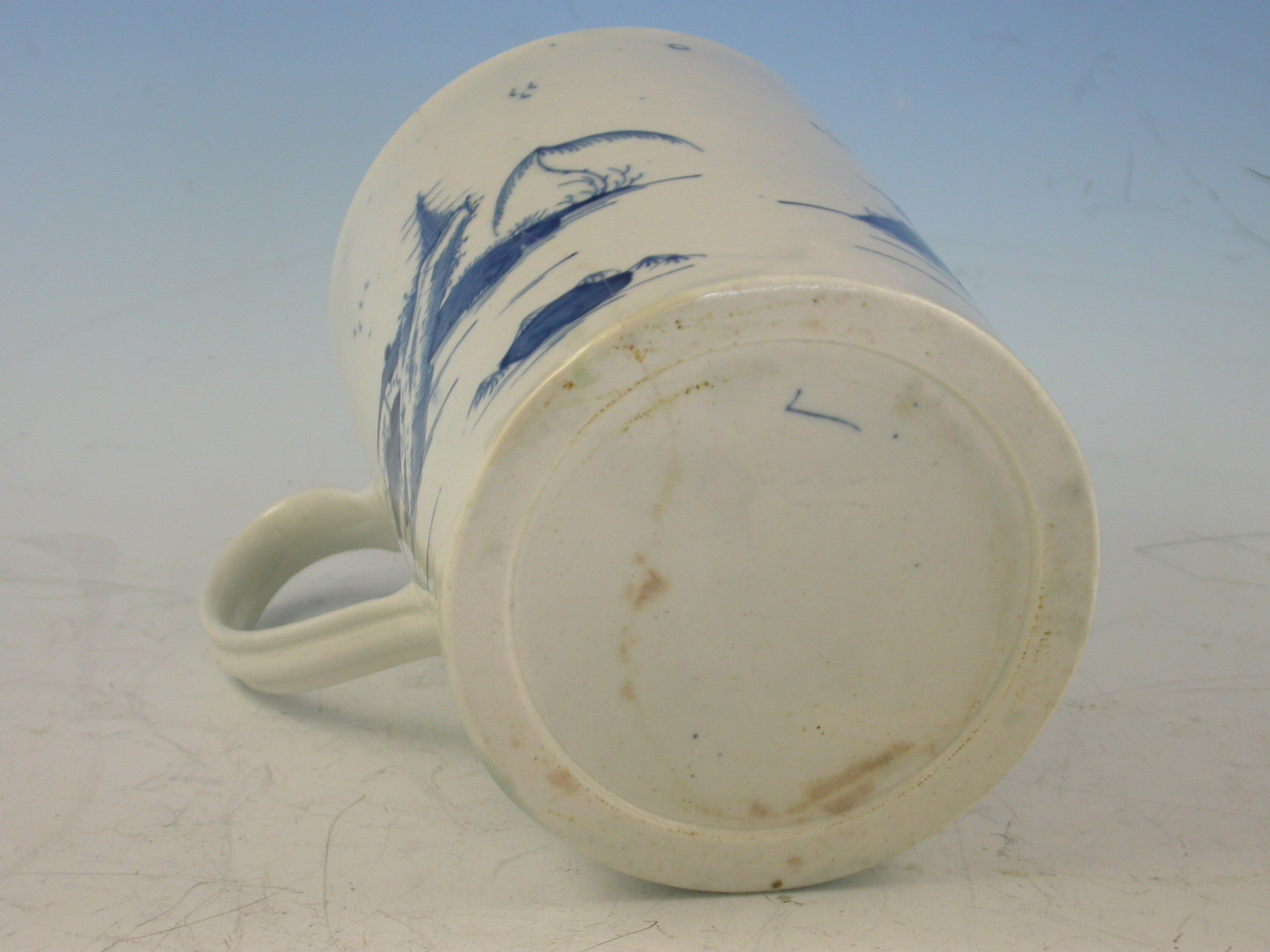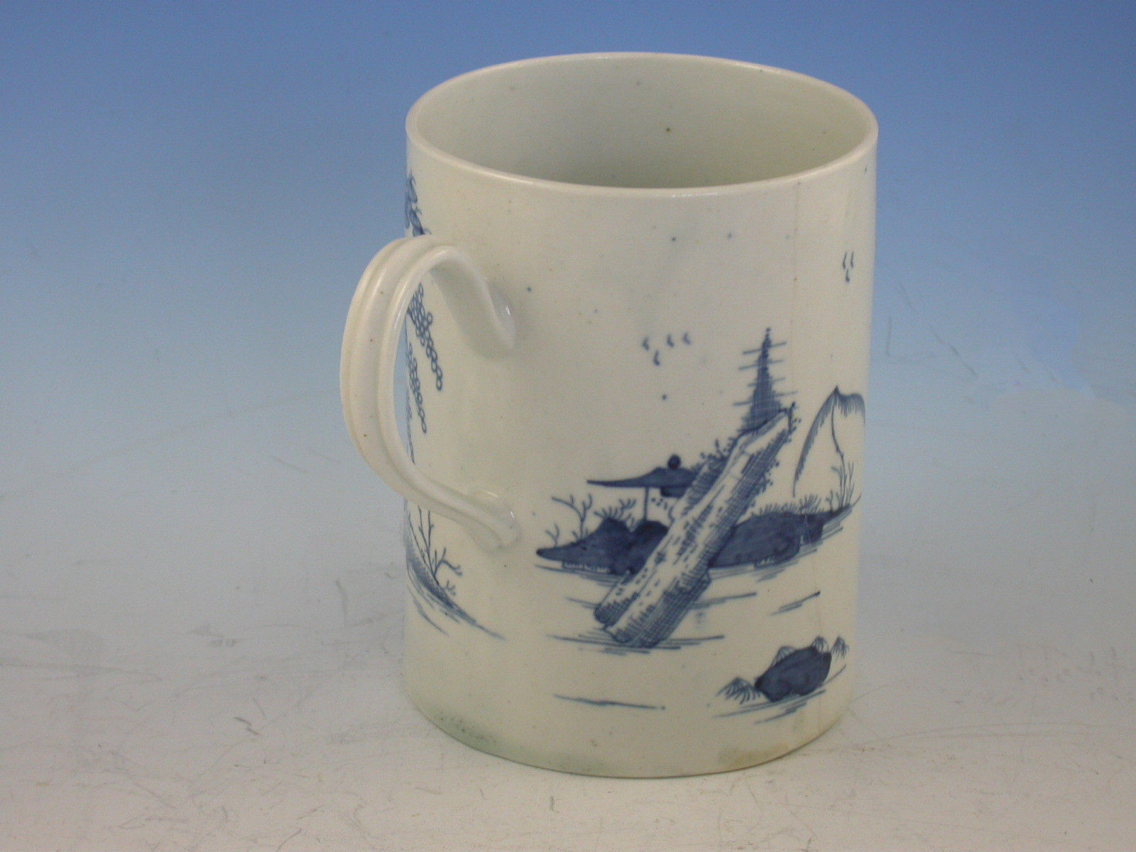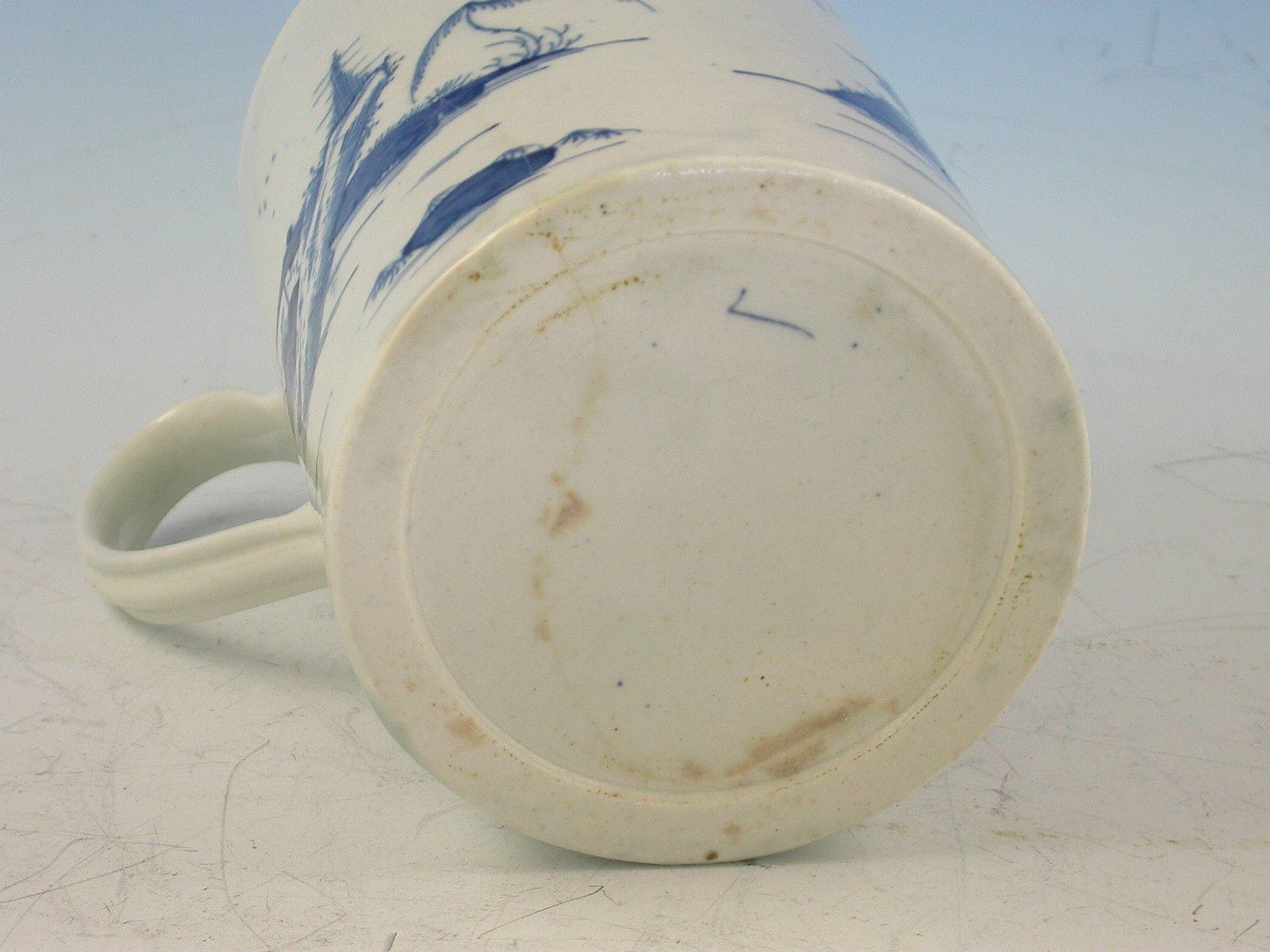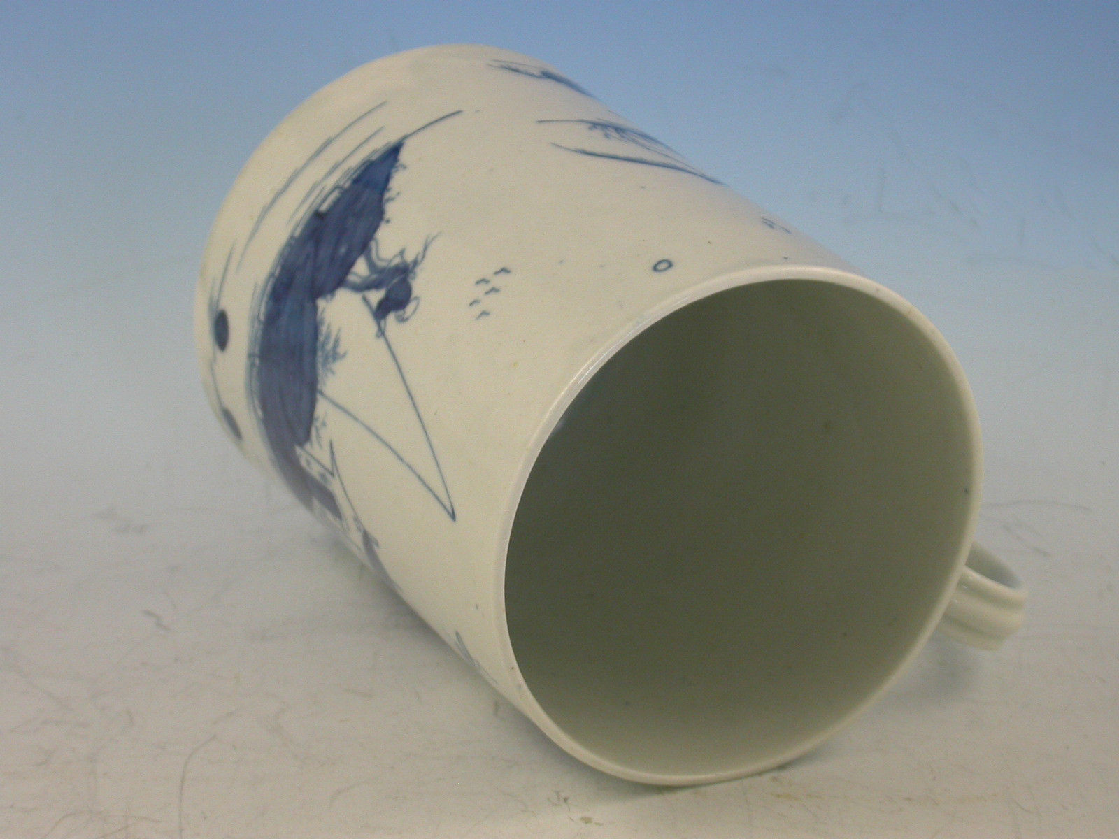 A cylindrical Tankard with ridged, loop handle and a flat footrim, extremely well painted in mid and paler tones of blue with a rocky island on which a bubble tree and a lampshade tree flourish. A large pavilion stands partly behind one of the rocks, its walls painted with what appear to be Worcester workman's marks. To the left, a fisherman stands hopefully on a rock holding an enormous rod and line. The secondary scene consists of a further island on which grow a willow and a pine tree. a tall leaning rock stands in the river in front of the island and partly hidden behind this is a large roofed building.