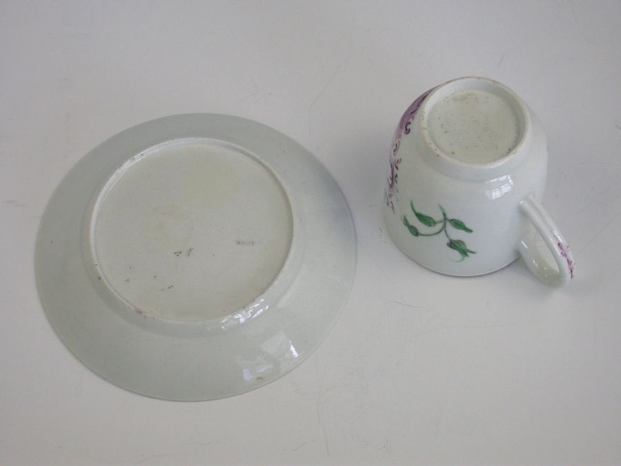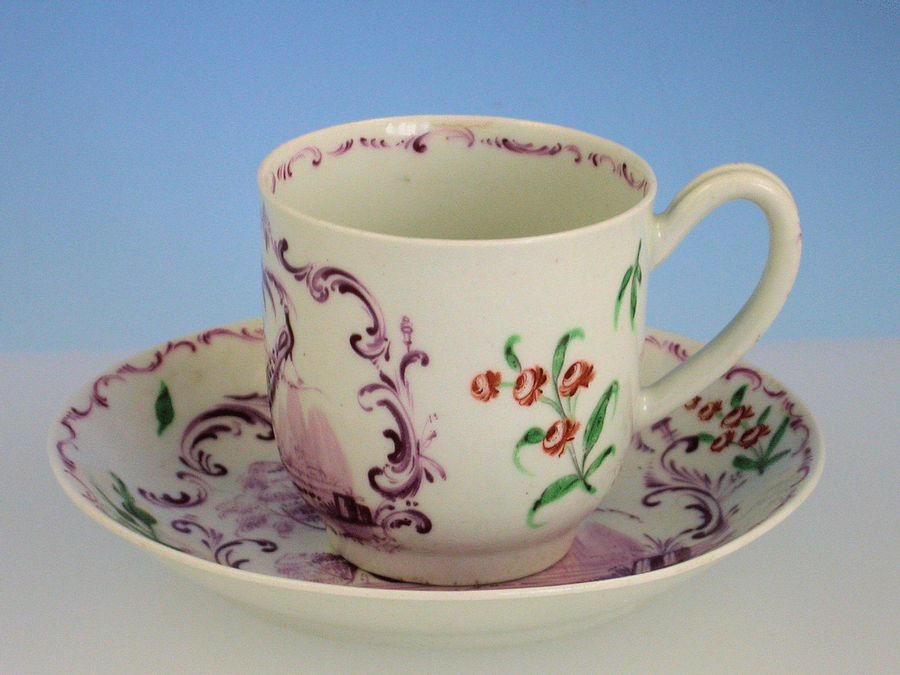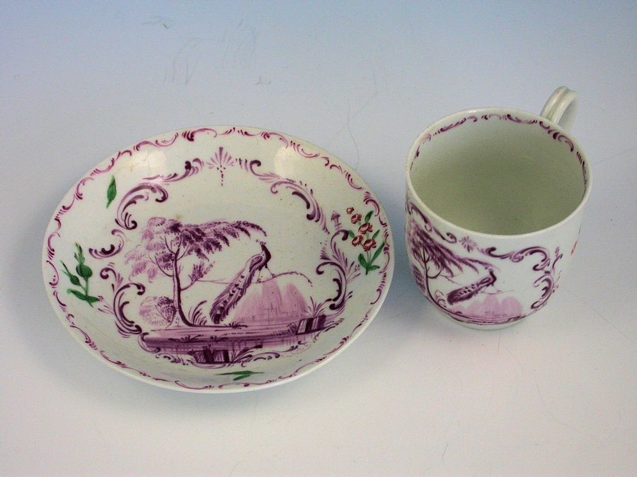An extremely rare early Worcester Coffee Cup & Saucer, the cup with grooved strap handle, painted in puce camaieu with a peacock perched on a slender branch of a larch tree, with water in the foreground and hills in the background within puce rococo scroll work and foliate sprays.
