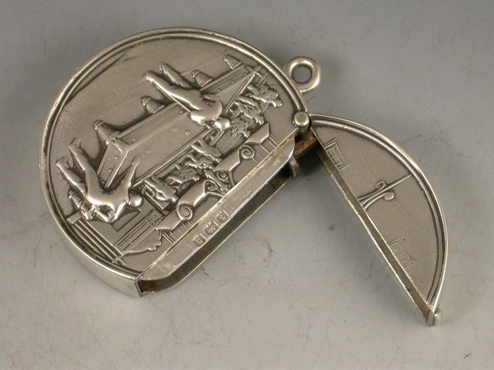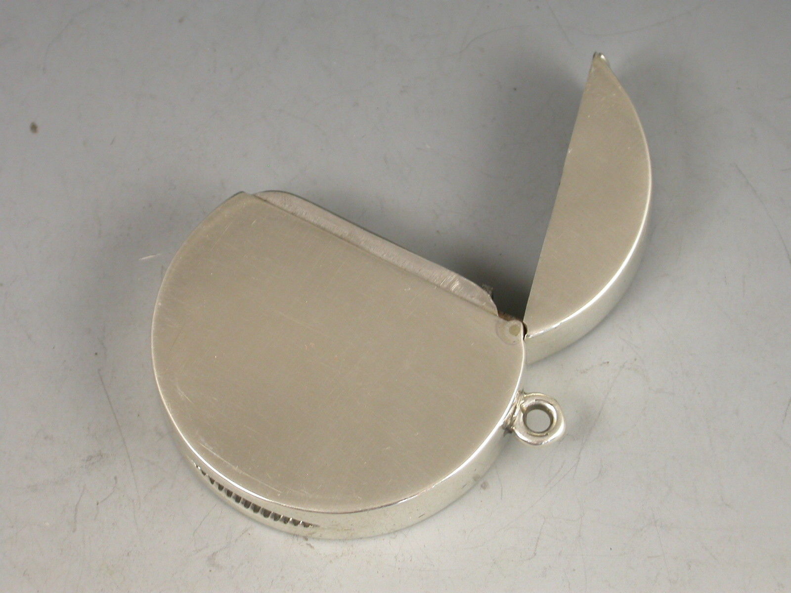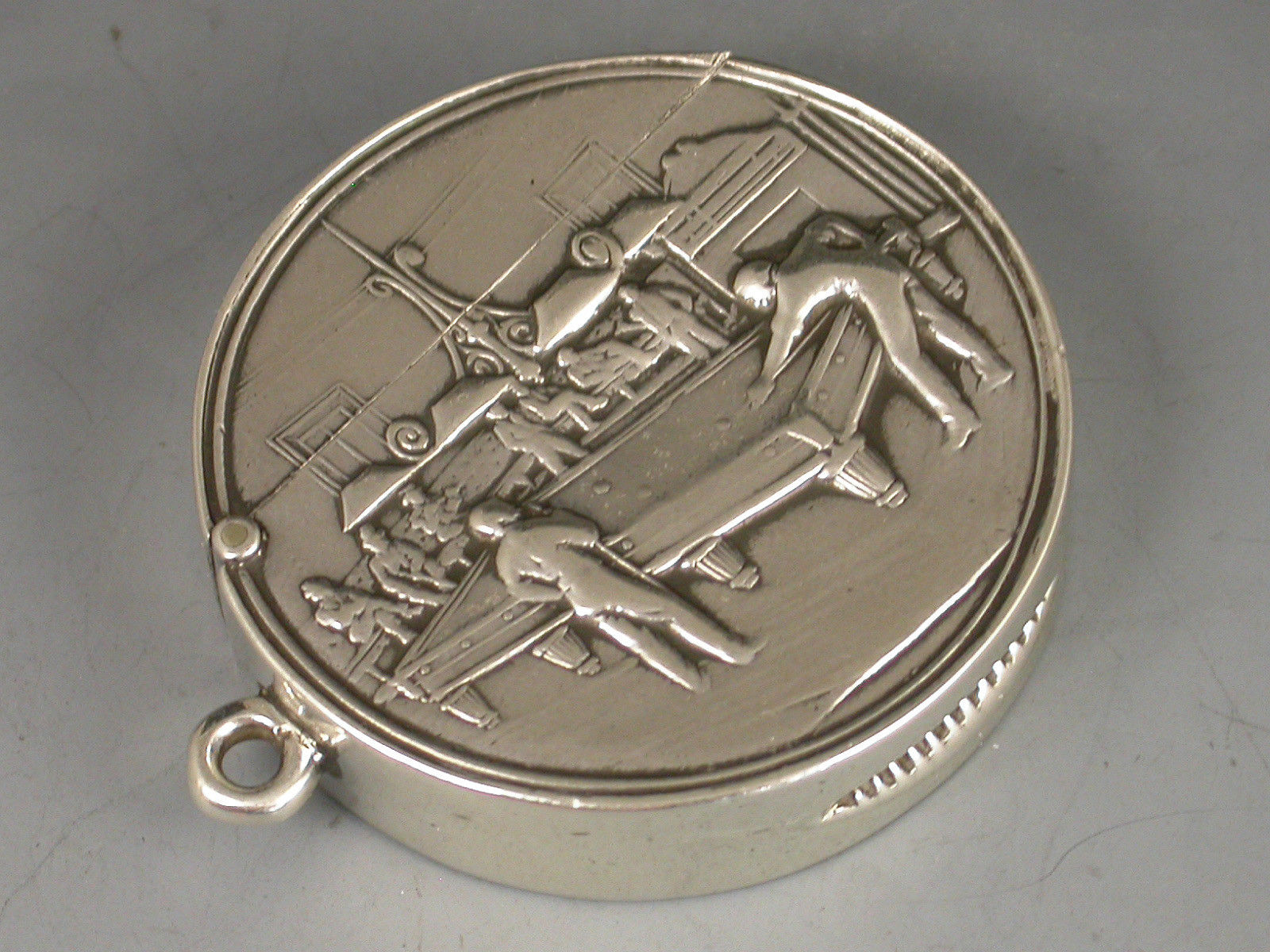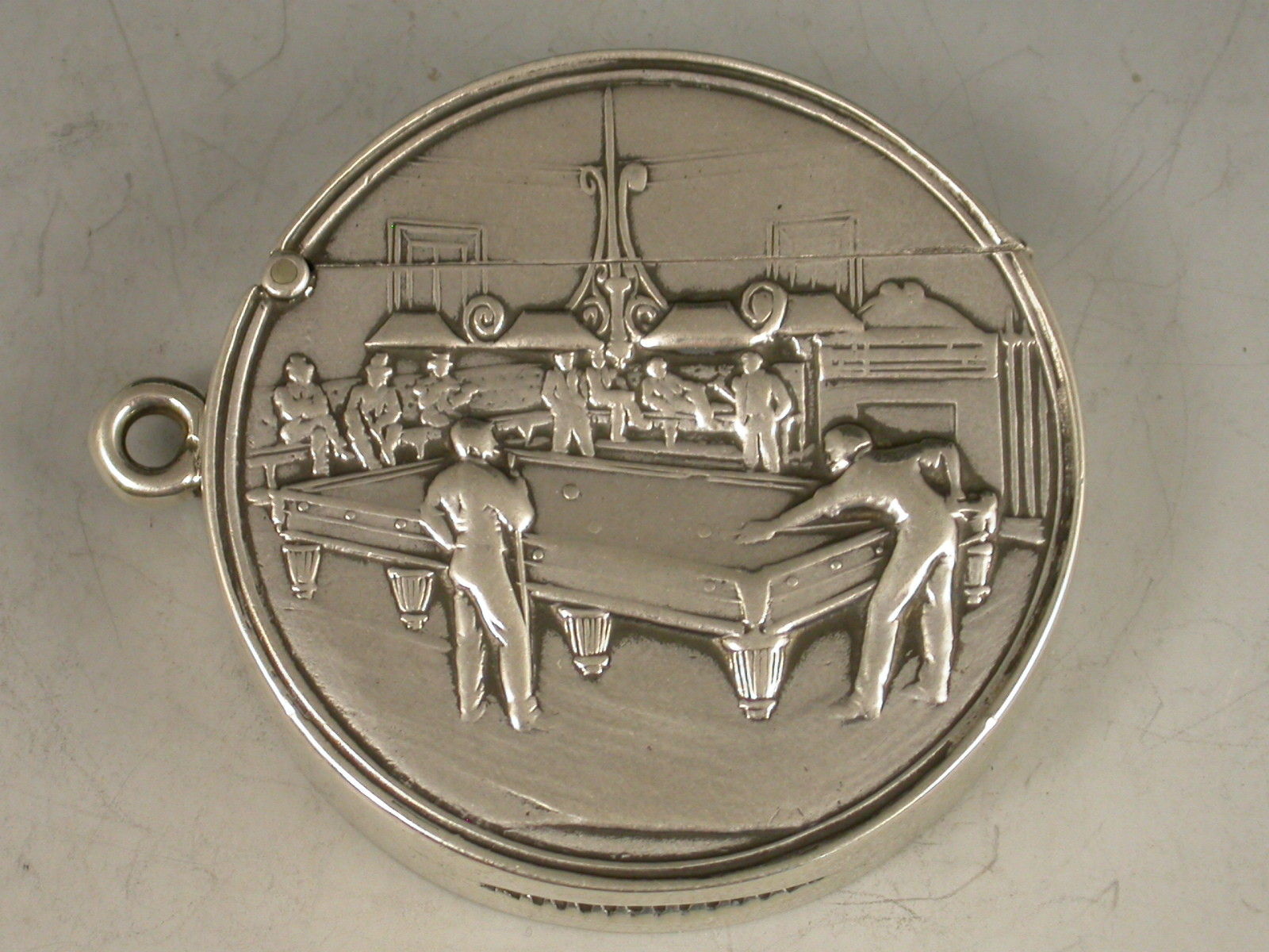 A rare Edwardian circular silver Vesta Case with hinged flip-top lid, the face chased and engraved with a billiards room, two players at the table, spectators and a score board in the background, a striker to the base. Attached suspension ring.