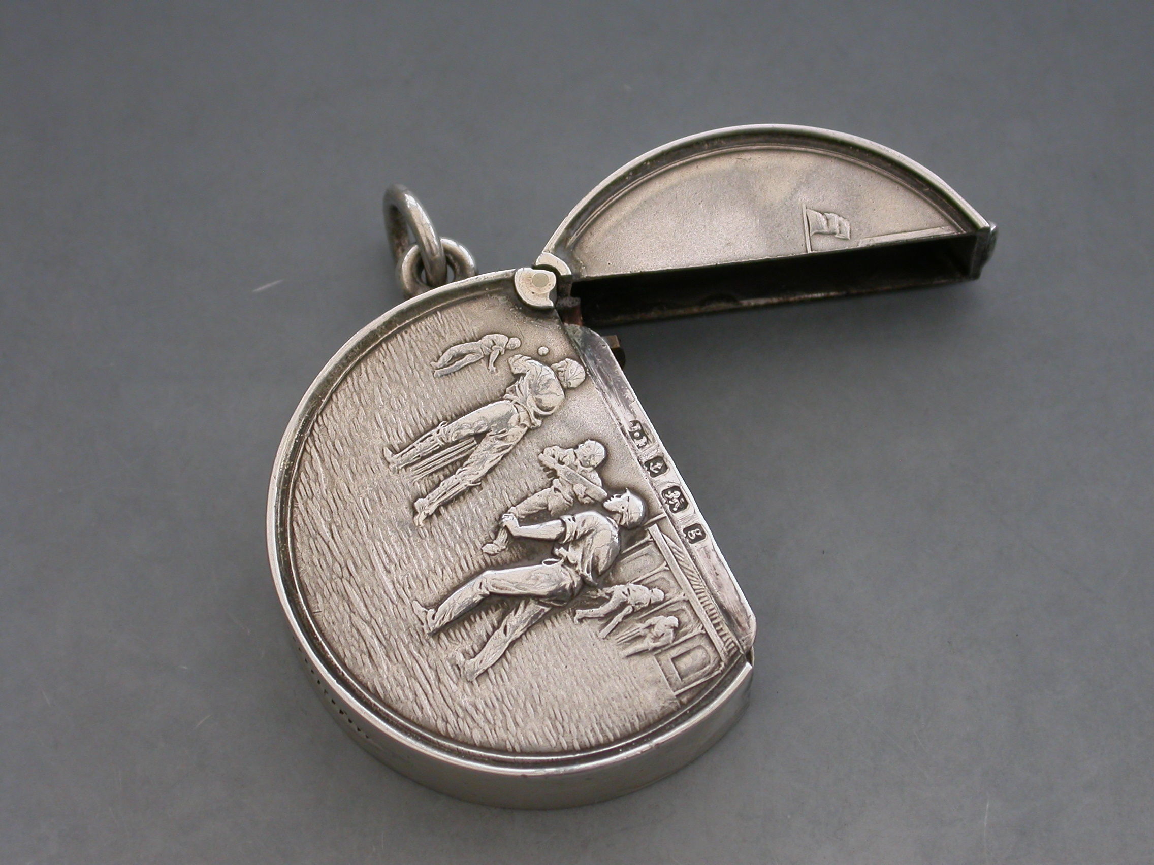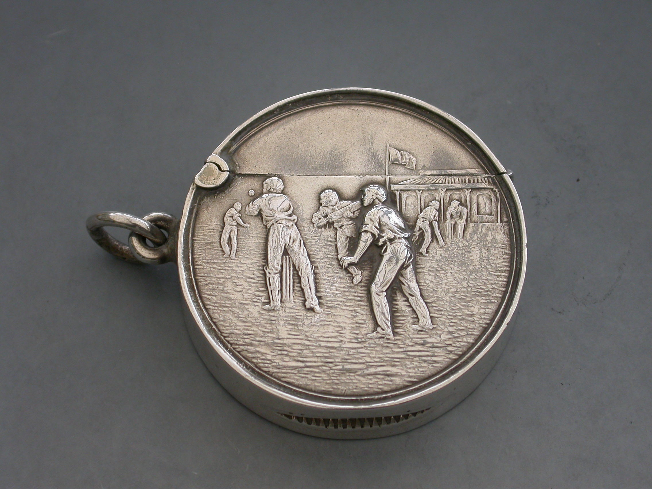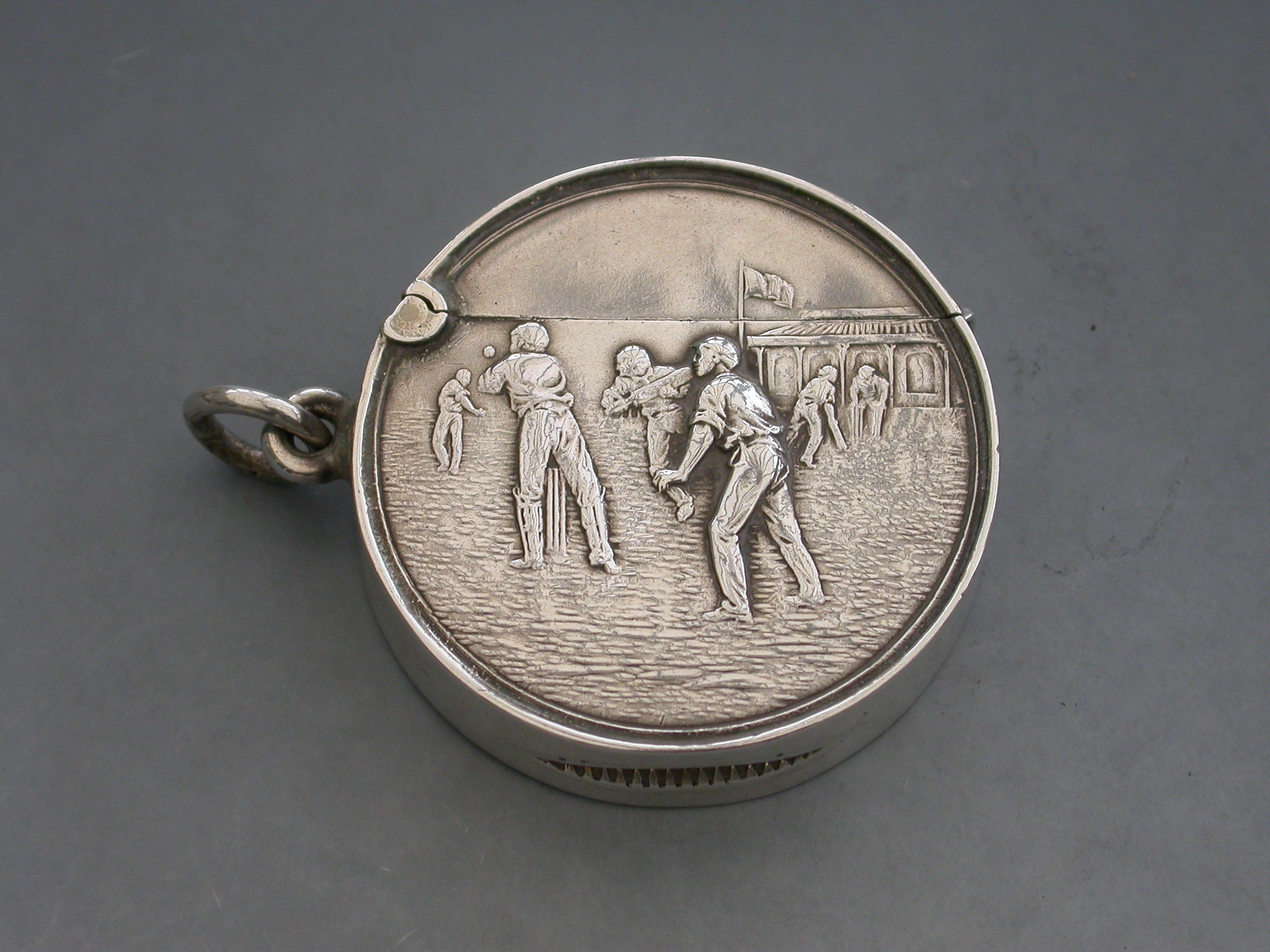 A rare Edwardian circular silver Vesta Case with hinged flip-top lid, the face chased and engraved with a cricket match (a rare subject). Attached suspension ring.