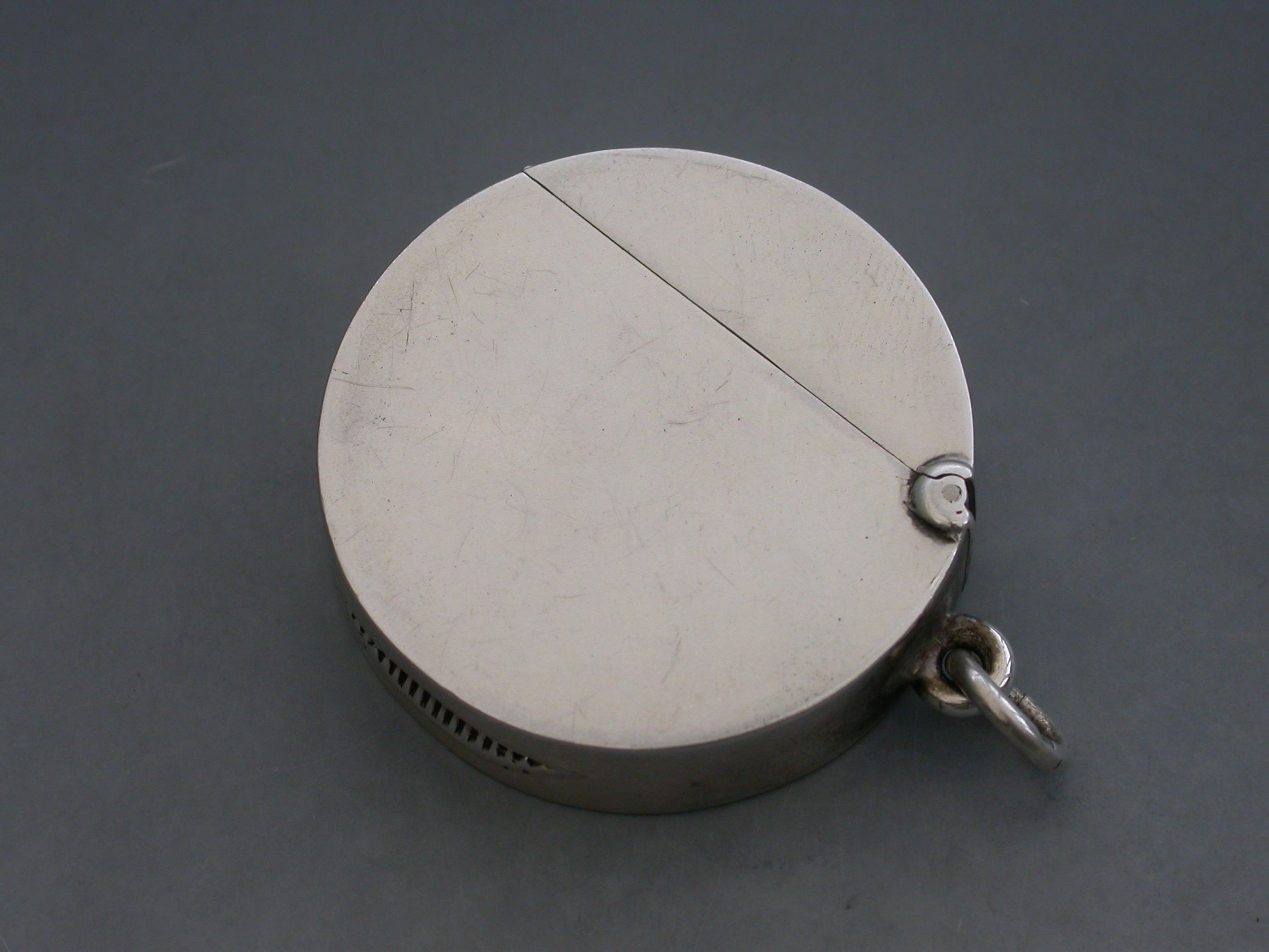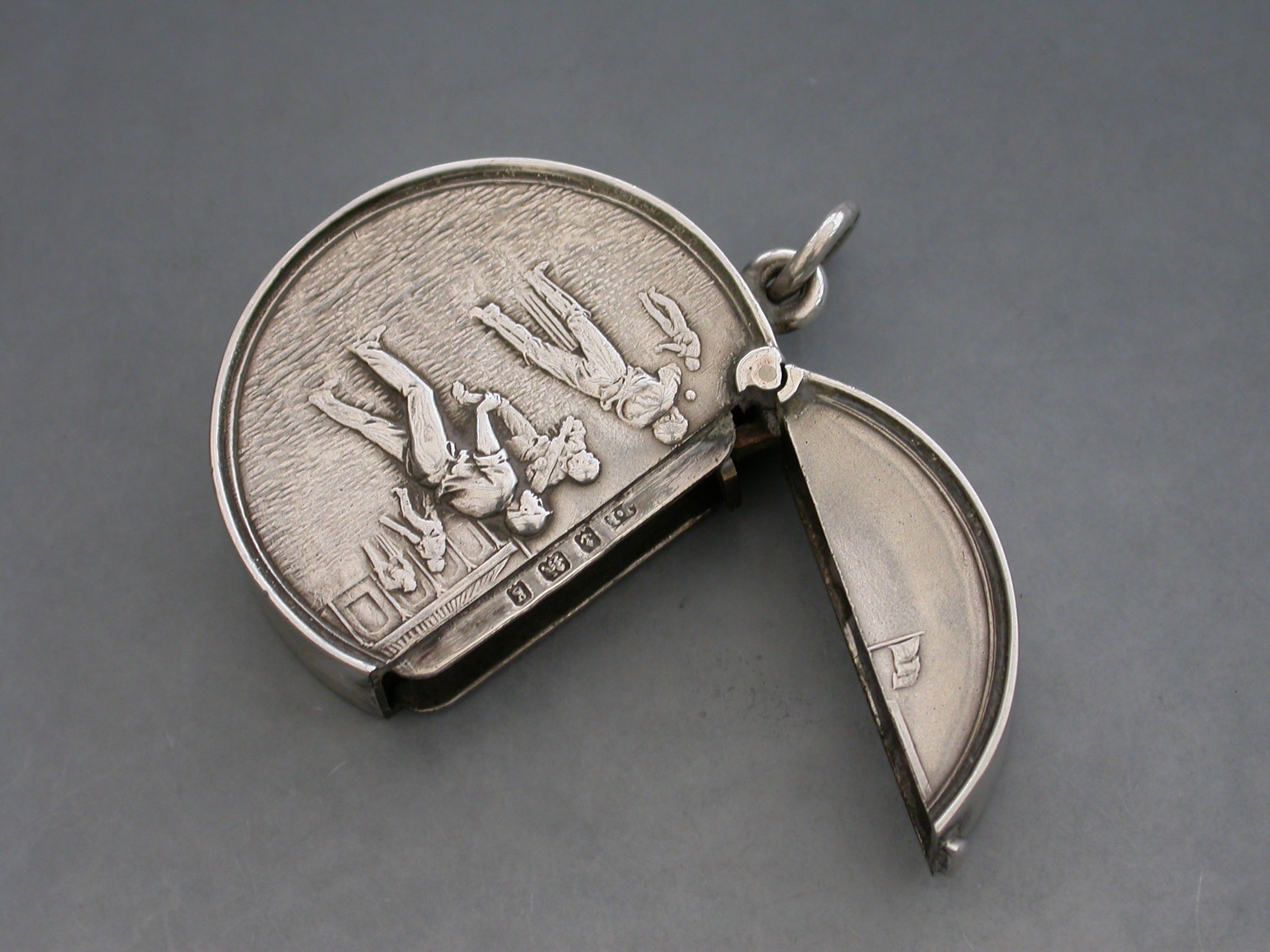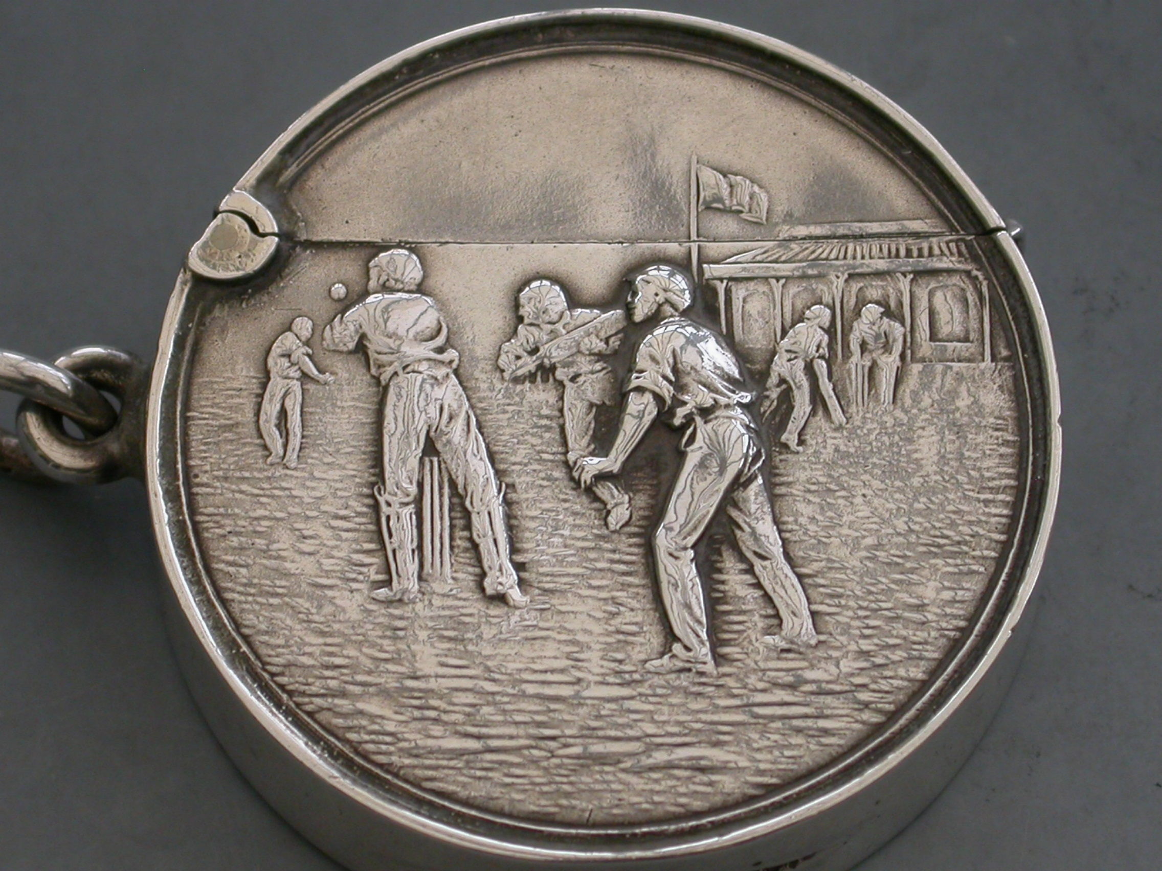 A rare Edwardian circular silver Vesta Case with hinged flip-top lid, the face chased and engraved with a cricket match (a rare subject). Attached suspension ring.