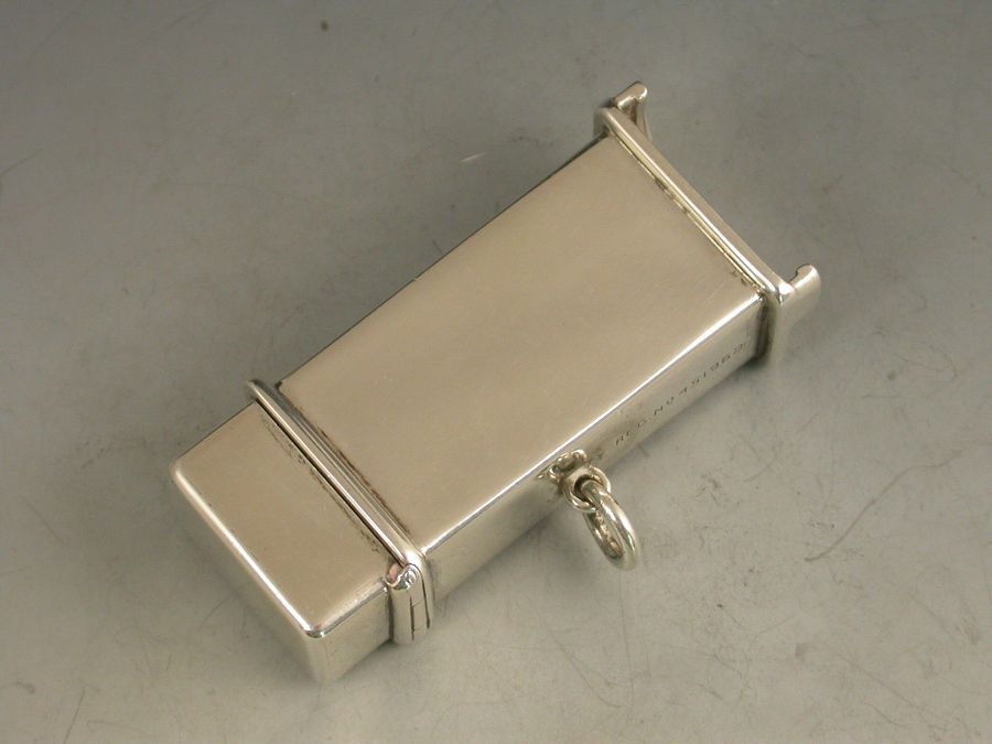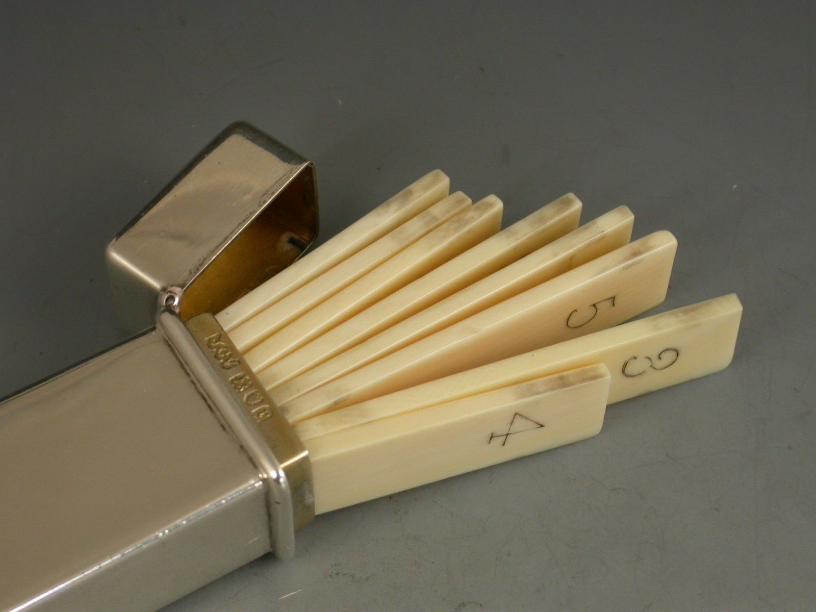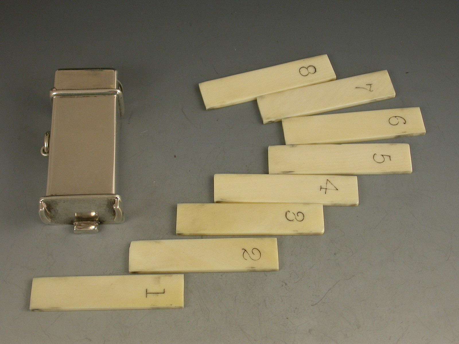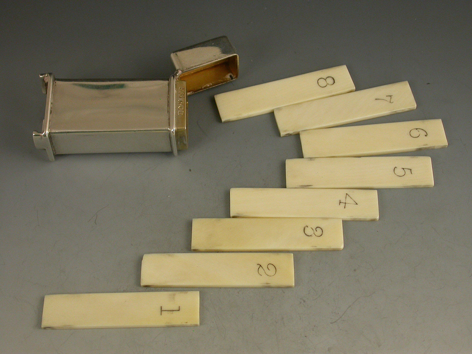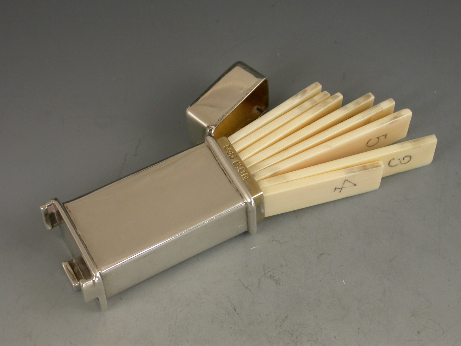 A very fine quality and rare Edwardian silver Shooting Butt Marker for eight guns, combined with a cartridge extractor to the base, of rectangular from with hinged flip-top lid, the silver gilt interior containing eight numbered bone or ivory pegs. Attached suspension ring.