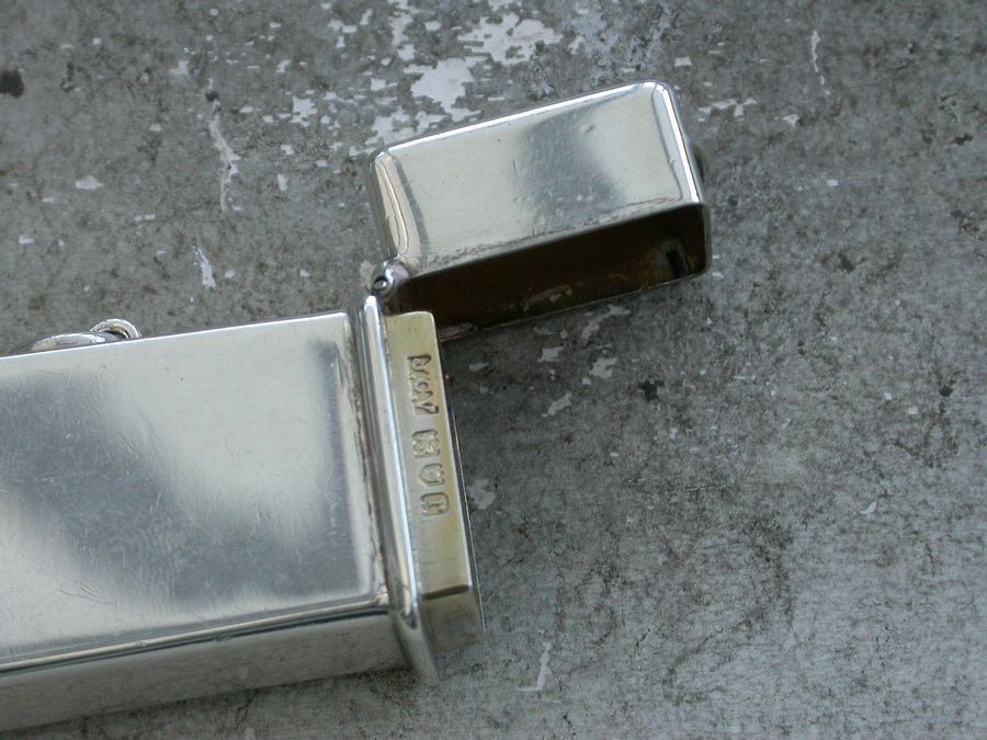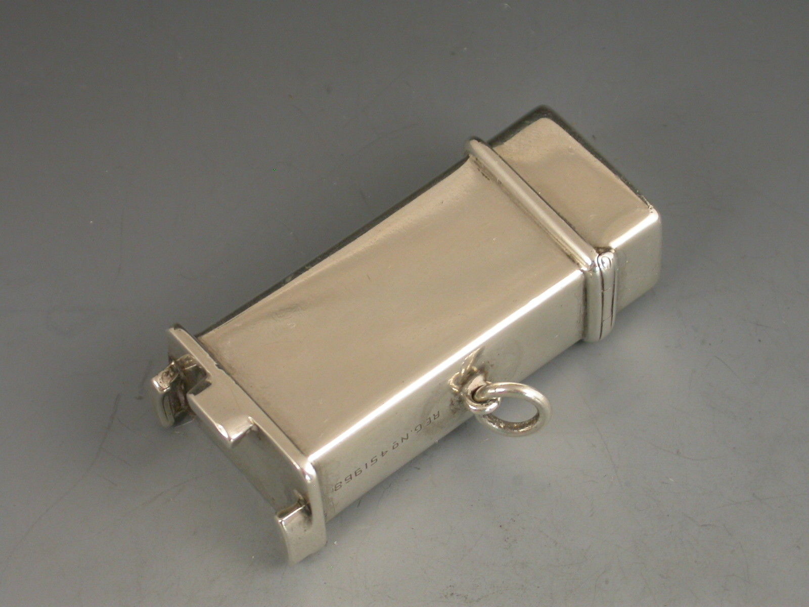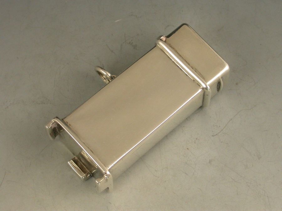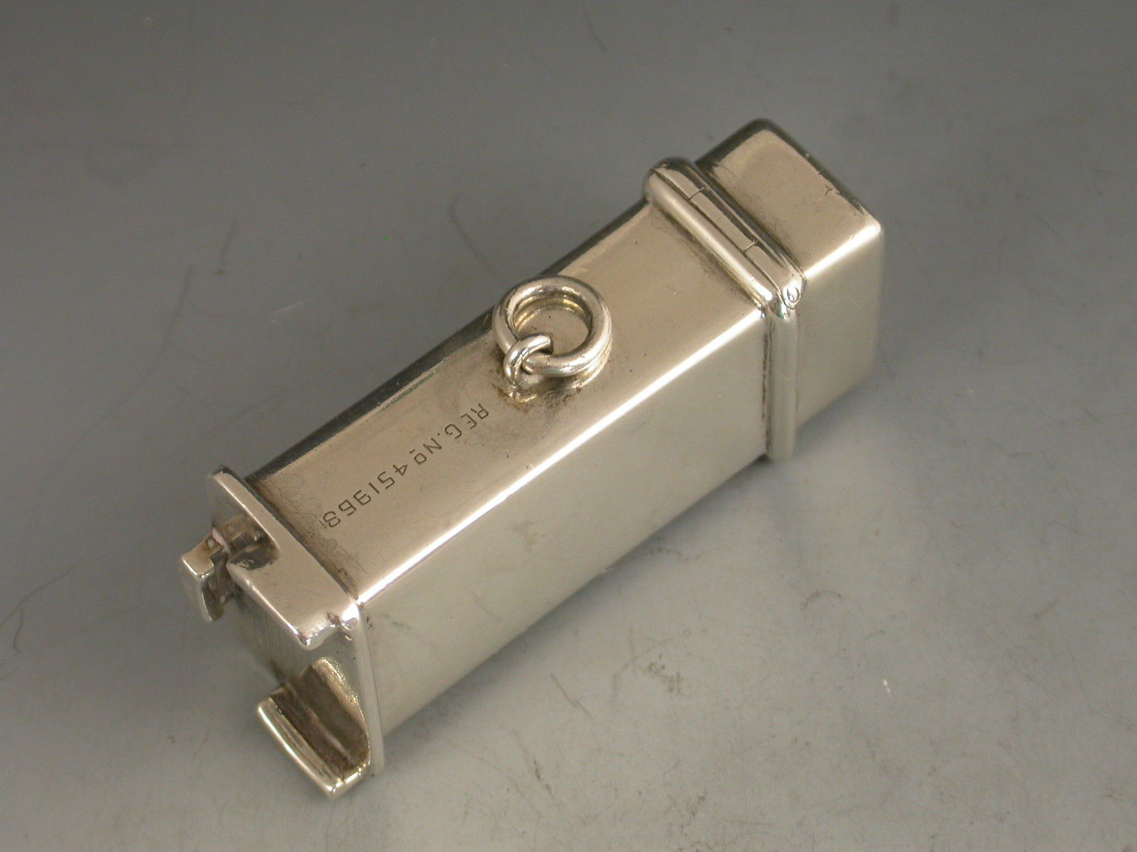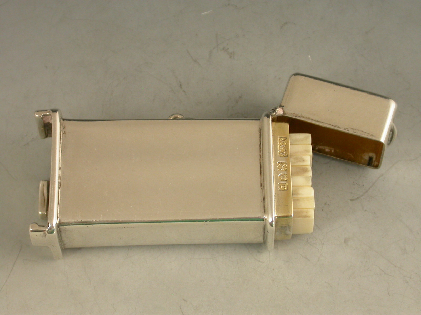 A very fine quality and rare Edwardian silver Shooting Butt Marker for eight guns, combined with a cartridge extractor to the base, of rectangular from with hinged flip-top lid, the silver gilt interior containing eight numbered bone or ivory pegs. Attached suspension ring.