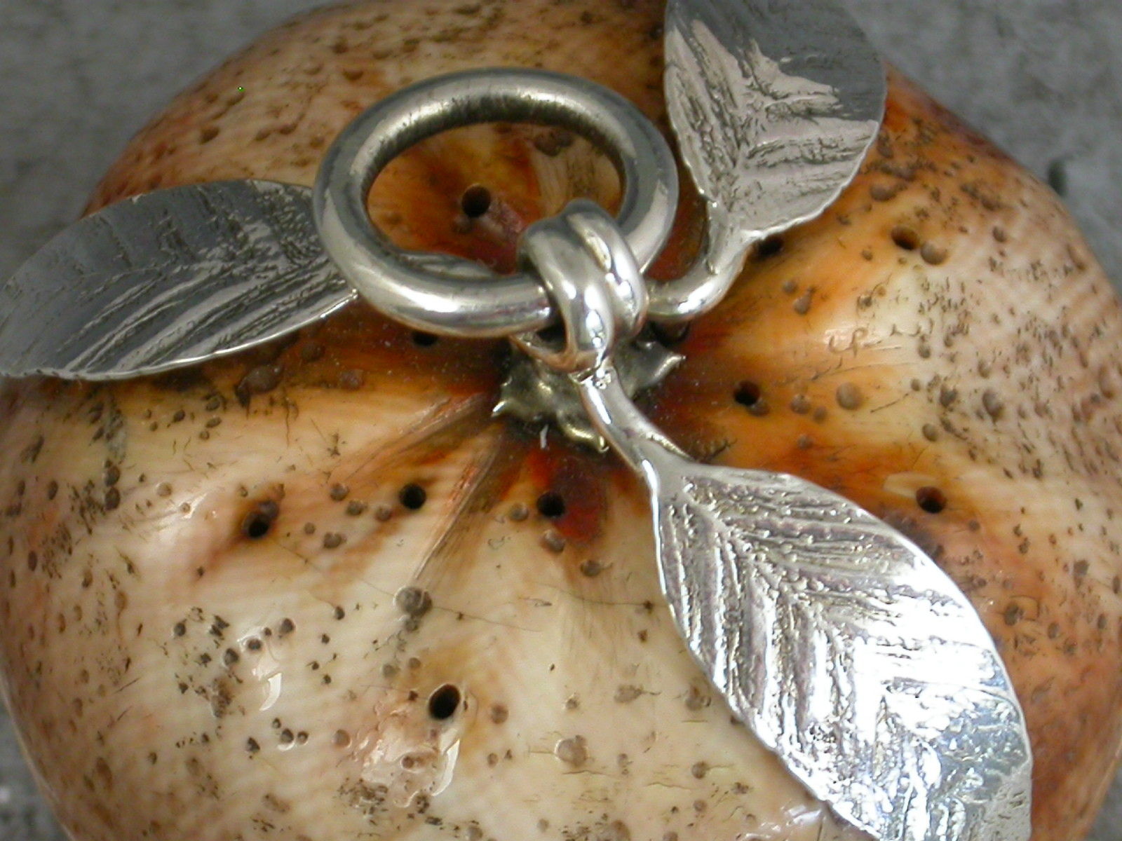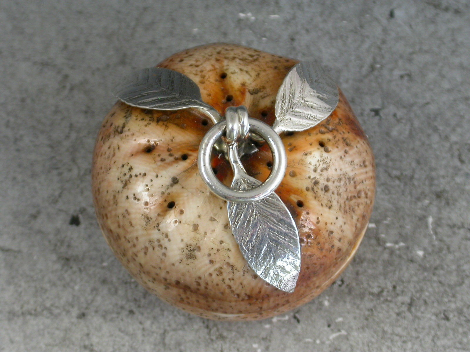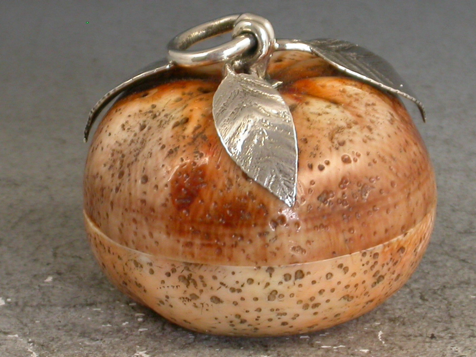 A fine quality Edwardian silver mounted Vinaigrette / Pomander of naturalistic form, made from an organic material, possibly ivory, in the form of a compressed orange or satsuma. The pierced screw off cover with three silver leaves and a suspension ring opening to reveal the silver gilt interior complete with original sponge.