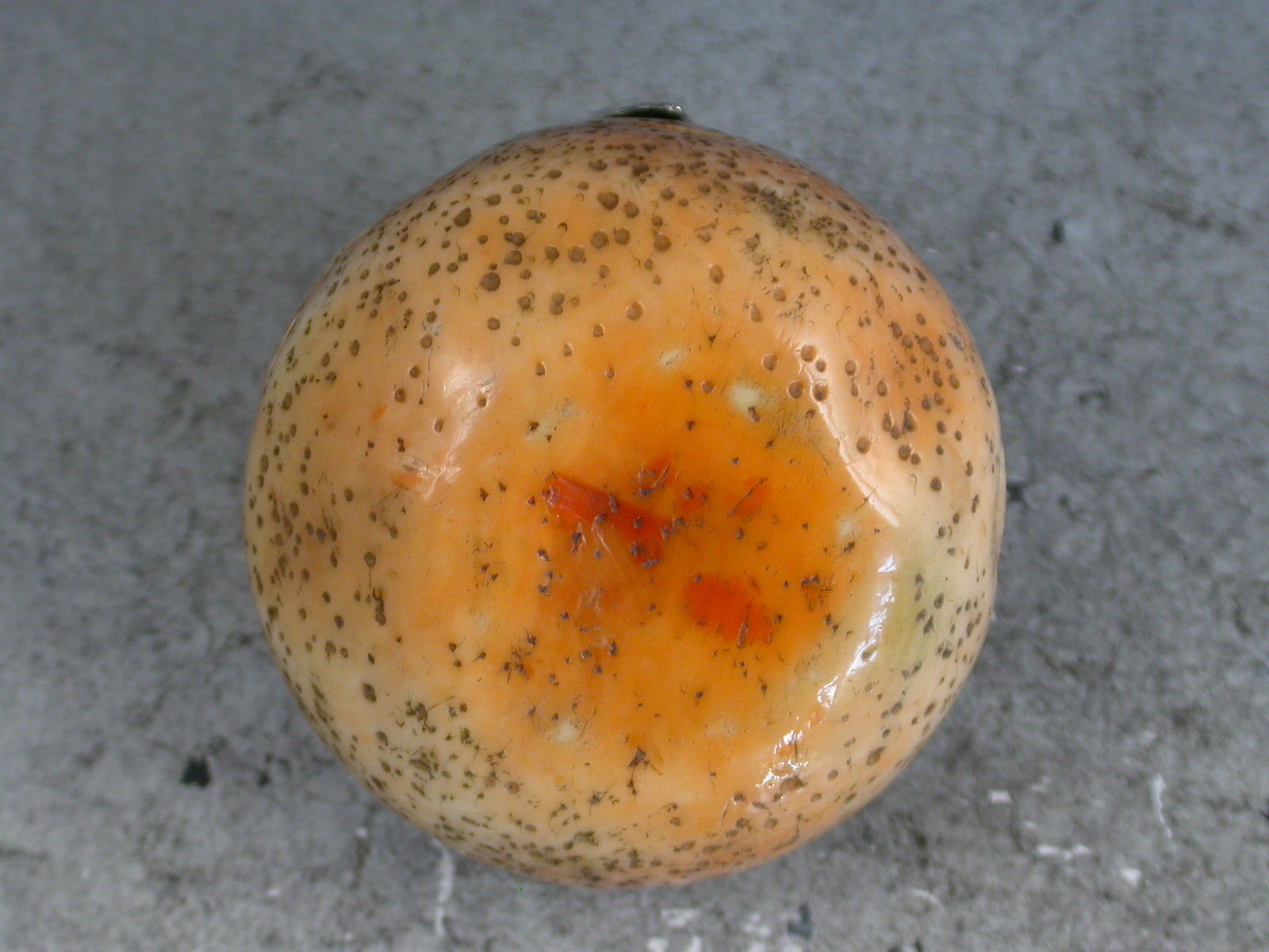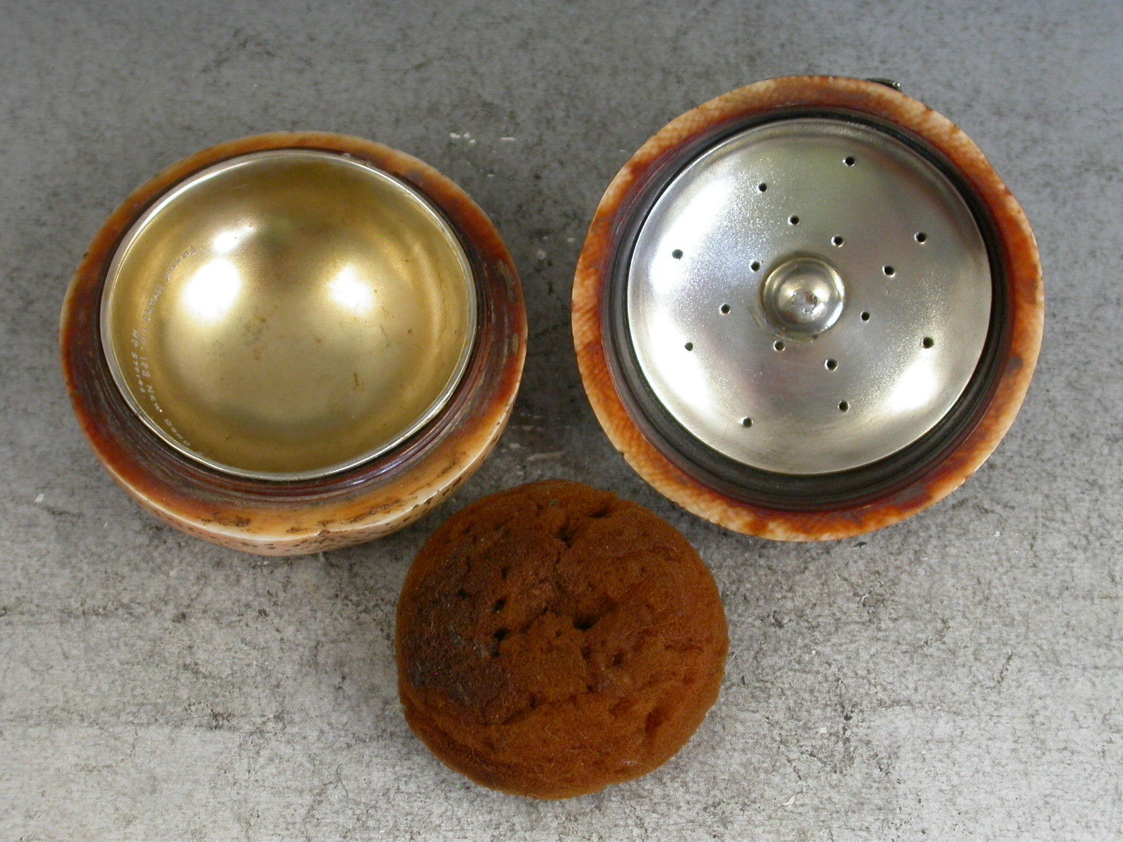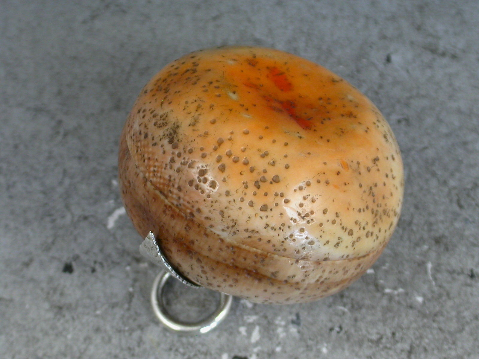 A fine quality Edwardian silver mounted Vinaigrette / Pomander of naturalistic form, made from an organic material, possibly ivory, in the form of a compressed orange or satsuma. The pierced screw off cover with three silver leaves and a suspension ring opening to reveal the silver gilt interior complete with original sponge.