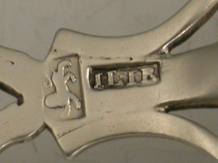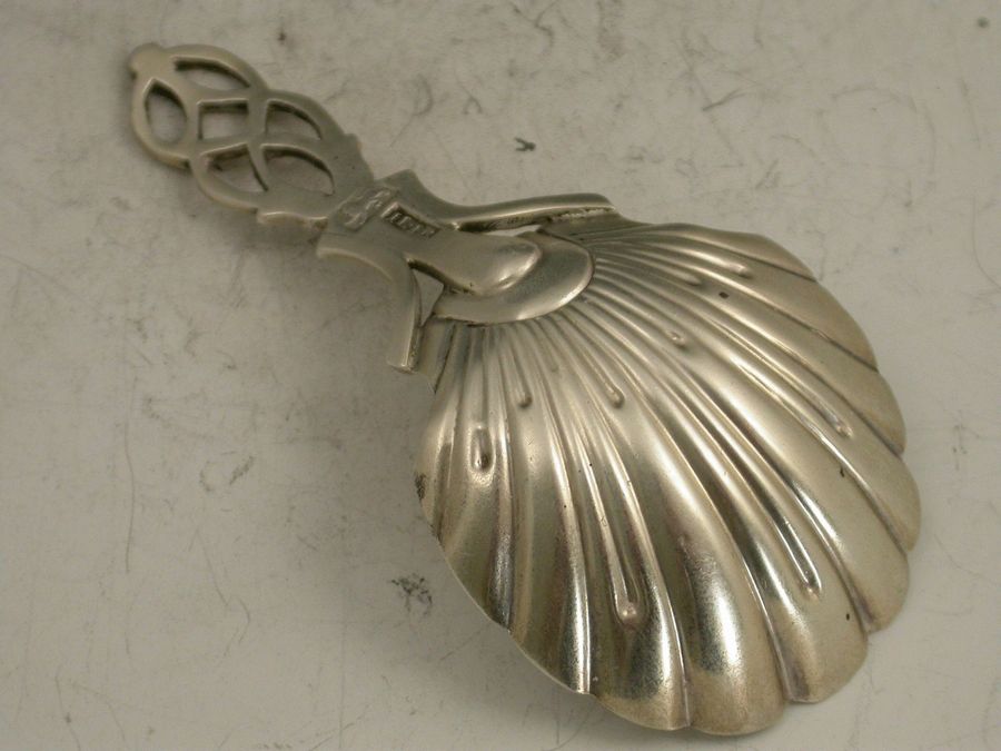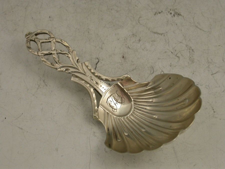 An extremely rare George III 18th century Provincial silver Caddy Spoon with shaped fluted scallop shell bowl, the pierced and entwined lattice work handle with bright cut engraved decoration. Contemporary initials engraved to base of handle.