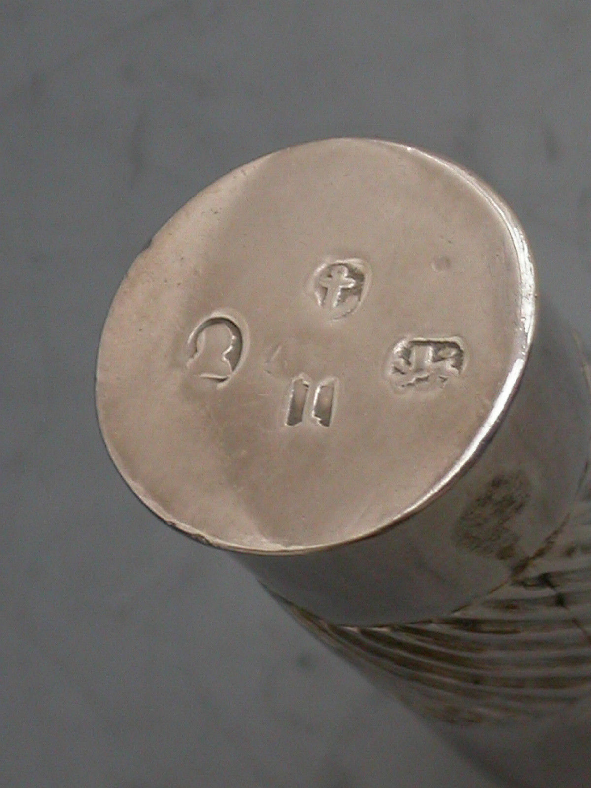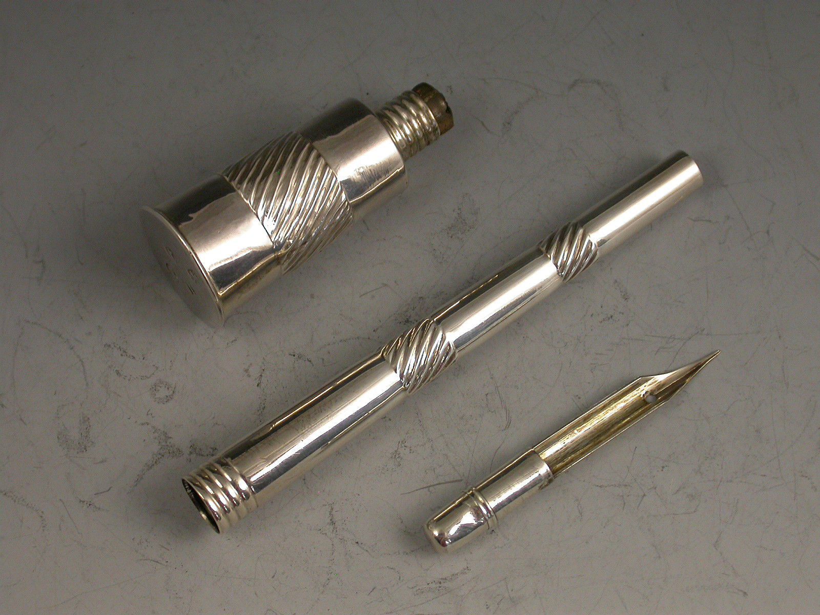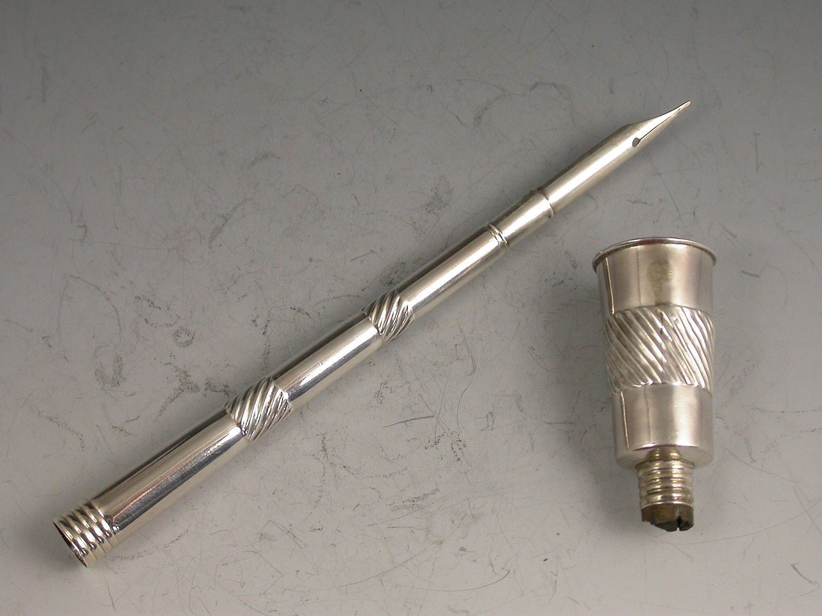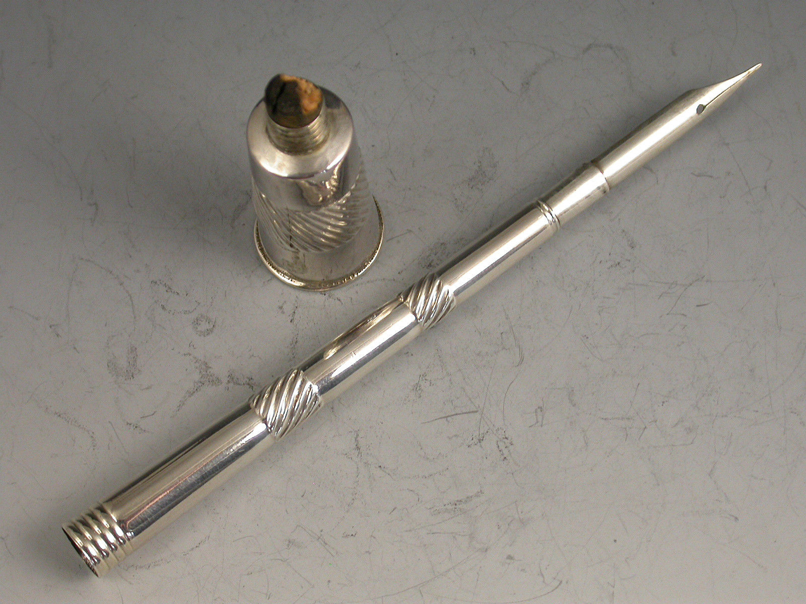 A rare George III silver Penner, the tapering Ink Pot with a band of fluted decoration that is repeated on the shaft, the pot has a threaded neck to accept the screw on Penner with reversible pull-out nib to the terminal, a cork stopper to inkwell.