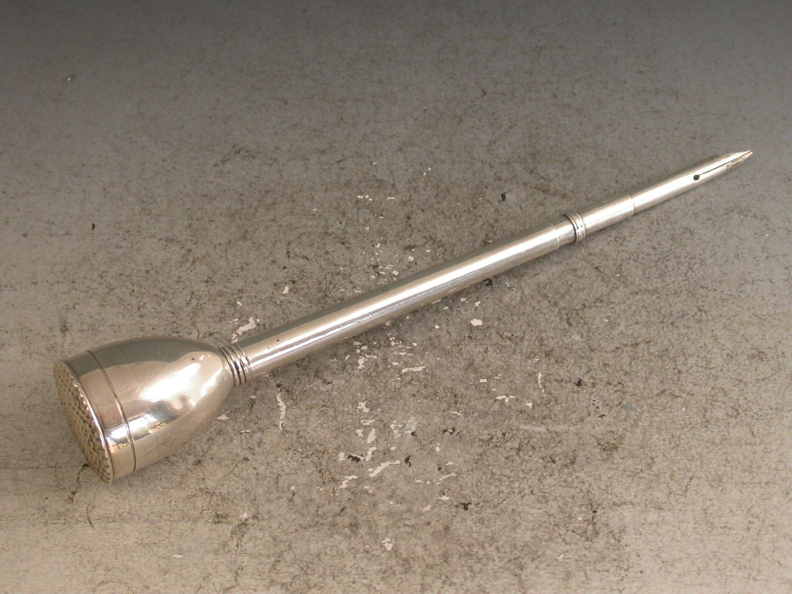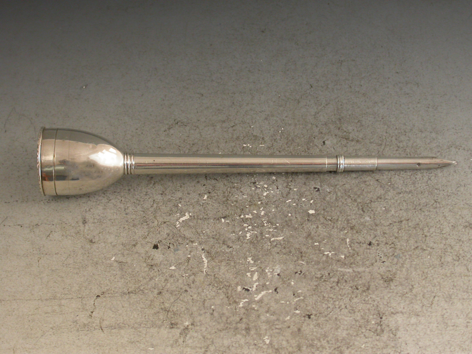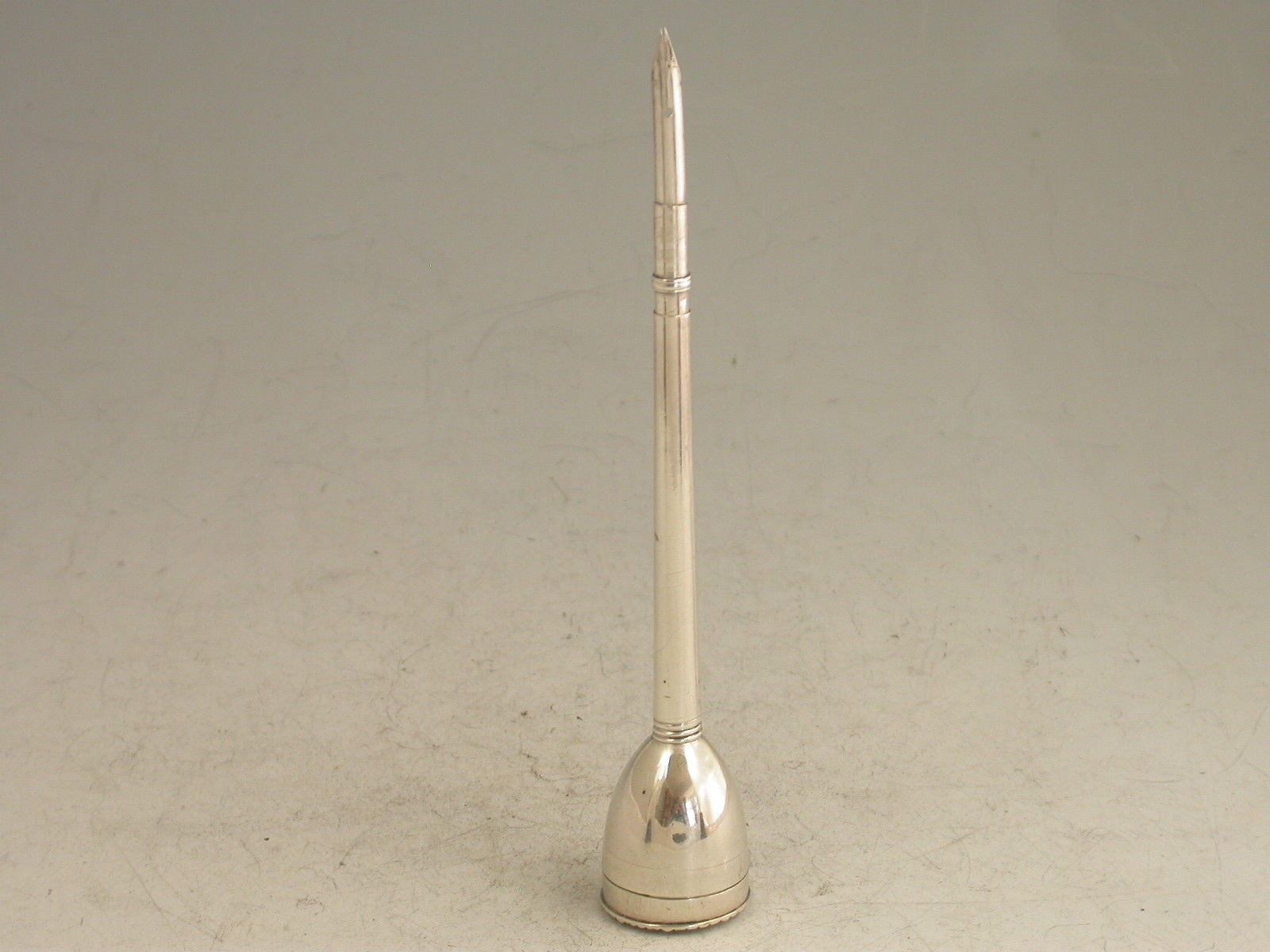 A fine and rare George III silver Penner, the pen shaft with reversible silver nib terminal screwing onto an inkwell of plain tapering form with silver mounted cork stopper, the inkwell base forming a wafer box, its lift off cover with hob-nail cut seal outer.