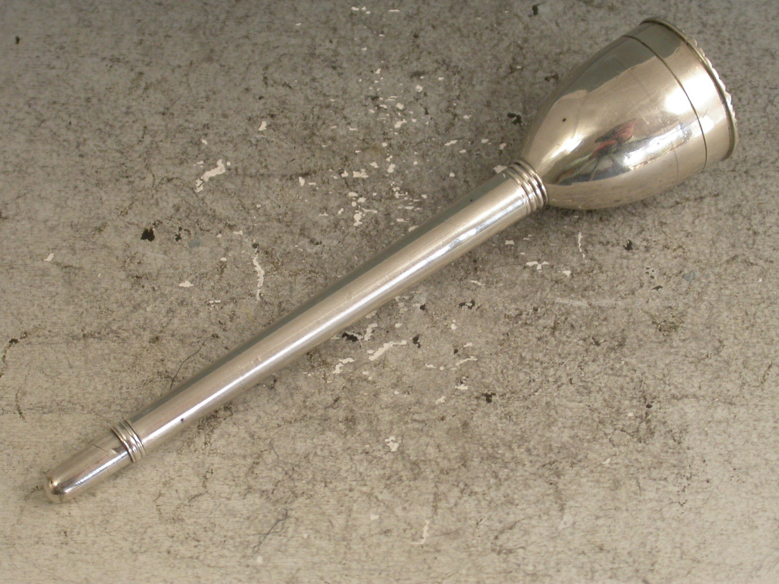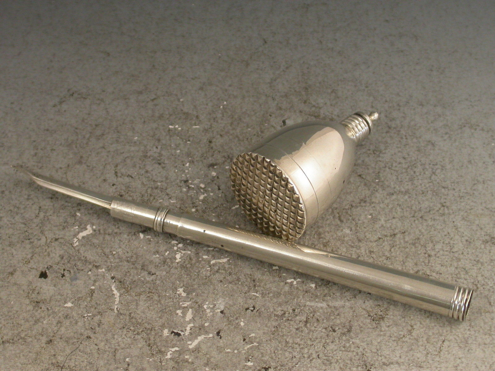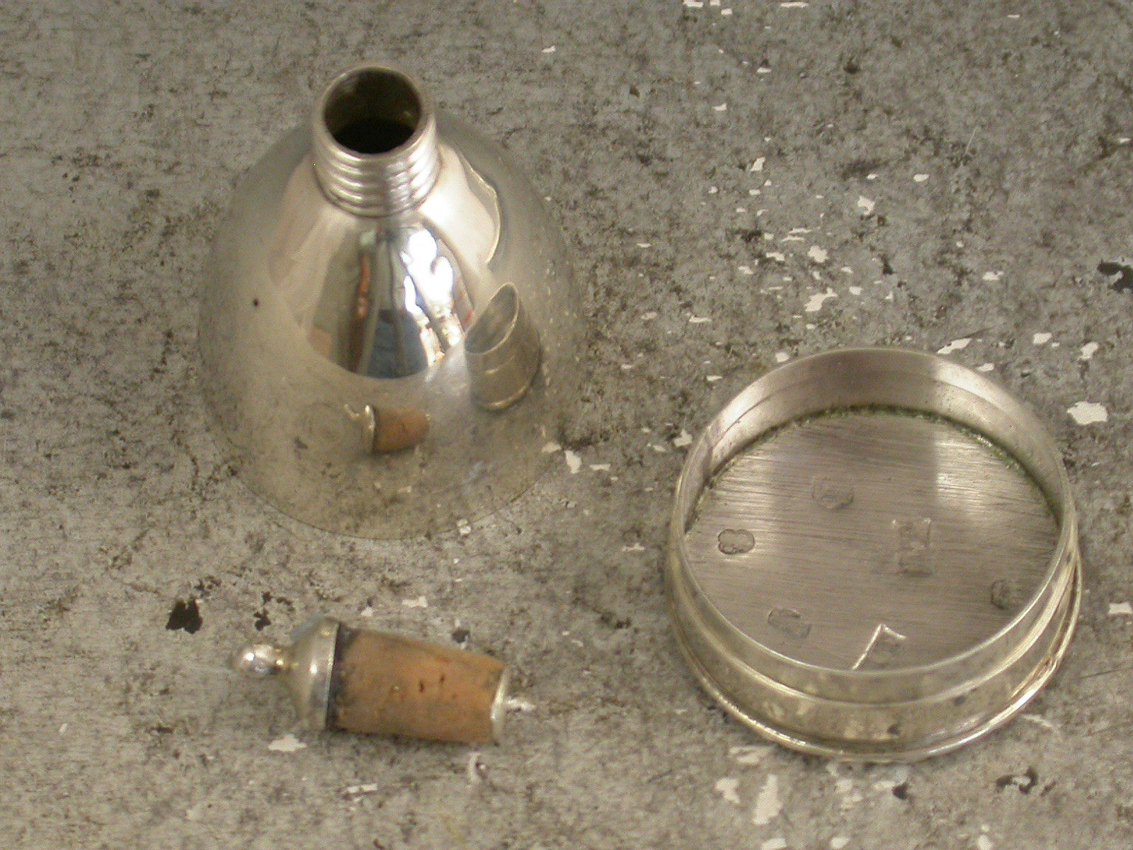 A fine and rare George III silver Penner, the pen shaft with reversible silver nib terminal screwing onto an inkwell of plain tapering form with silver mounted cork stopper, the inkwell base forming a wafer box, its lift off cover with hob-nail cut seal outer.