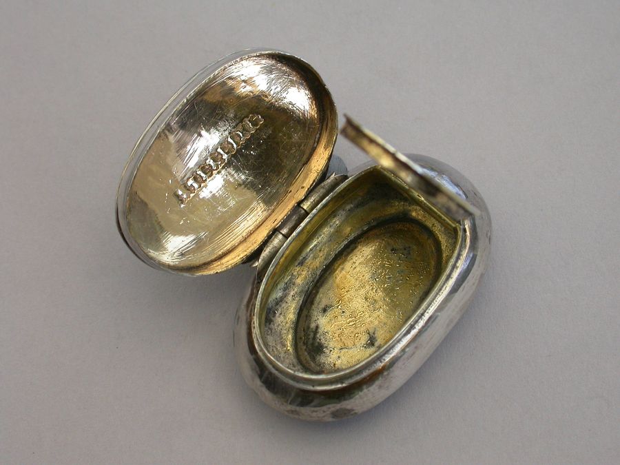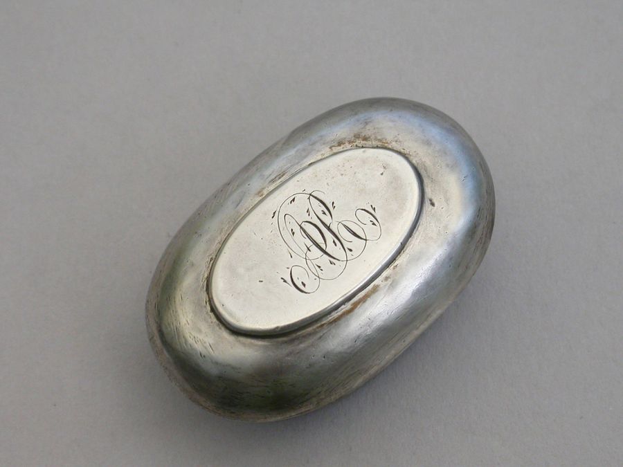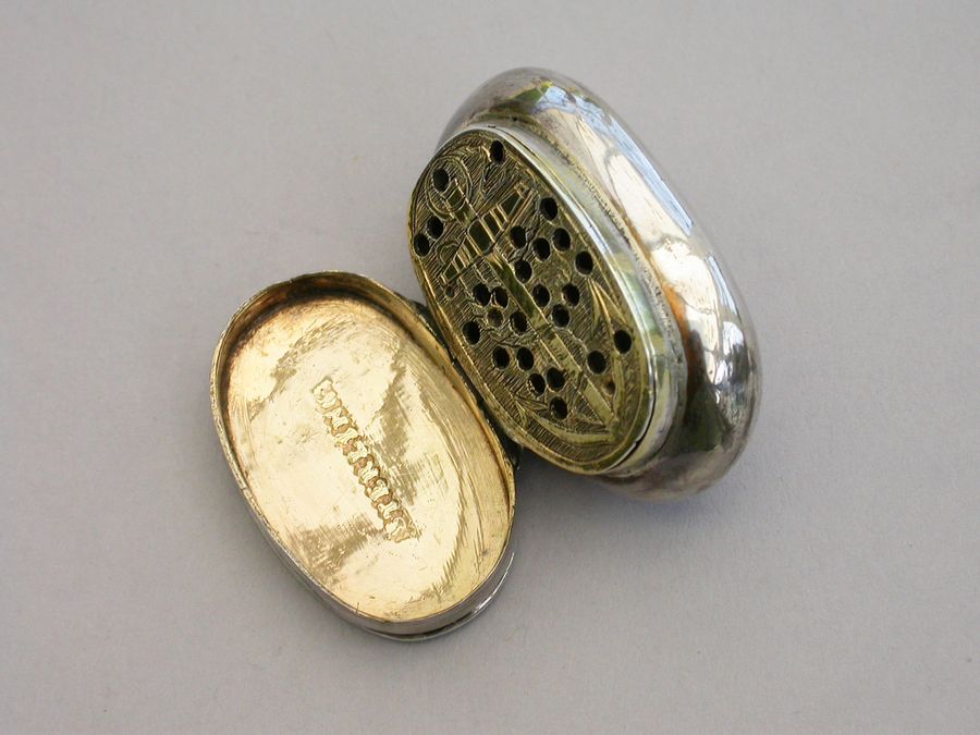 n extremely rare George III Irish Provincial silver Vinaigrette, with plain waisted oval form, the cover engraved with contemporary initials, silver gilt grille pierced with plain holes and engraved with a fouled anchor.