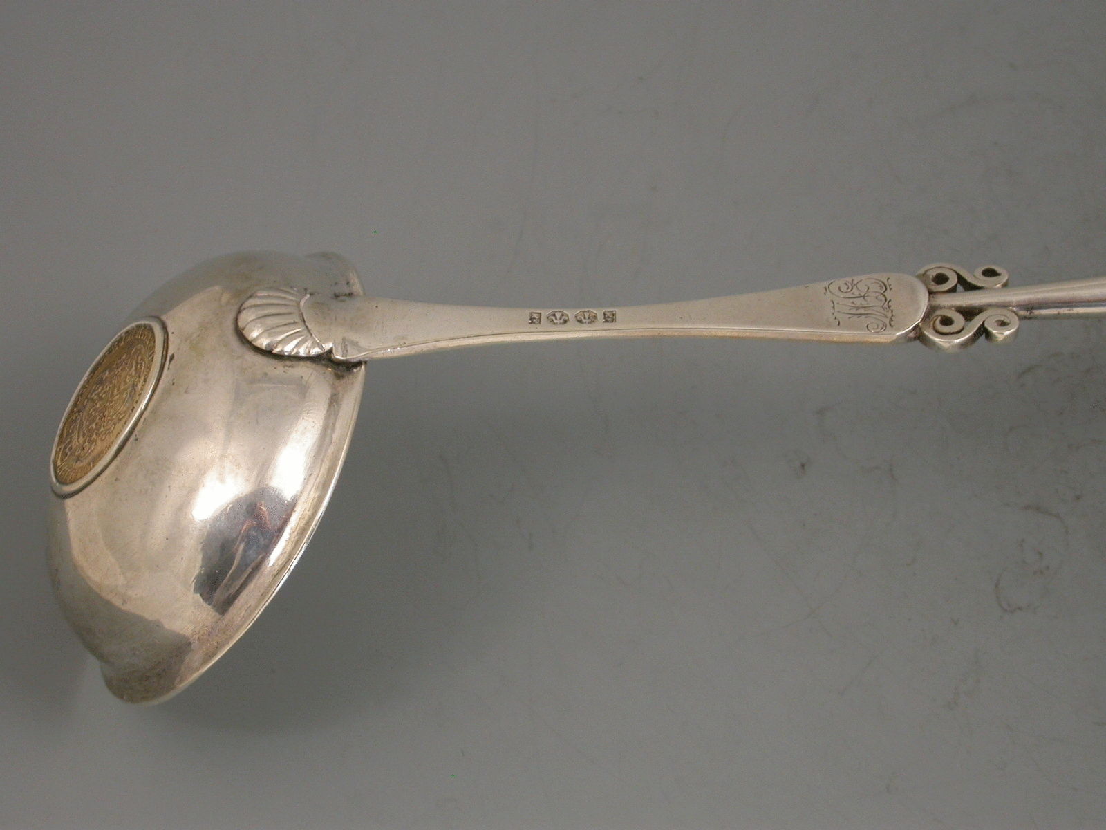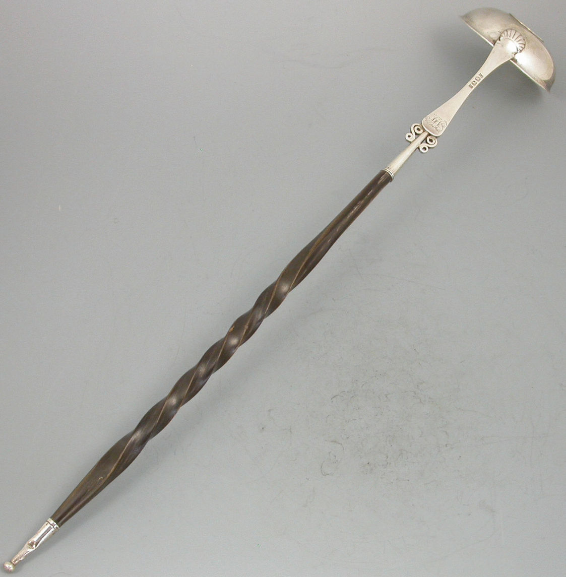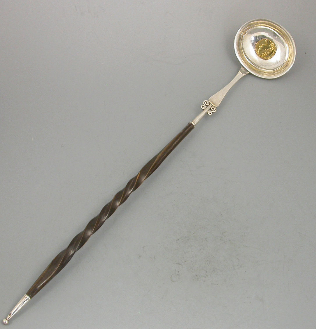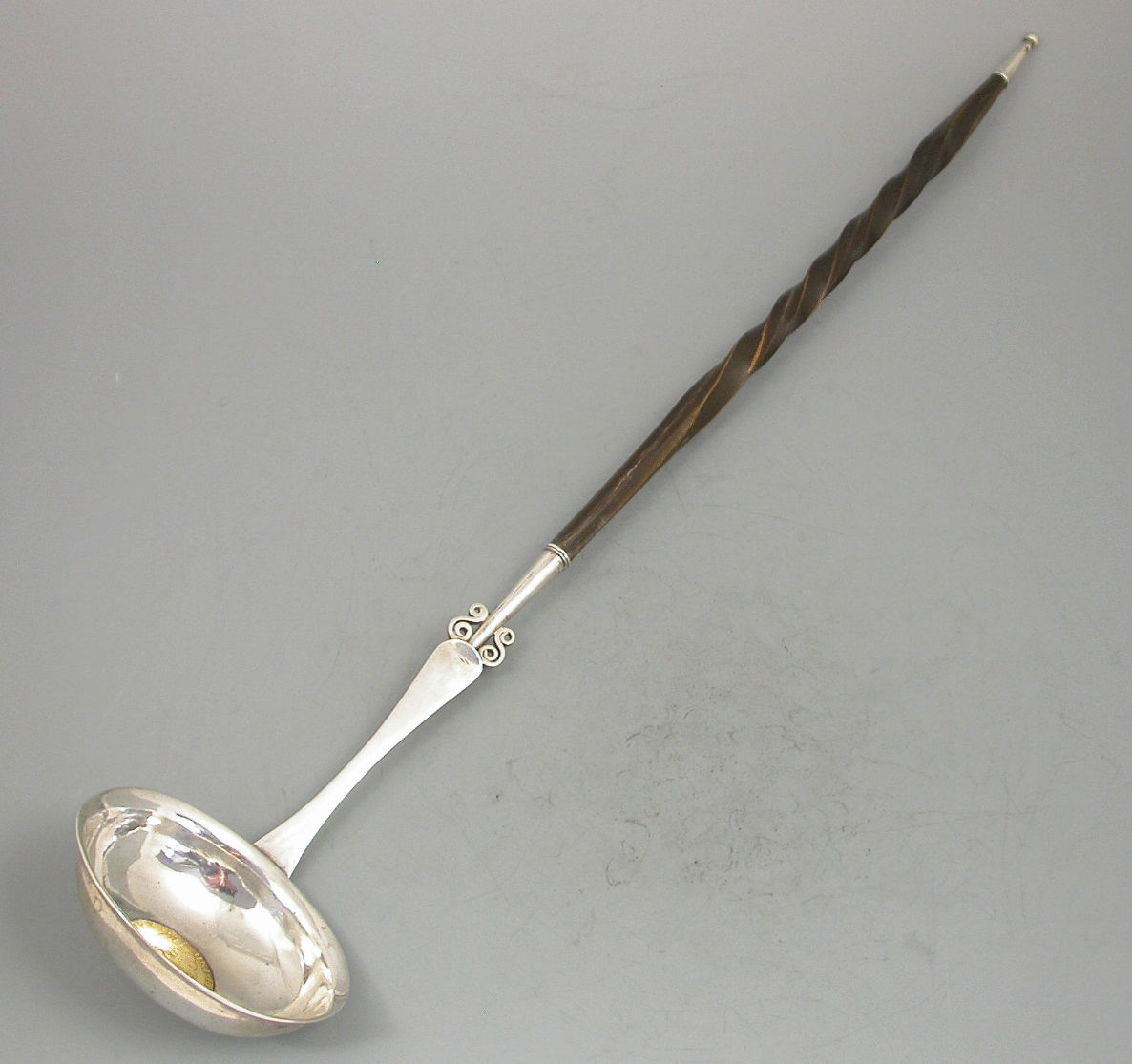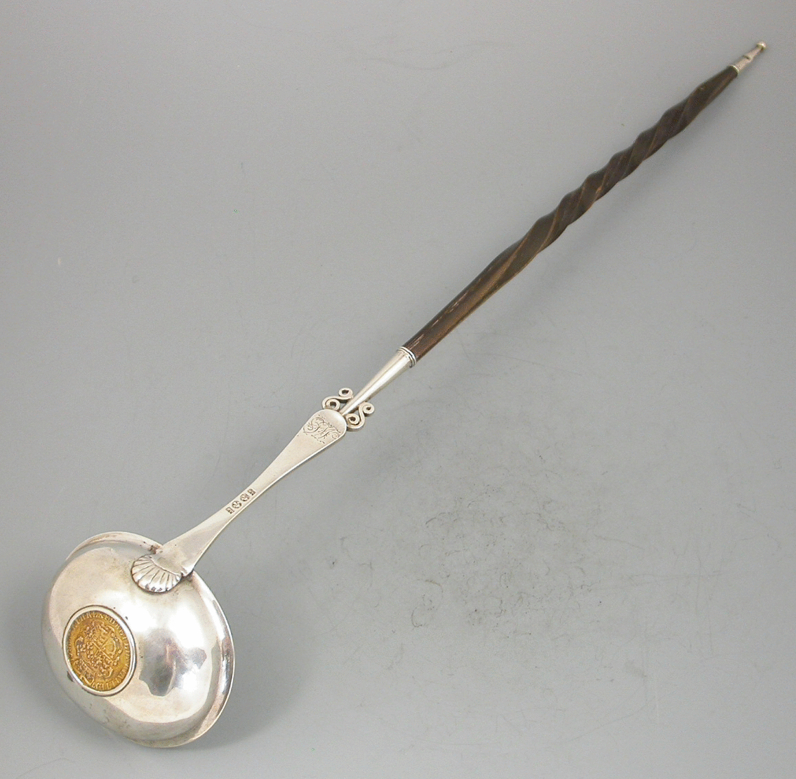 An extremely rare George III Scottish Provincial silver Toddy Ladle with twisted whale bone handle, the stem with twin scroll decoration and shell terminal, the oval bowl inset with the George III gold Guinea. The stem engraved with script initials.