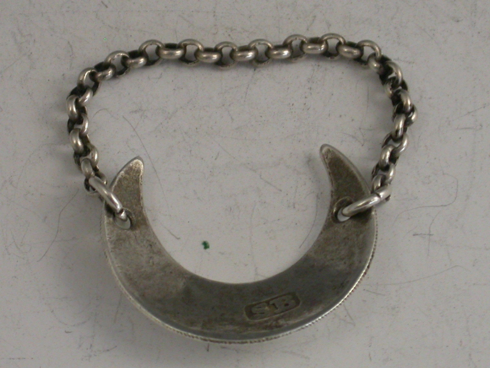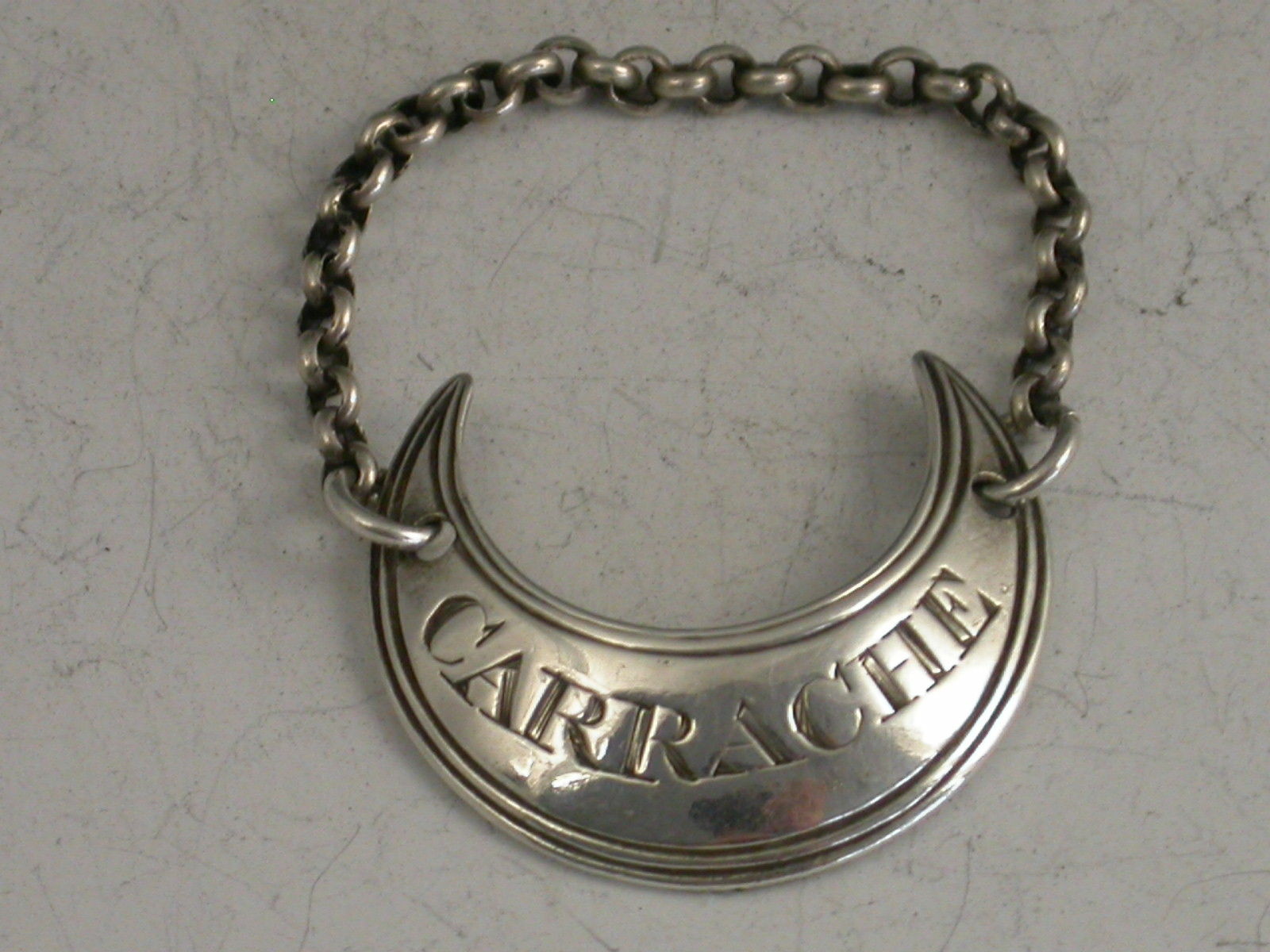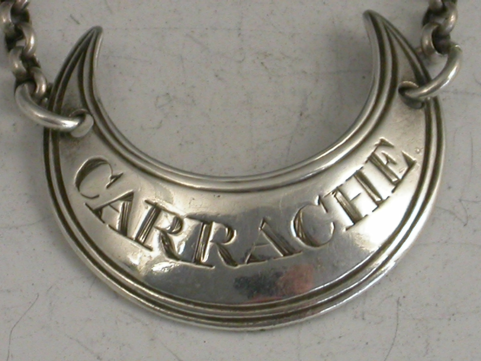 An extremely rare George III silver Sauce Label of crescent form with reeded border, incised for Carrache.