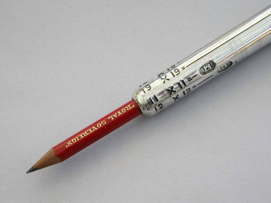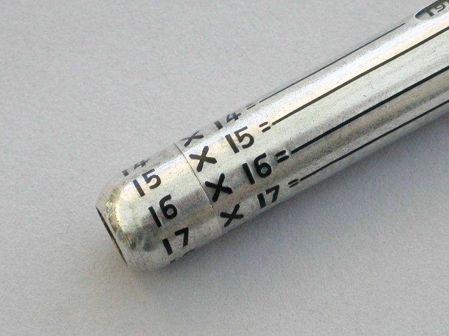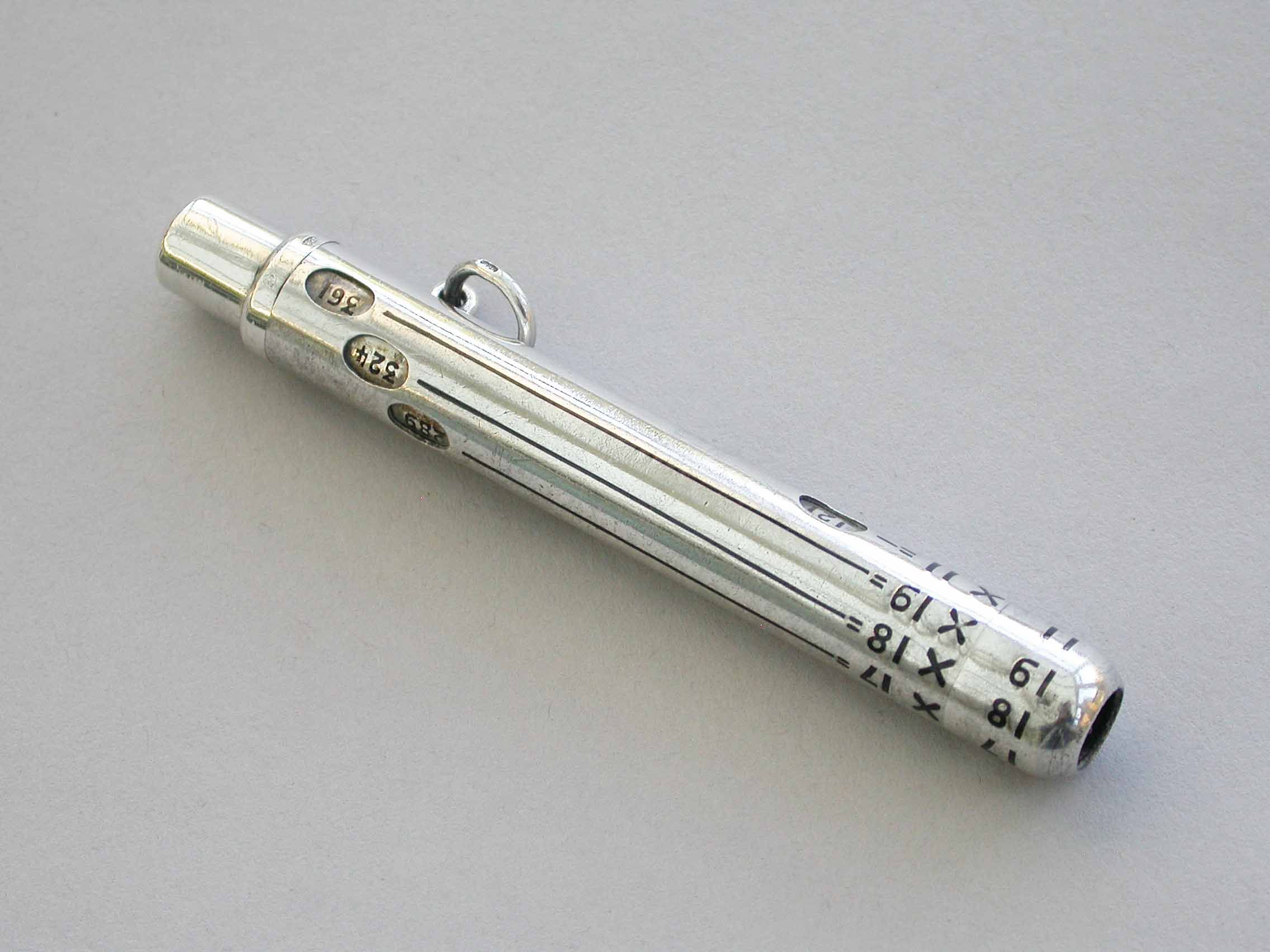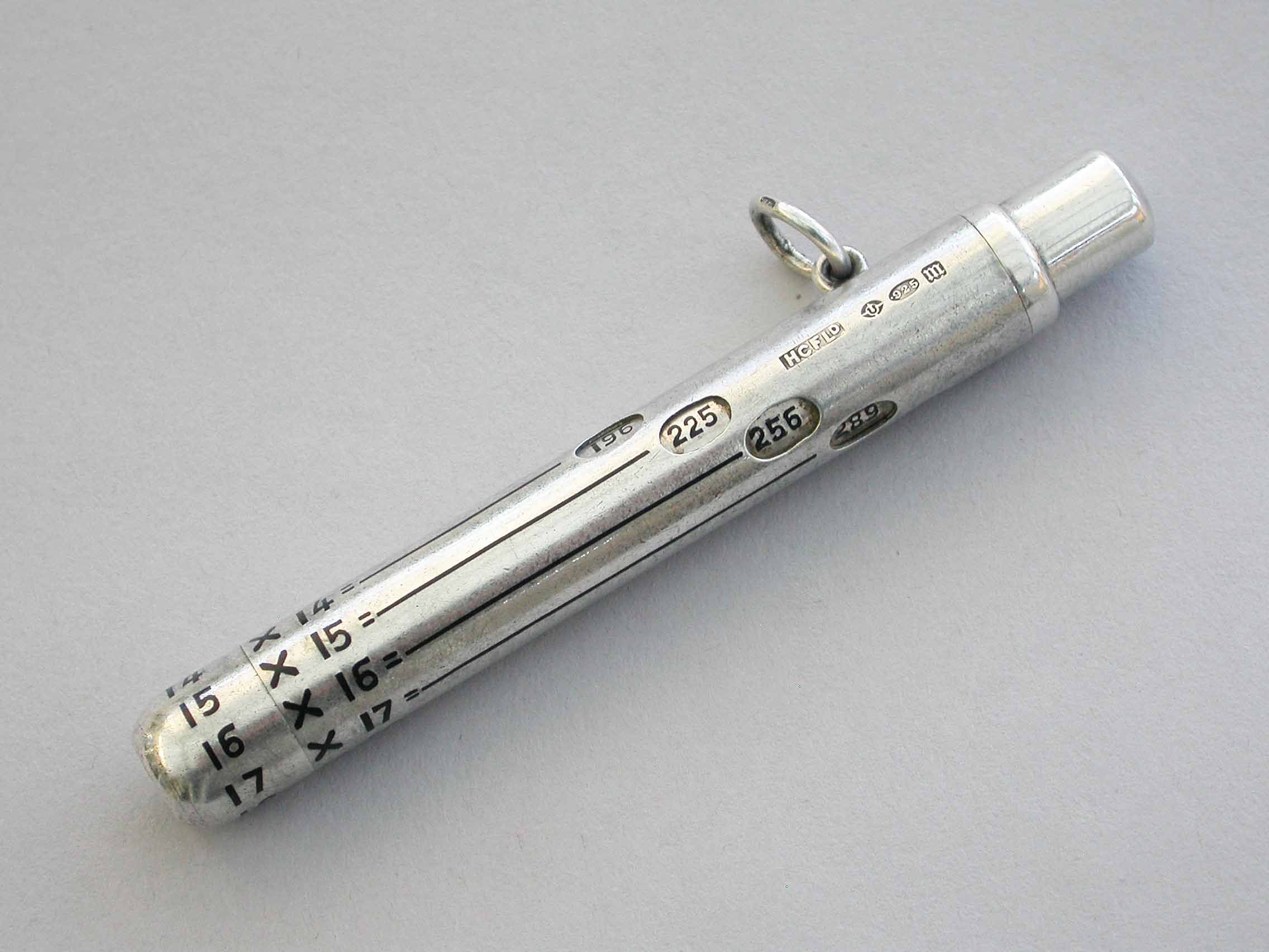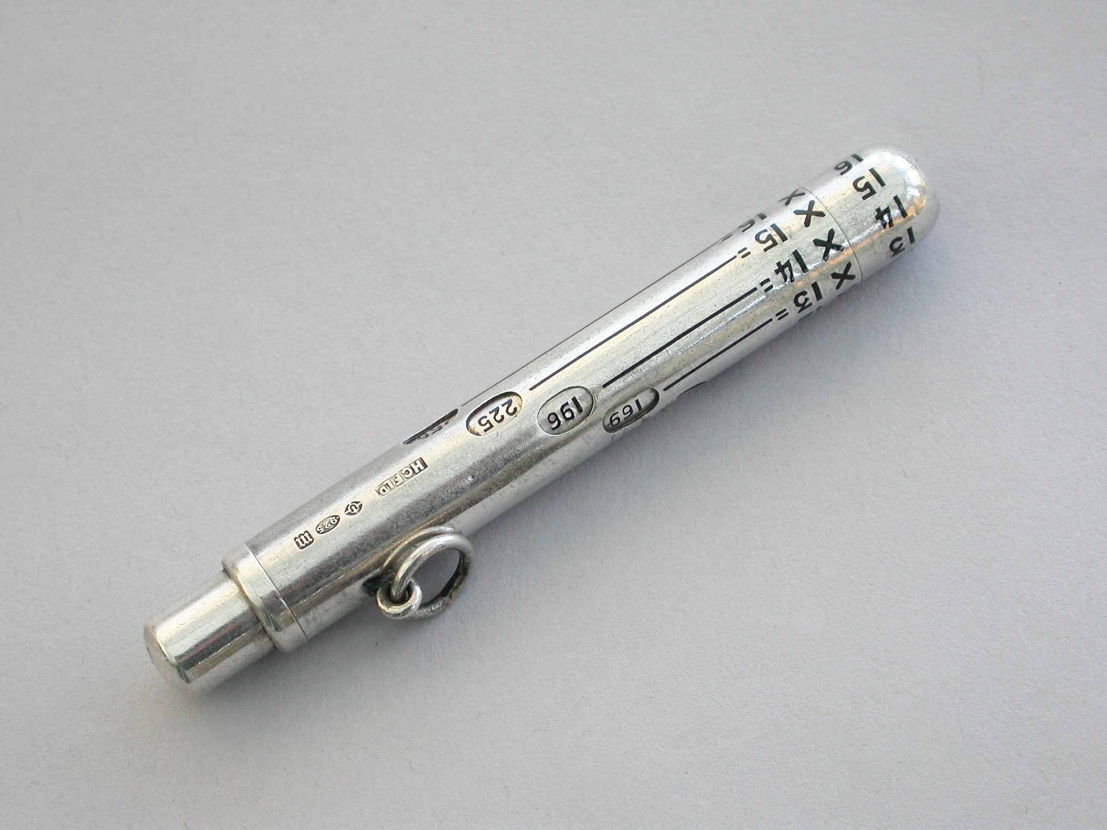 A rare and unusual George V silver and enamel gravity drop cedar Pencil with attached suspension ring, the body enamelled with 11 to 19 times tables. Revolving the terminal provides the answers in the oval windows.