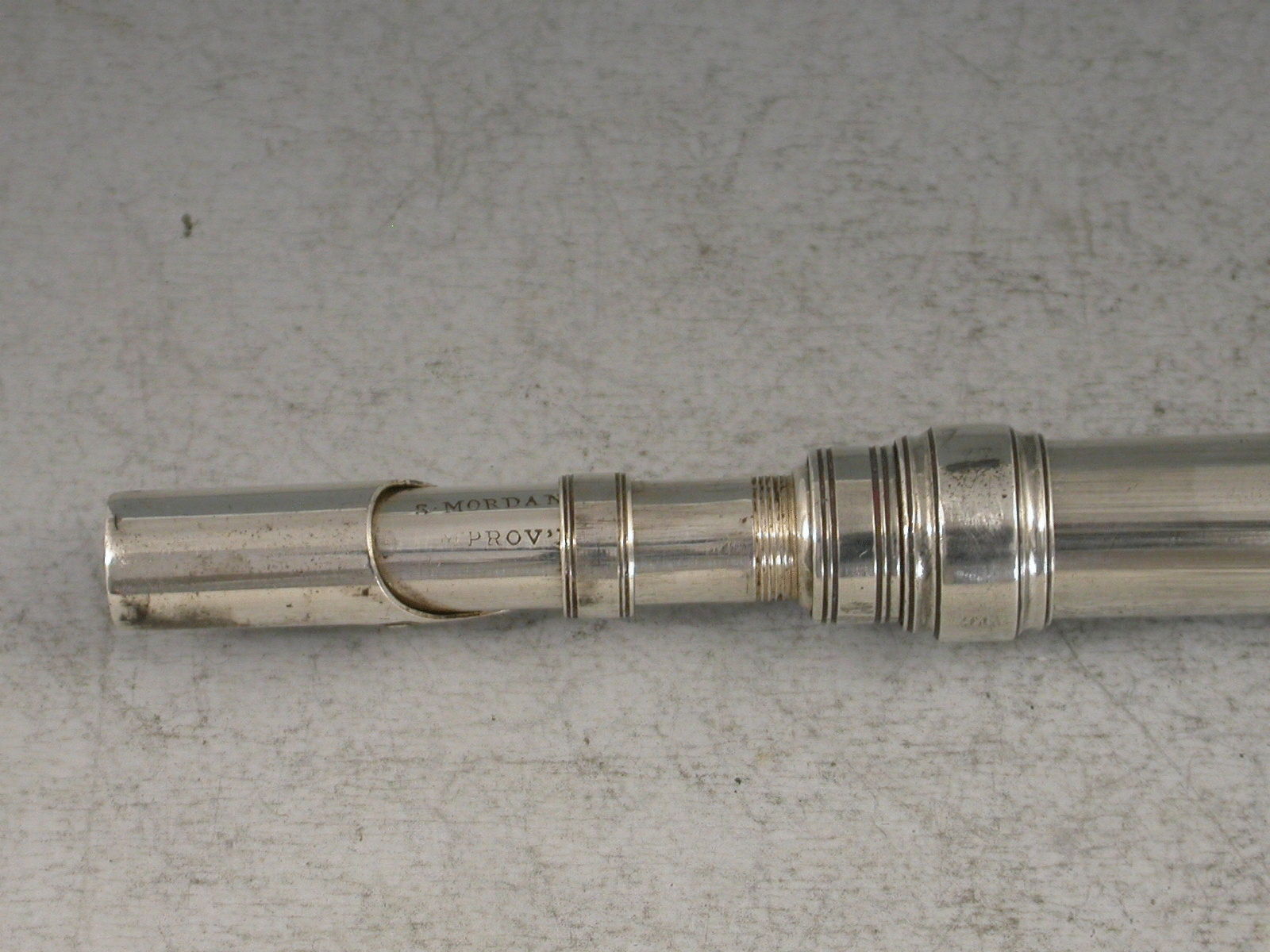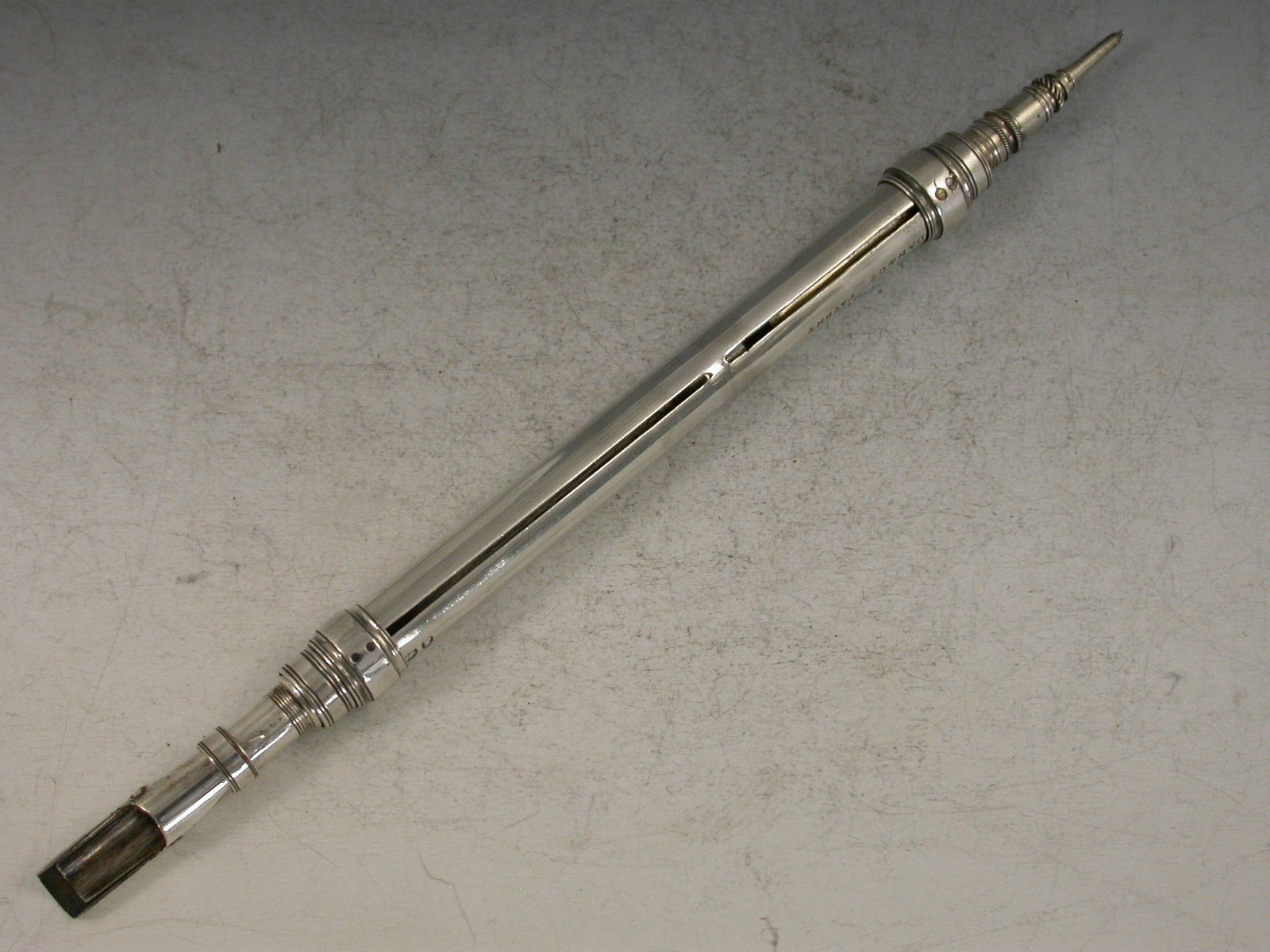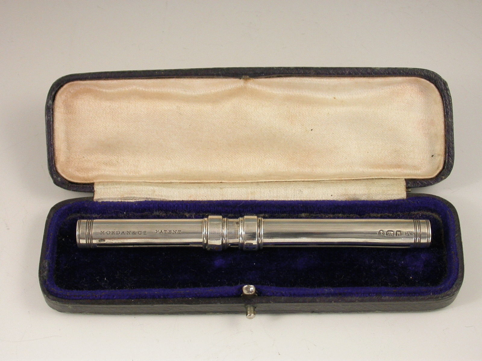 An extremely rare George IV silver double open ended pen and pencil combination with Bramah type nib holder, the plain cylindrical body with reeded decoration. Stamped Mordan & Co. Patent. The nib holder stamped S.Mordan’s improv’d. Also clearly hallmarked with the ‘S.M’ makers mark and date letter ‘h’ for London 1823.