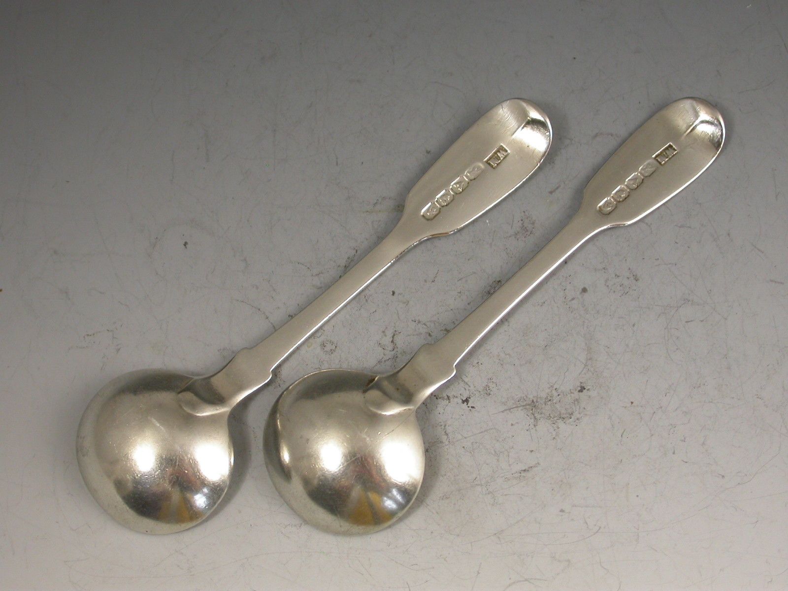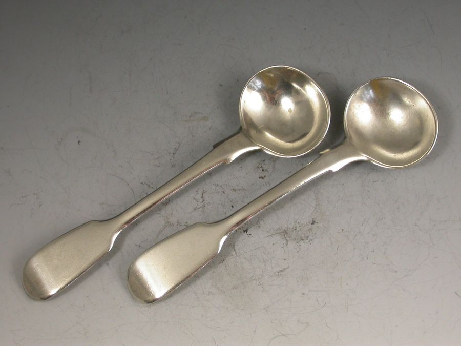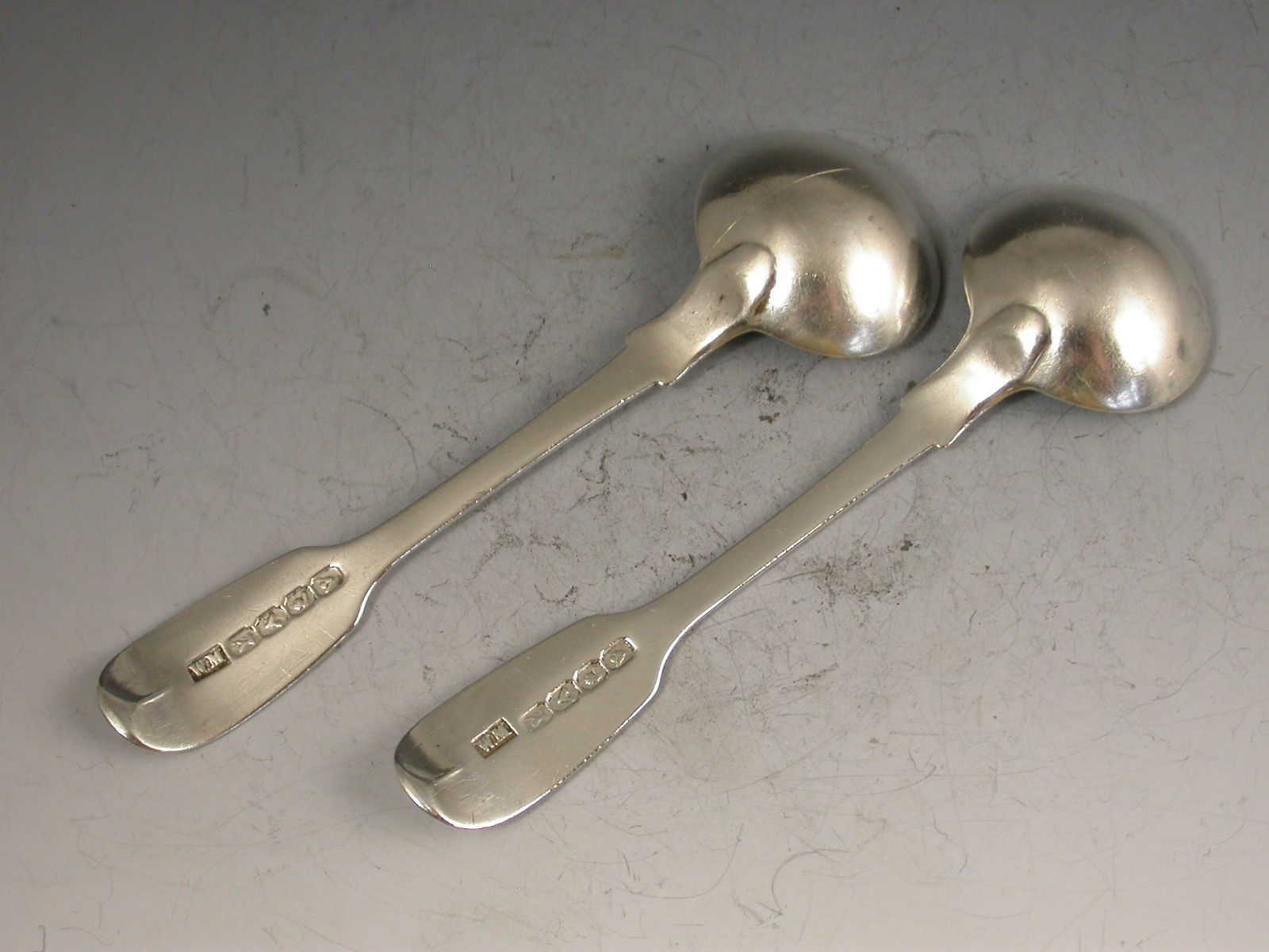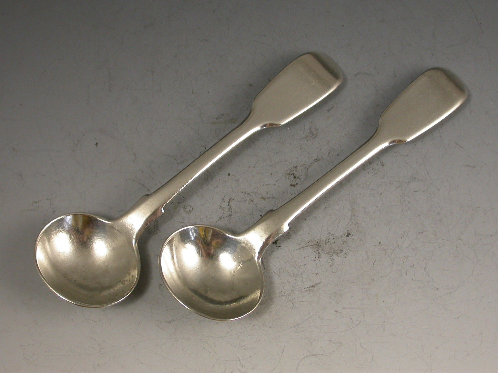An extremely rare pair of early 19th century Cape silver Salt Spoons of plain fiddle pattern with sideways oval bowls.