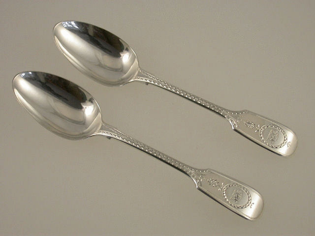 A rare pair of Victorian fiddle pattern Teaspoons with unusual and very fine bright cut engraved decoration including oval cartouches to the handles and bottom of the bowls, a crest depicting a Boar to the handles.
