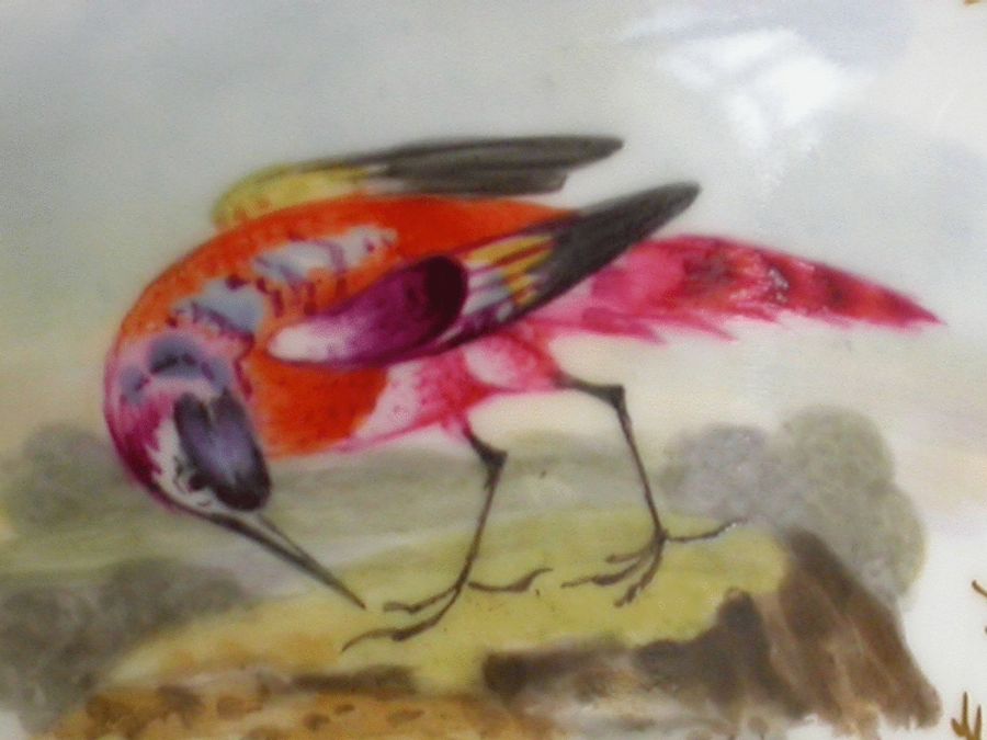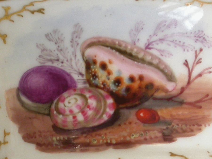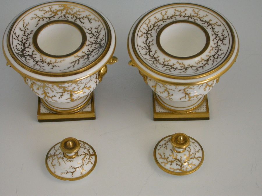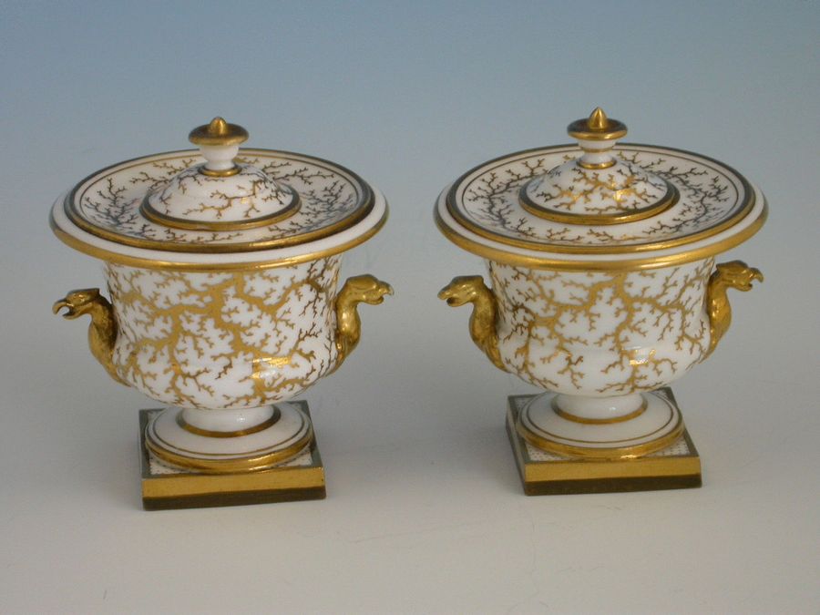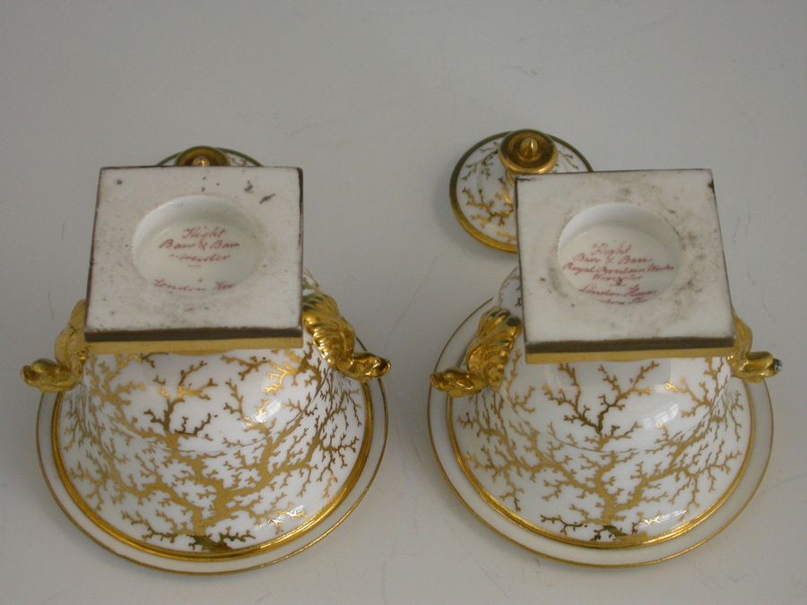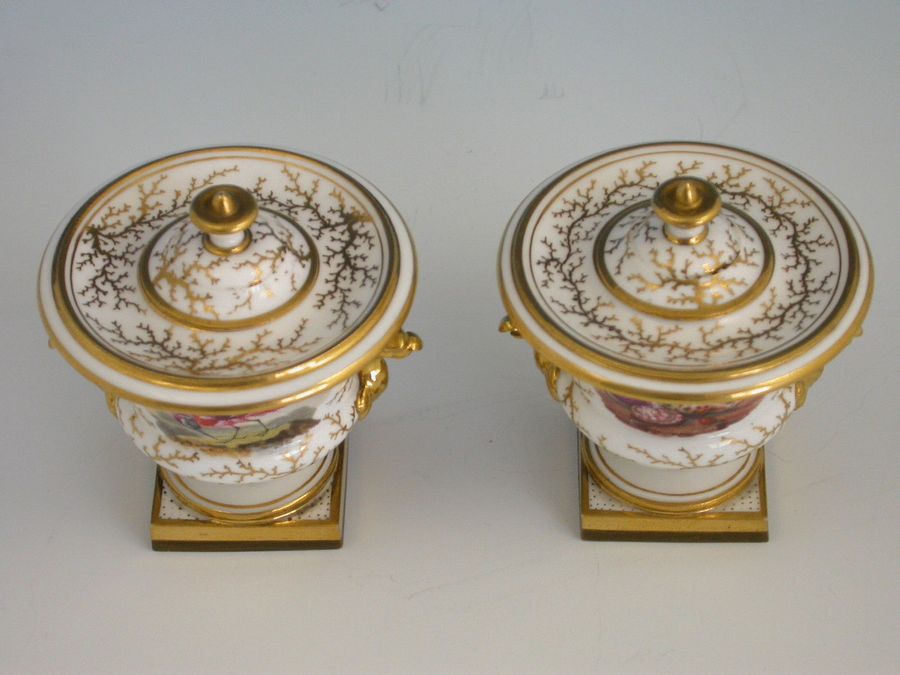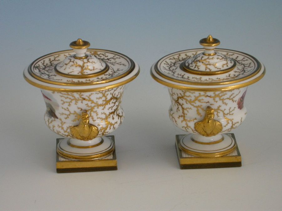 An extremely rare pair of Flight, Barr & Barr Worcester urn shape miniature Ink Wells and Covers standing on pedestal bases with gilt rims and eagles head handles, one painted with an exotic bird the other with shells, on seaweed grounds.