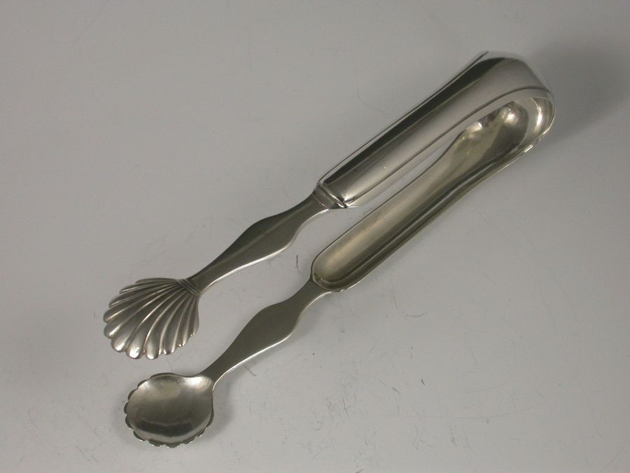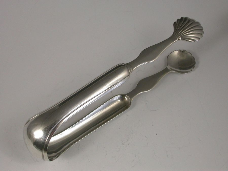 A fine and rare pair of Georgian Scottish Provincial silver Sugar Tongs with curved shaped handles and large scallop shell bowls. The bow engraved with initials.