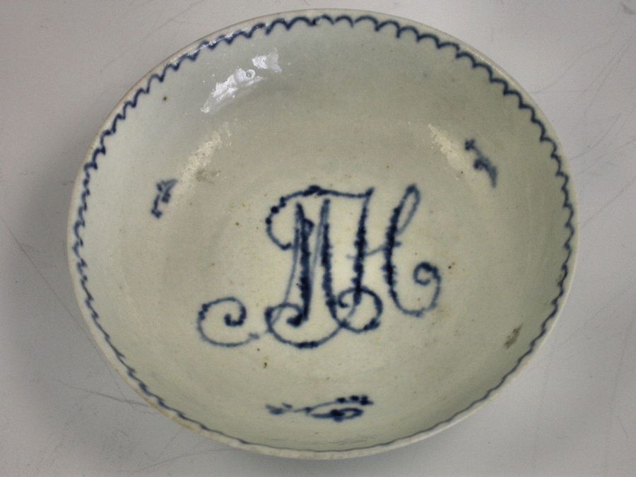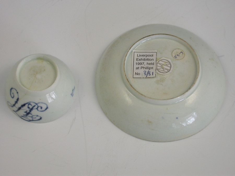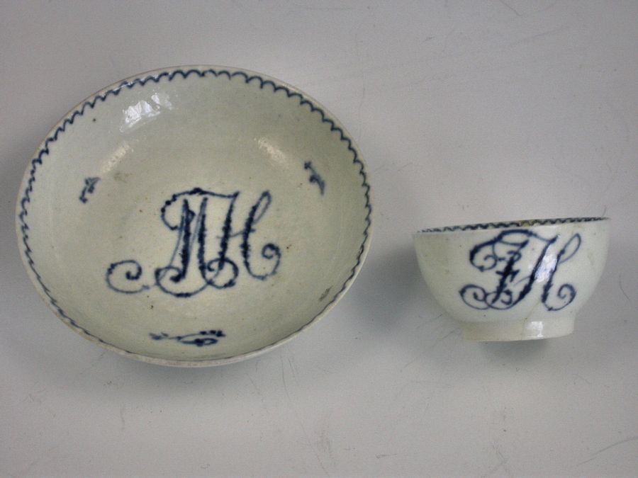 An extremely rare John & Jane Pennington, Liverpool, miniature Tea Bowl & Saucer of plain shape, painted in under-glaze blue with family monograms ‘FH' & 'MH’ within a loop border.