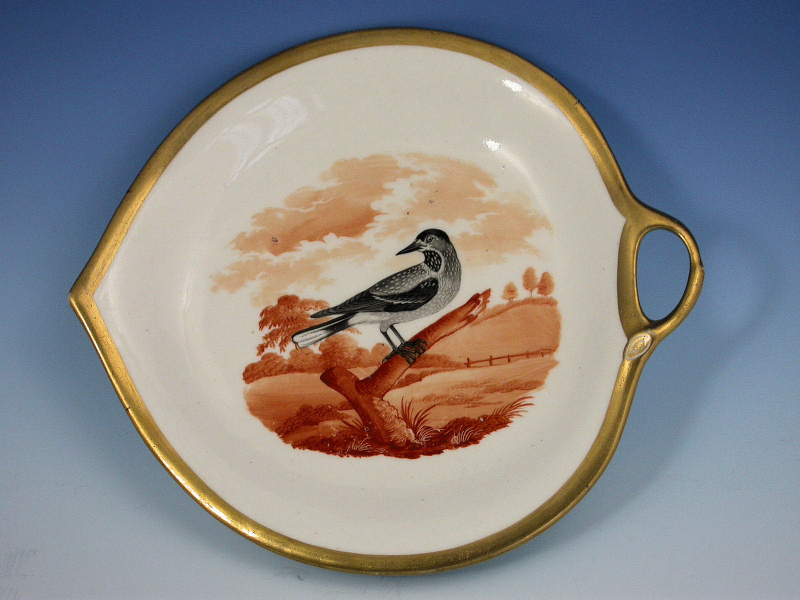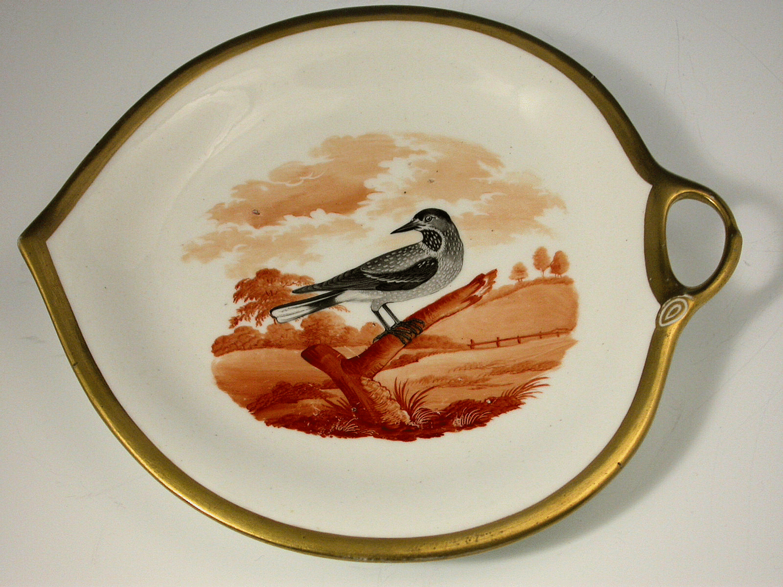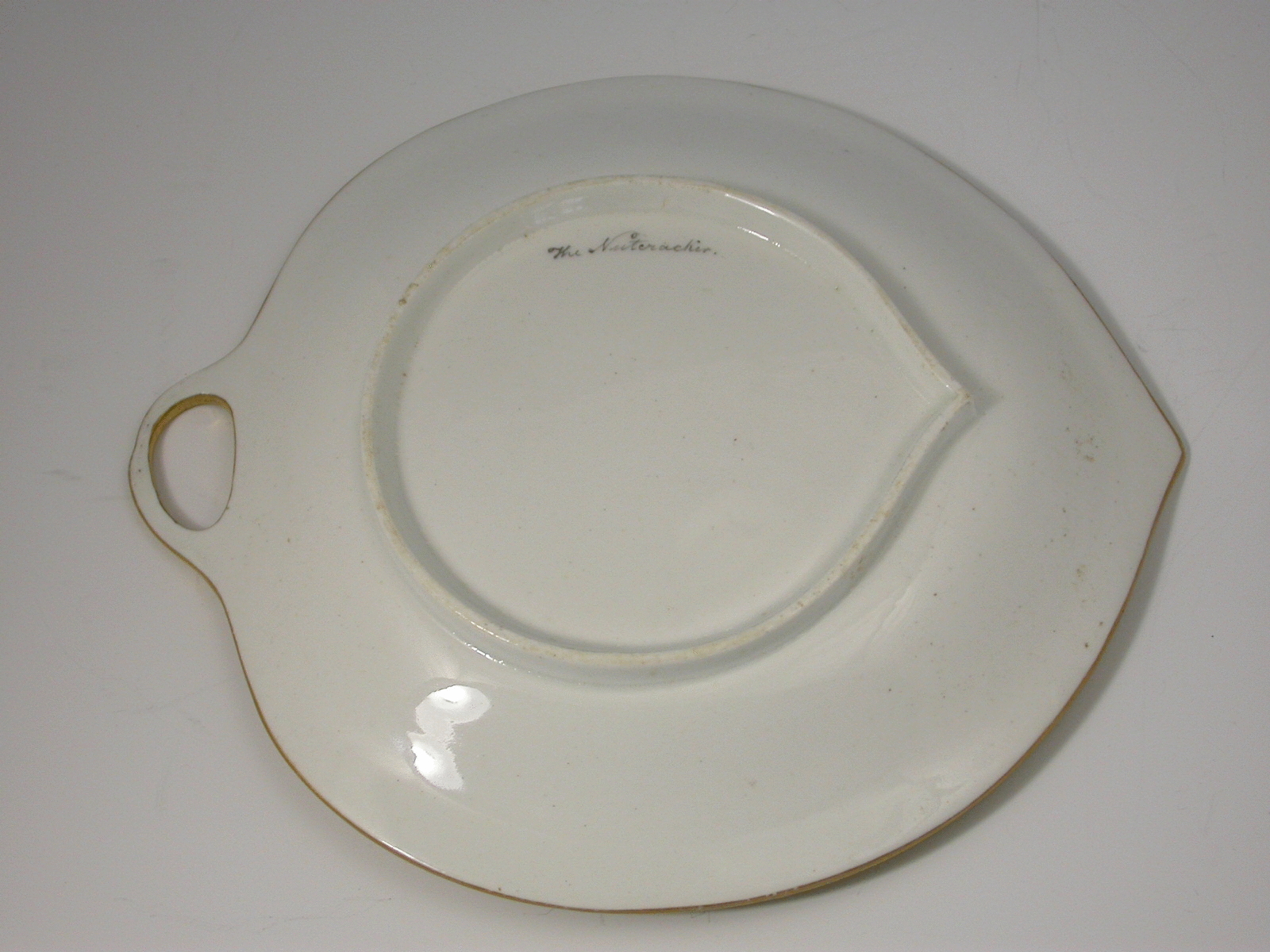 A rare Ridgway leaf shaped dish with side handle and gilded border, painted with the Nutcracker.