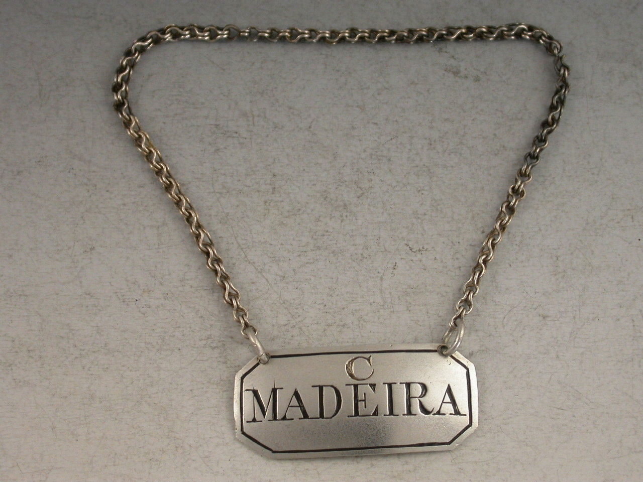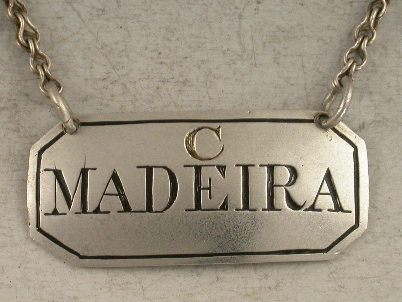 A rare Georgian Scottish Provincial silver Wine Label of narrow rectangular form with single reeded border, incised and niello filled for C.Madeira, probably for Cape or possibly Cercial Madeira.