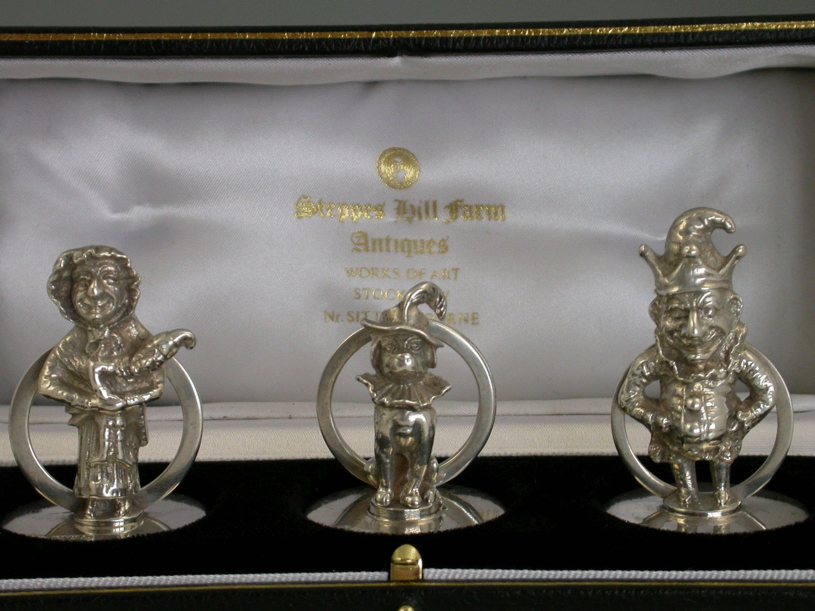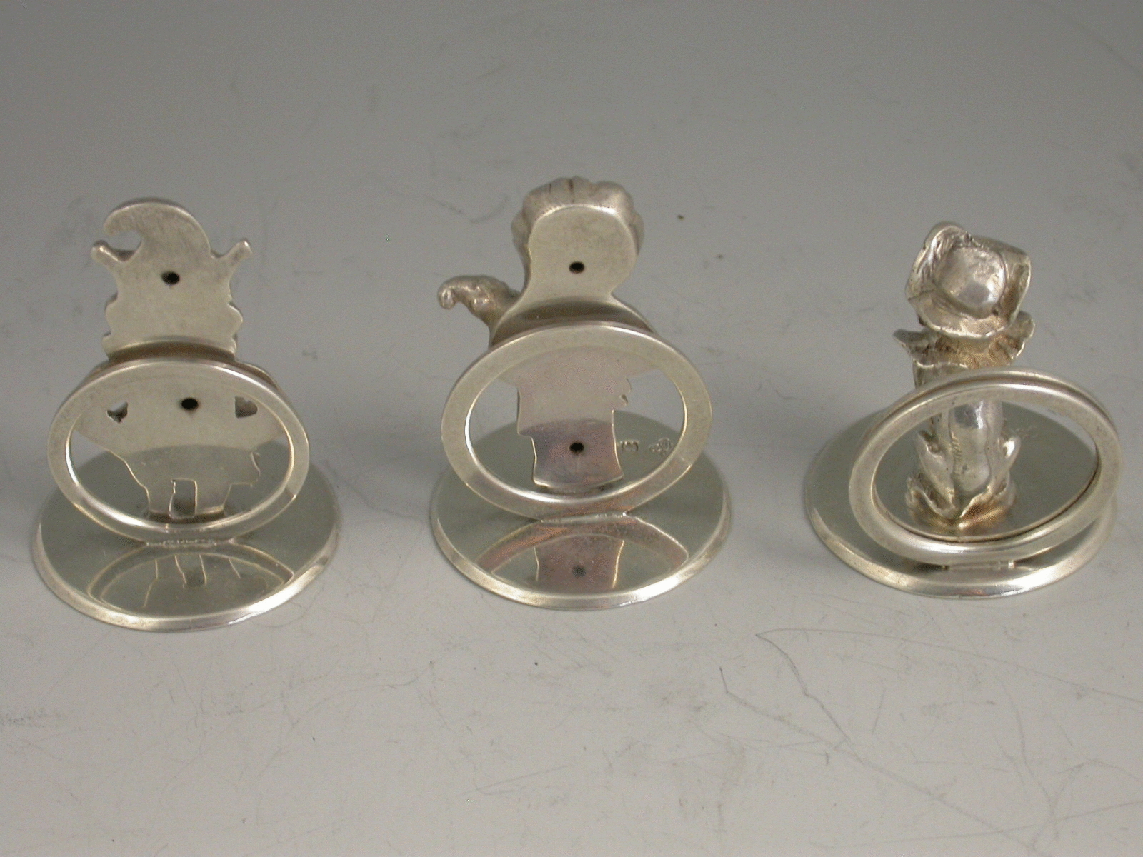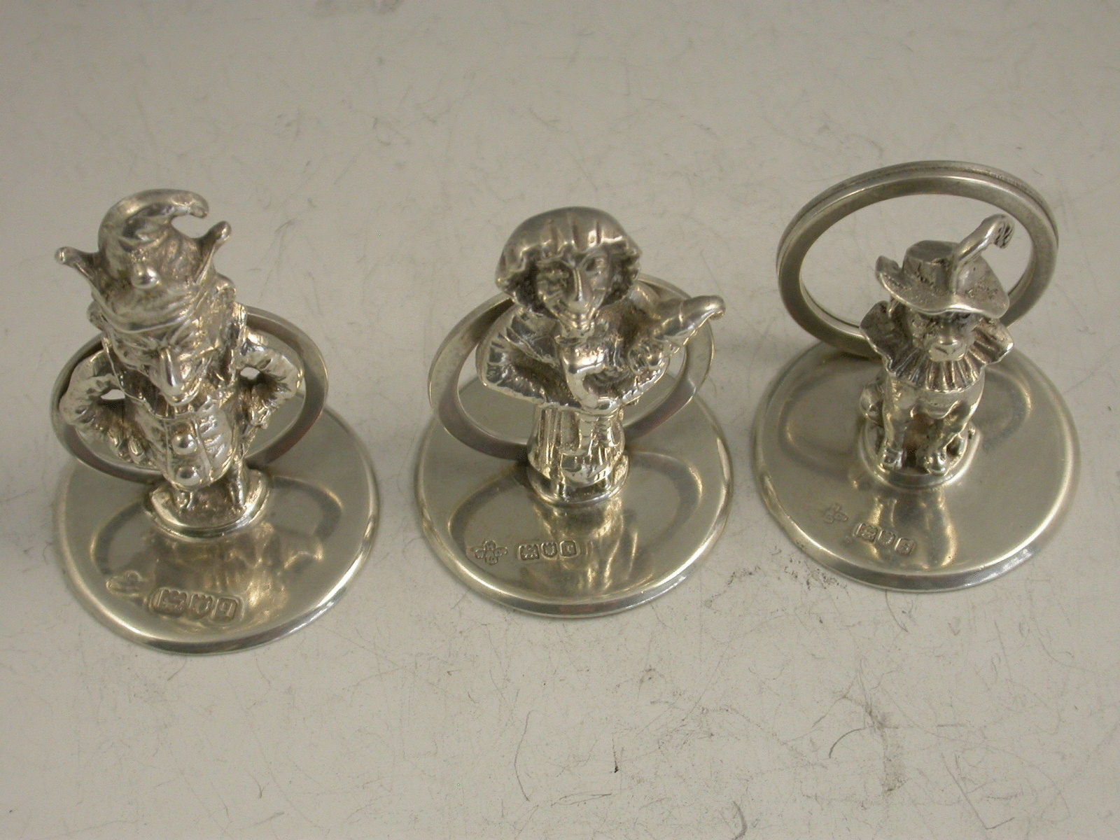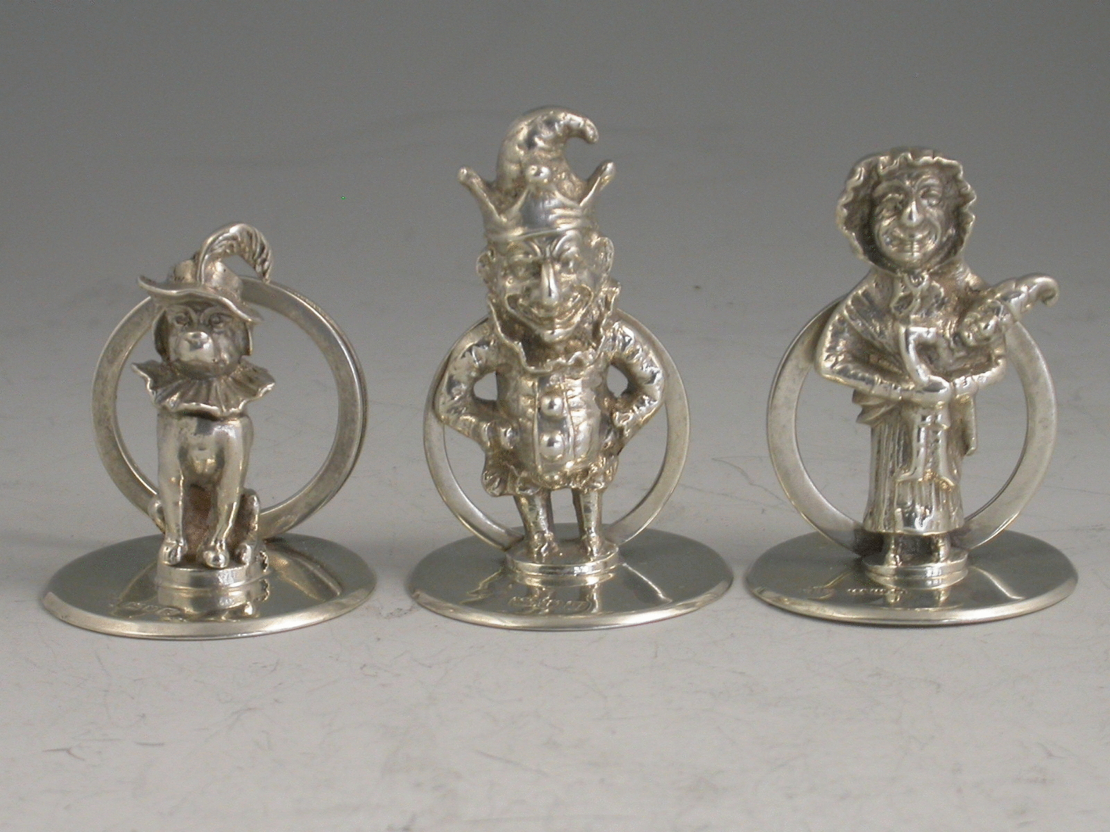 A very fine quality and rare set of three early 20th century novelty cast silver Menu Holders formed as Mr Punch, his wife Judy and Dog Toby, on plain circular bases.