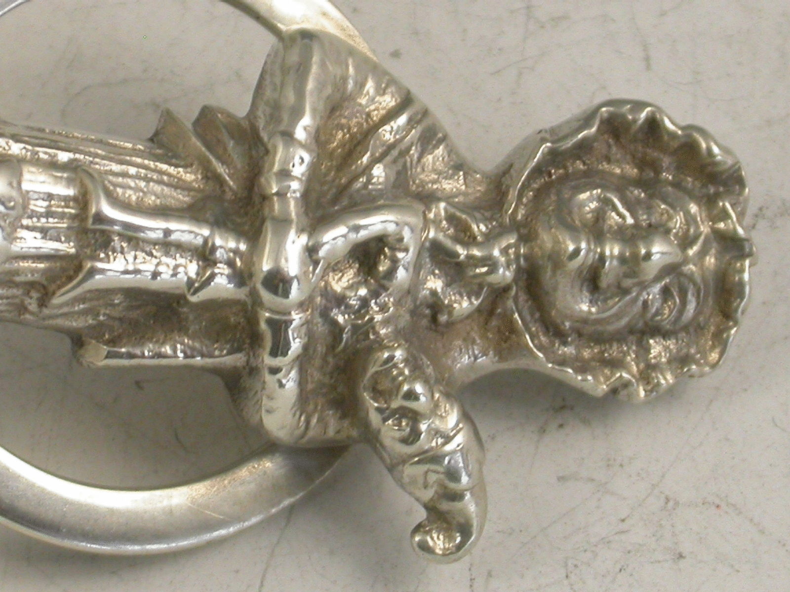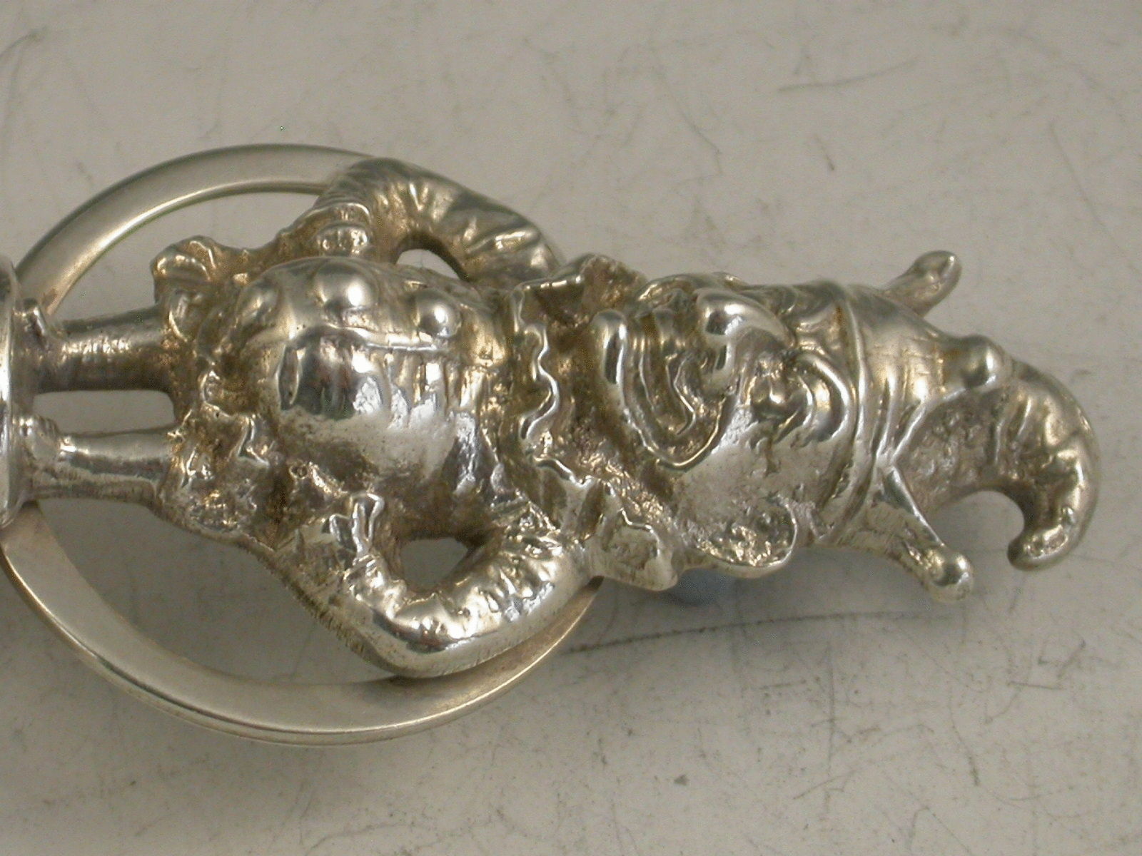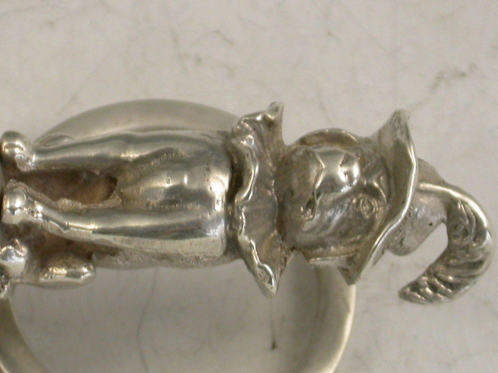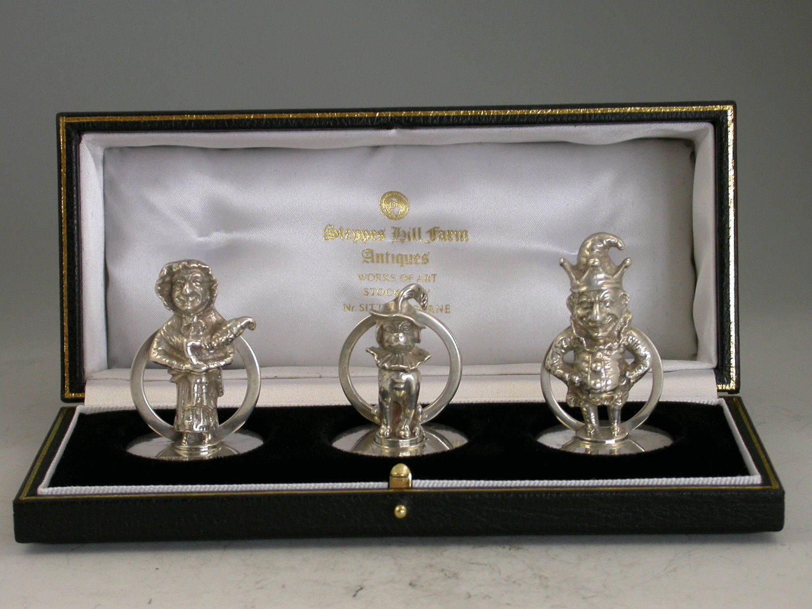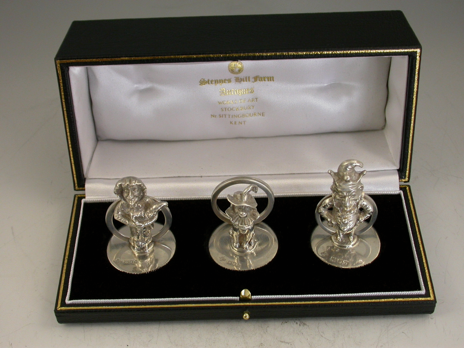 A very fine quality and rare set of three early 20th century novelty cast silver Menu Holders formed as Mr Punch, his wife Judy and Dog Toby, on plain circular bases.
