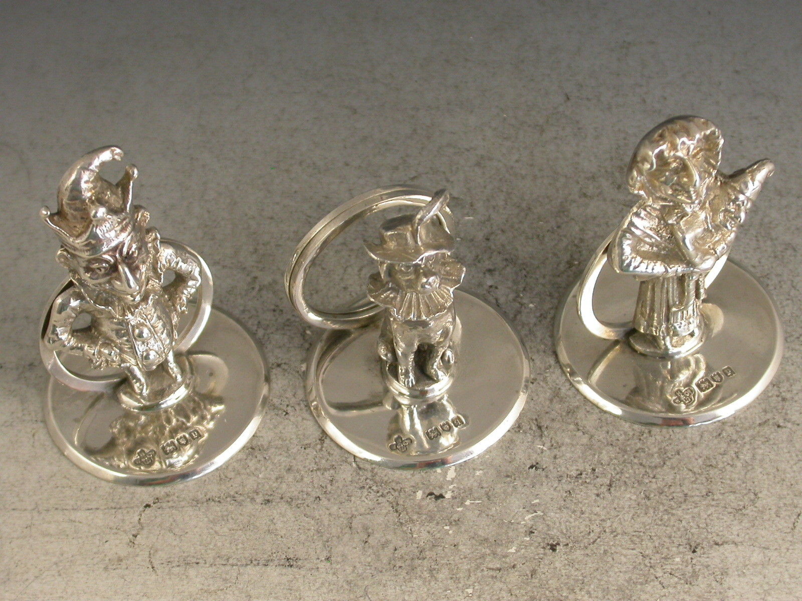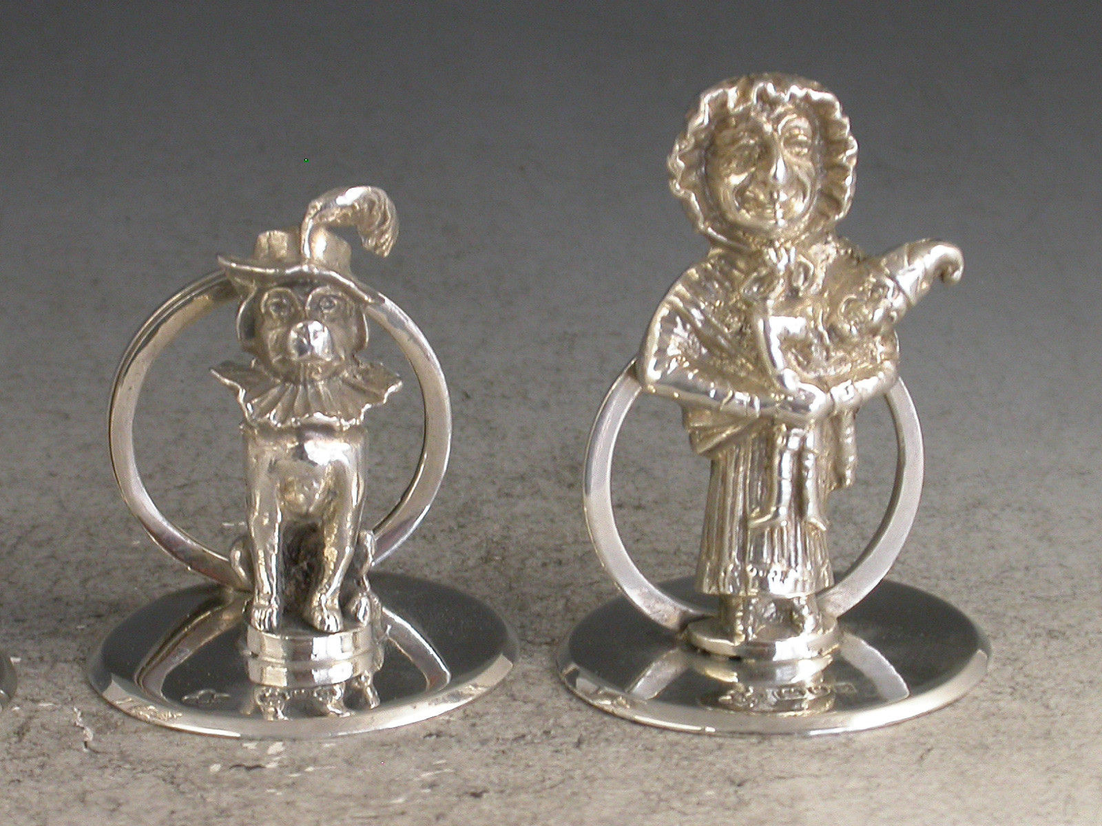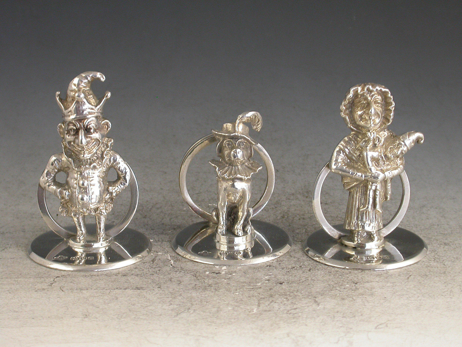 A fine quality and rare set three Edwardian cast silver Menu Holders formed as Mr Punch, his wife Judy and Dog Toby, on plain circular bases.