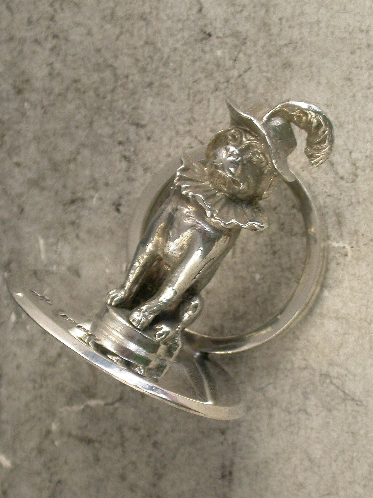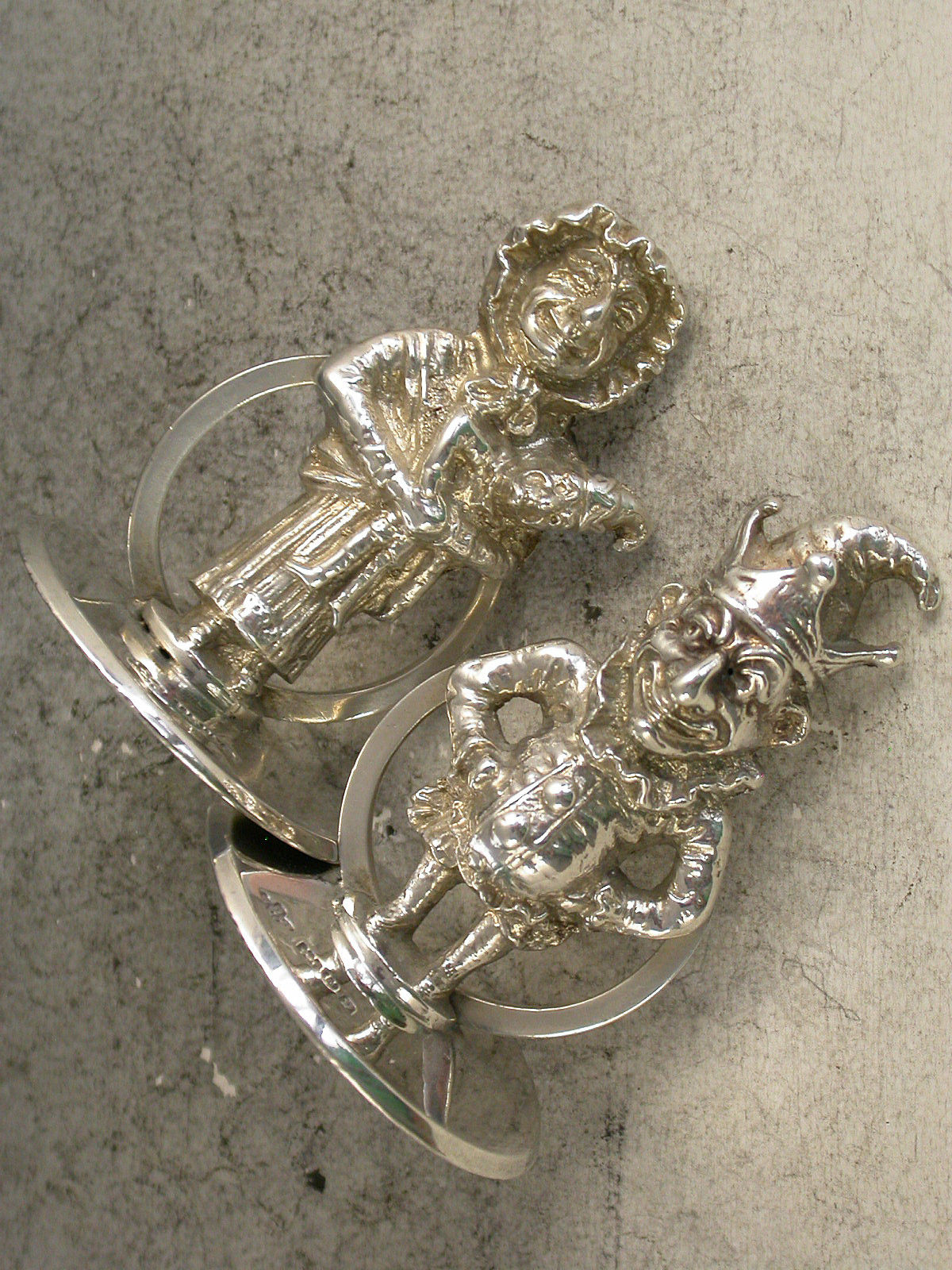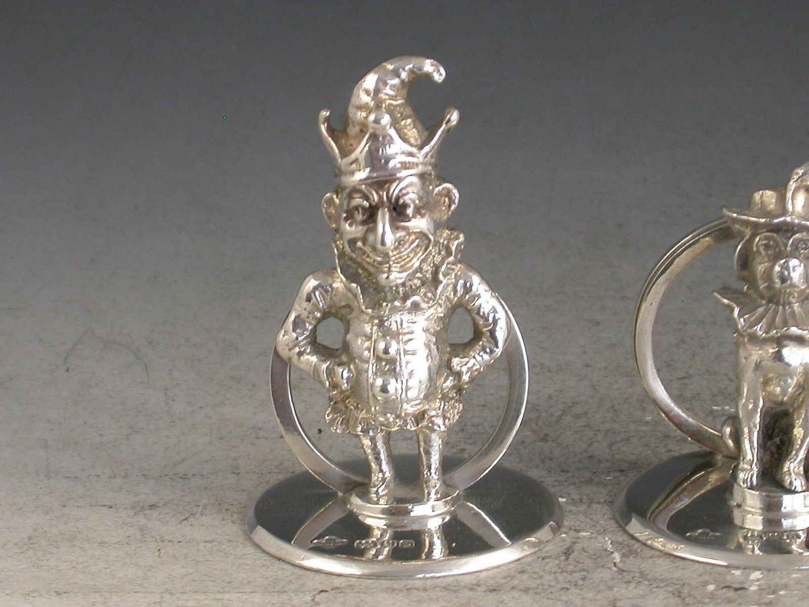 A fine quality and rare set three Edwardian cast silver Menu Holders formed as Mr Punch, his wife Judy and Dog Toby, on plain circular bases.