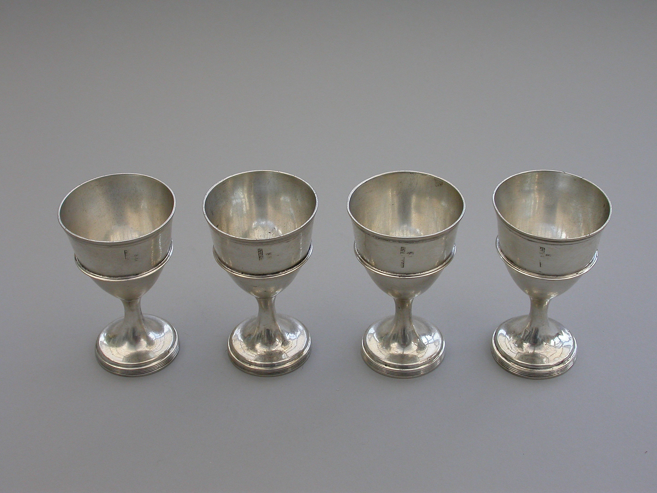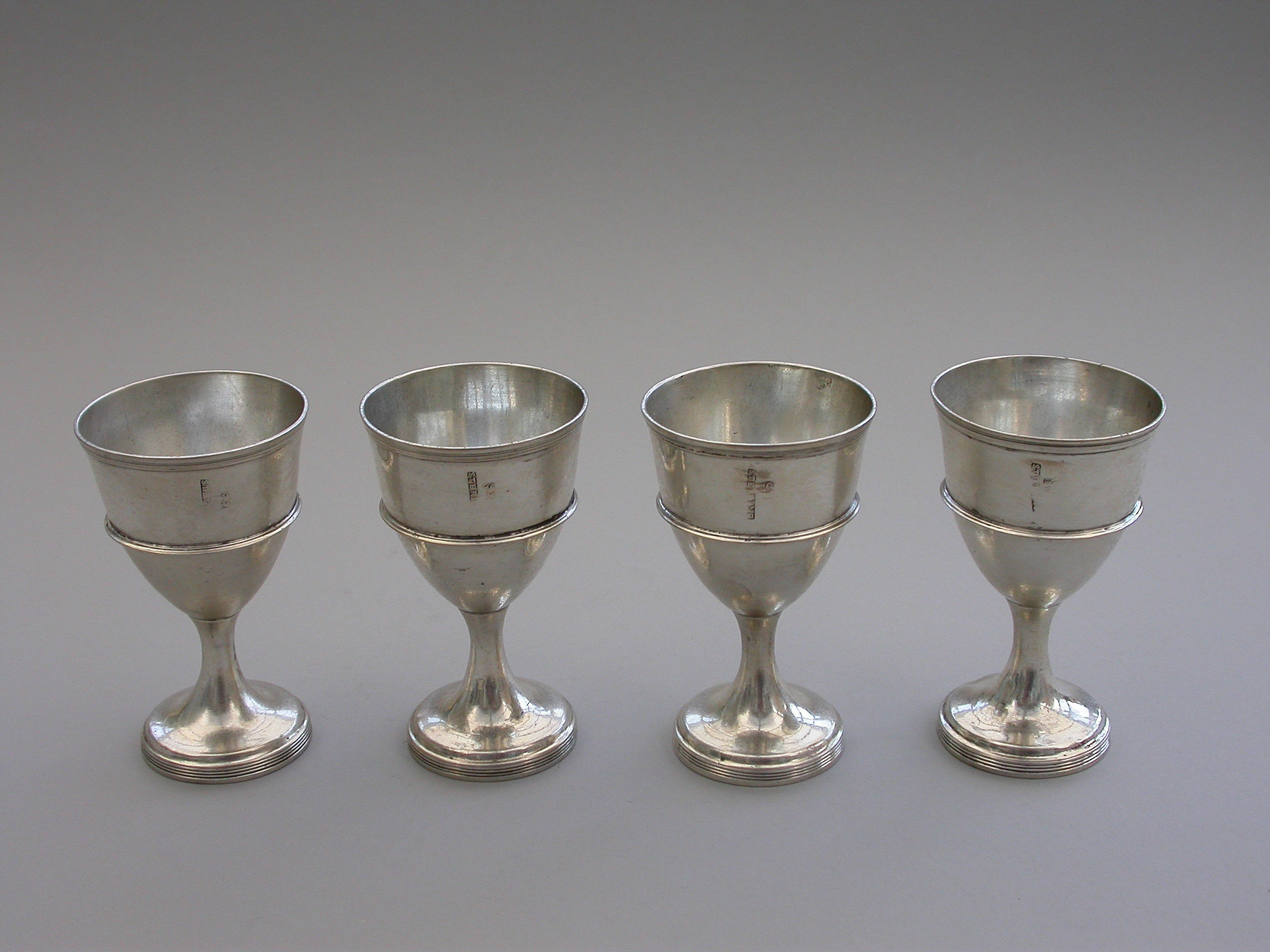 A rare set of four George III Irish Provincial Silver Egg Cups, of plain form with out-set reeded girdles and borders, raised on circular spreading pedestal bases with reeded rims.