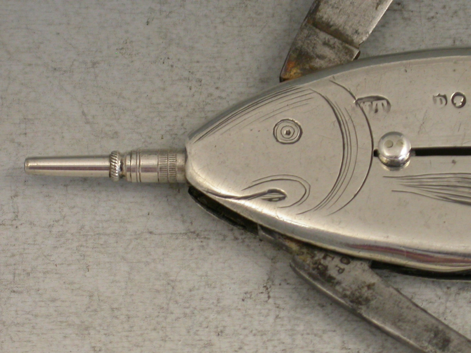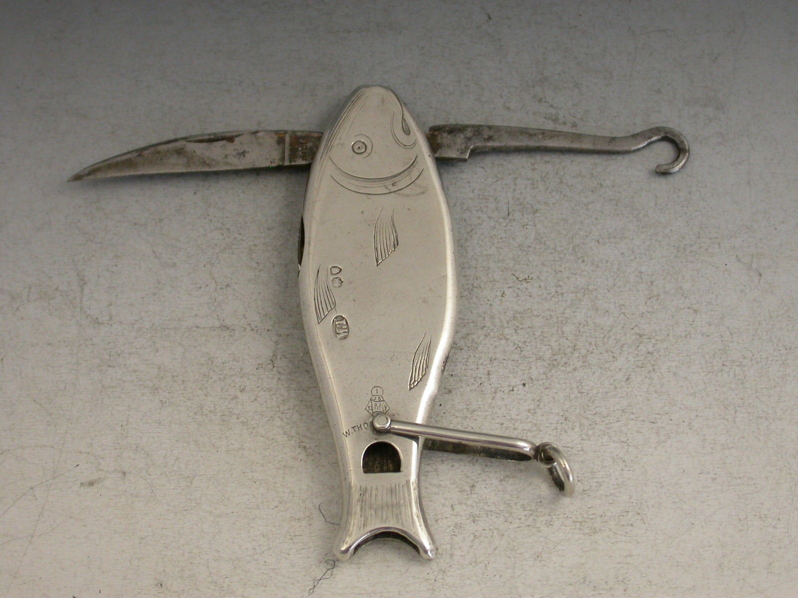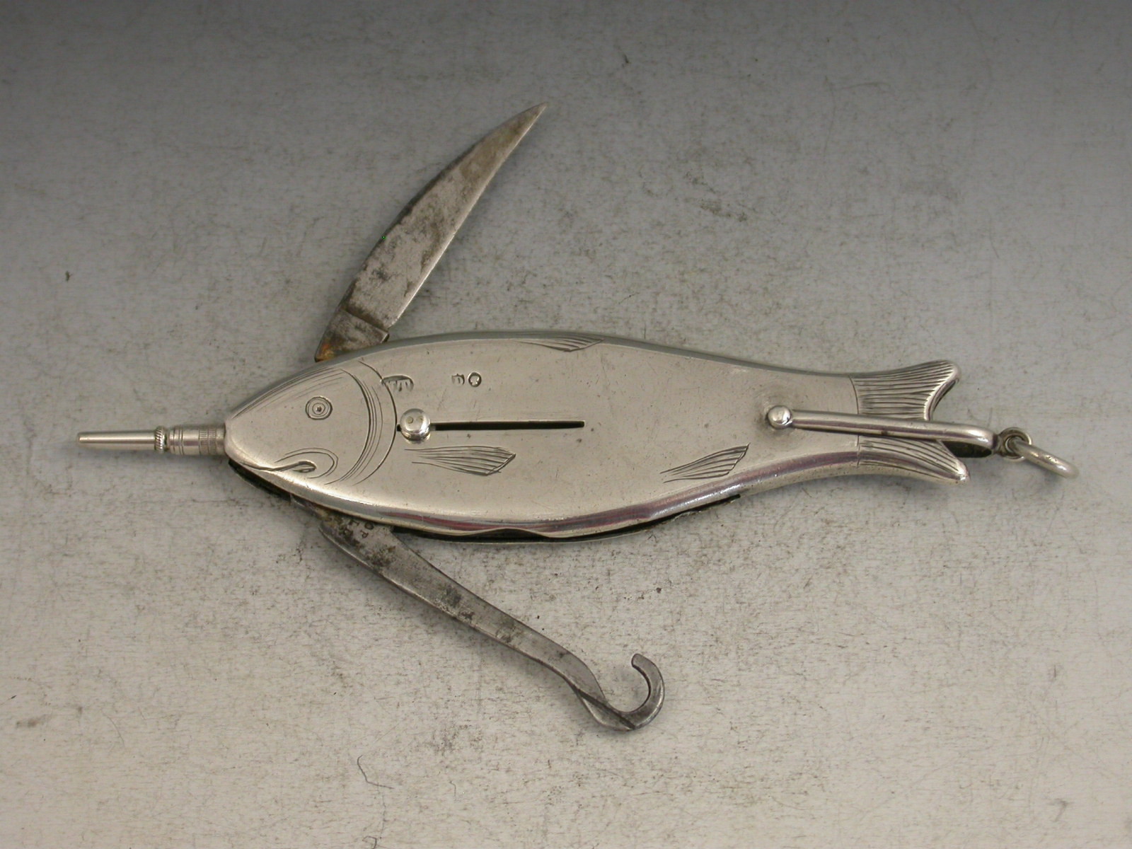 A rare Victorian silver Gentleman's Compendium made in the form of a fish with engraved fins and facial features, the body housing a slide out propelling pencil, a steel button hook and a pen knife, a whistle in the tail, attached stirrup shape suspension loop.