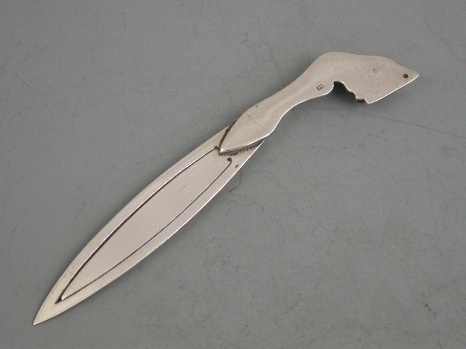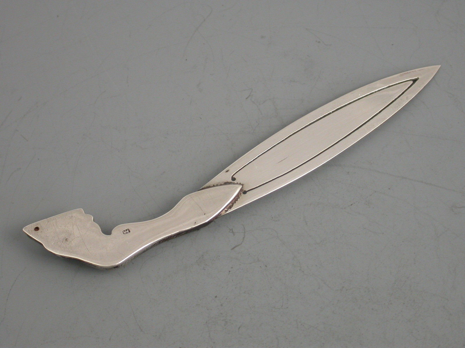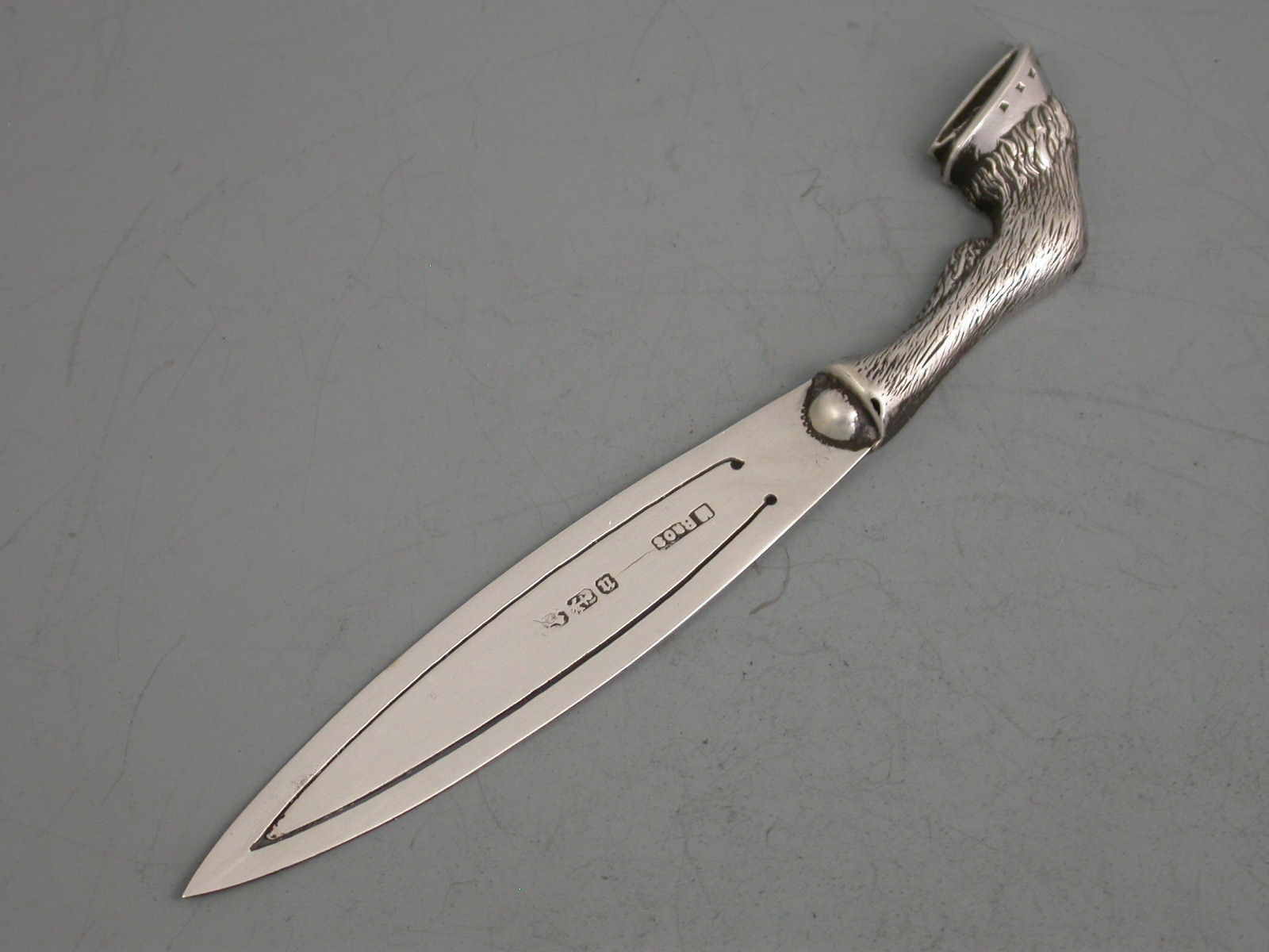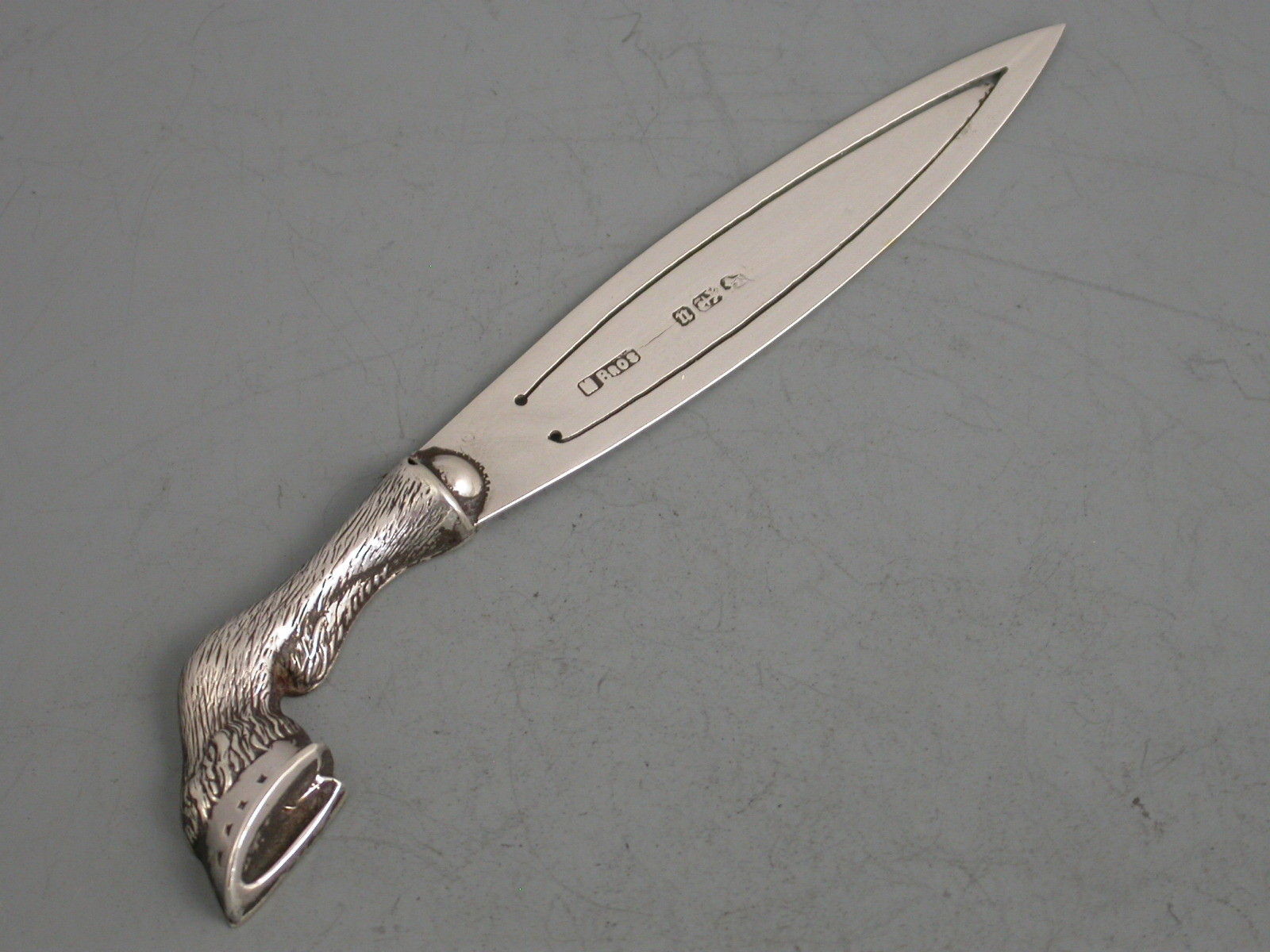 A rare Victorian silver Bookmark with dagger shaped blade, the handle formed as a Horses Hoof complete with horse shoe.