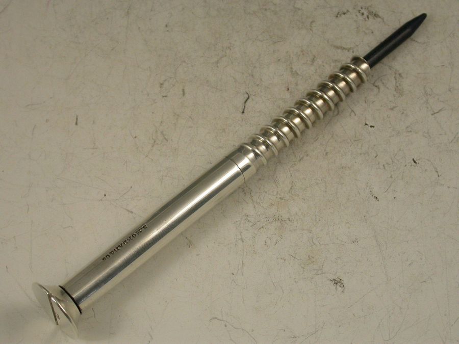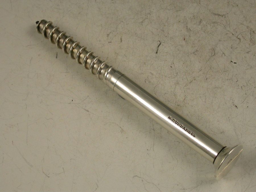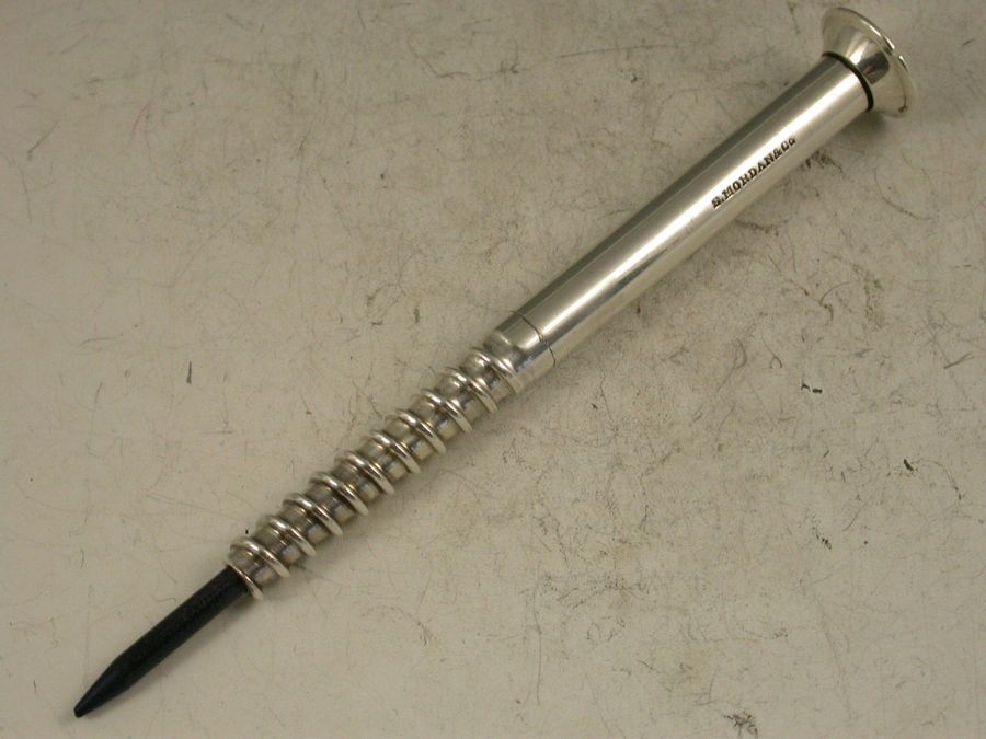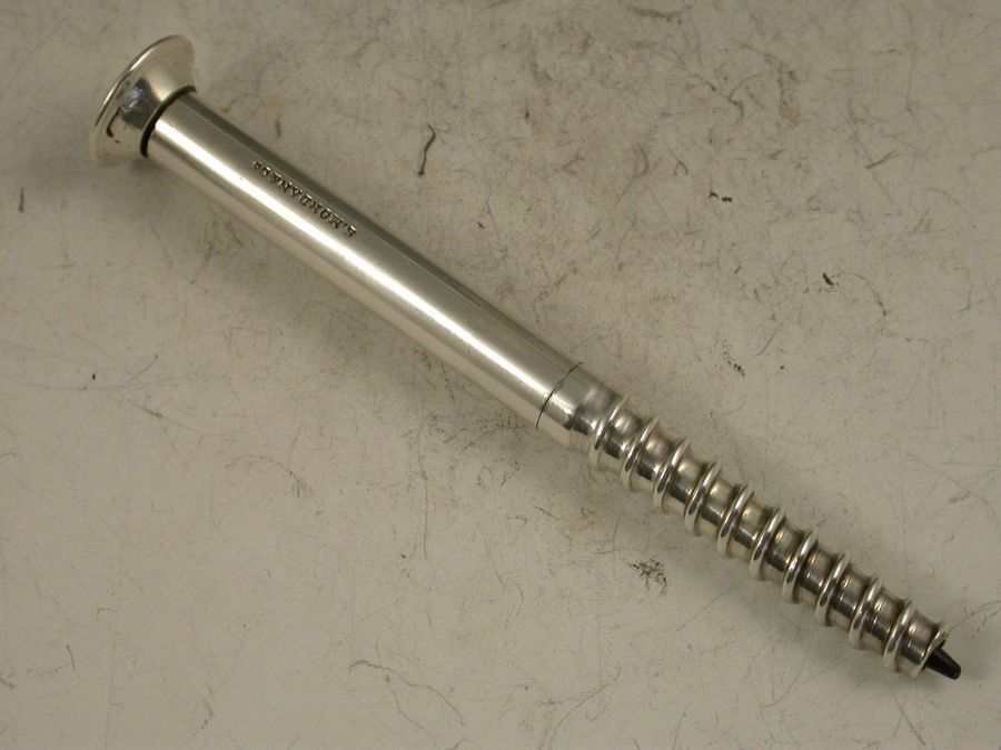An extremely rare Victorian novelty silver Propelling Pencil in the form of a large size wood screw. The large diameter lead propelling and (unusually) repelling by turning the head of the screw.